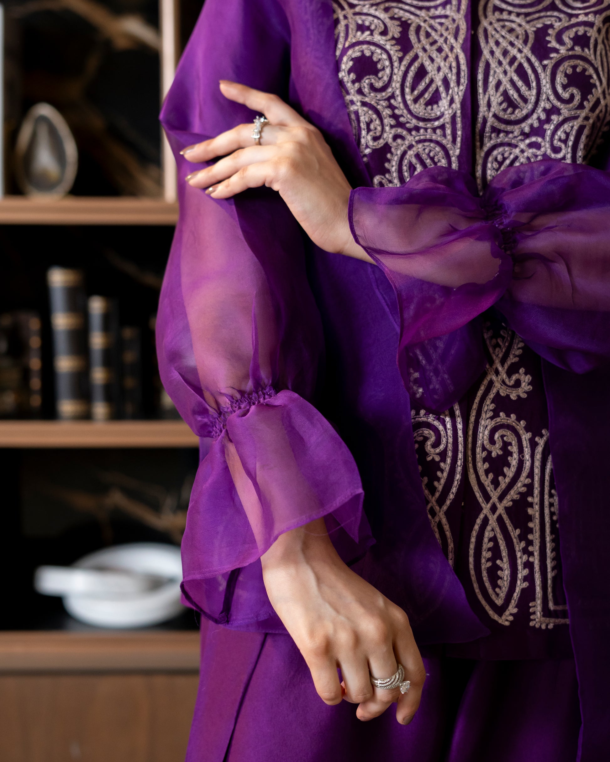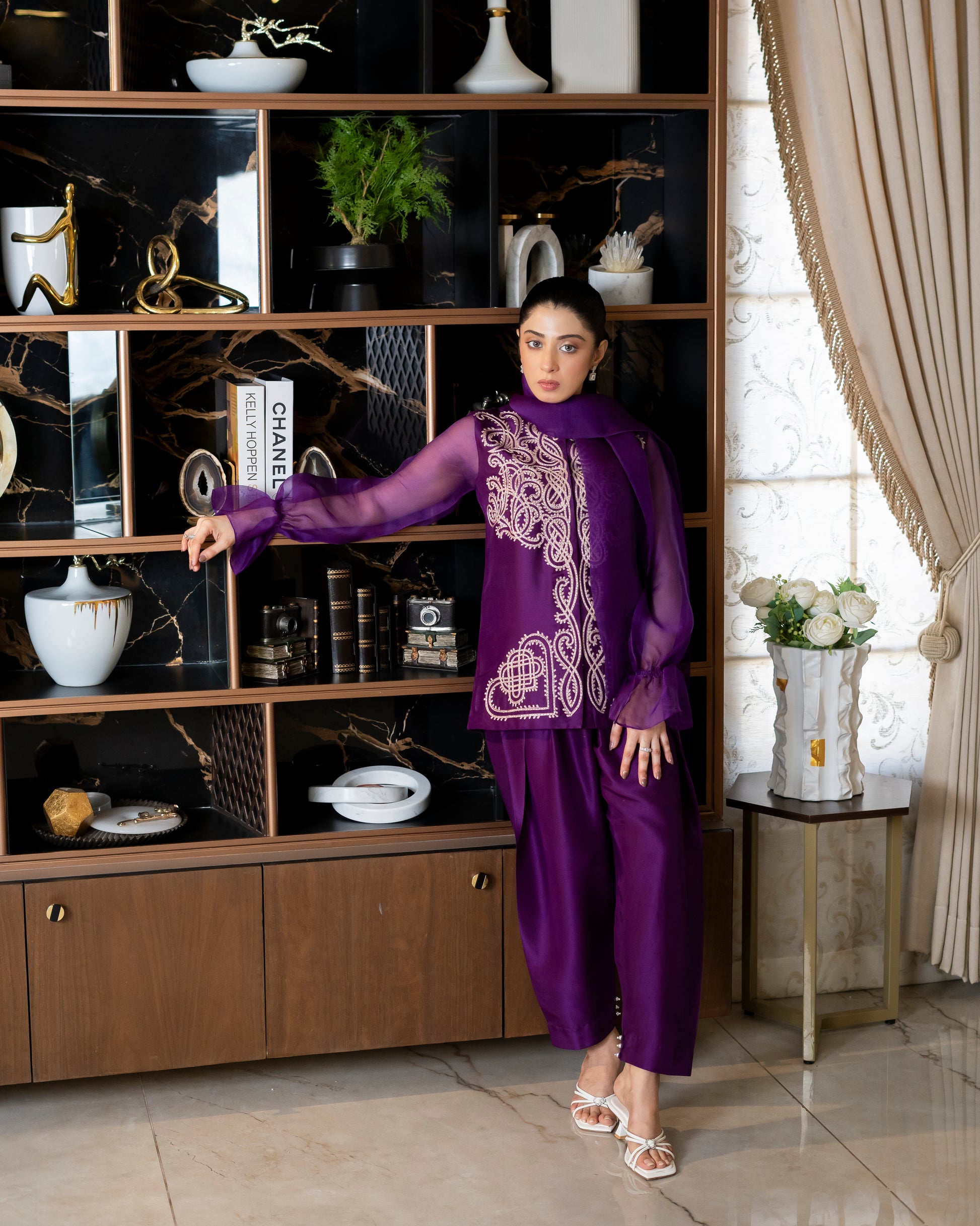 Embrace effortless sophistication with “Amethyst Grace,” a regal pure raw silk jacket and shalwar ensemble in a stunning purple hue. The tailored silk jacket, adorned with intricate embellishments adds a touch of modern luxury, while the classic silk shalwar ensures timeless elegance along with organza scarf This ensemble is the perfect fusion of tradition and contemporary style, making it ideal for formal occasions, festive celebrations, and evening gatherings.