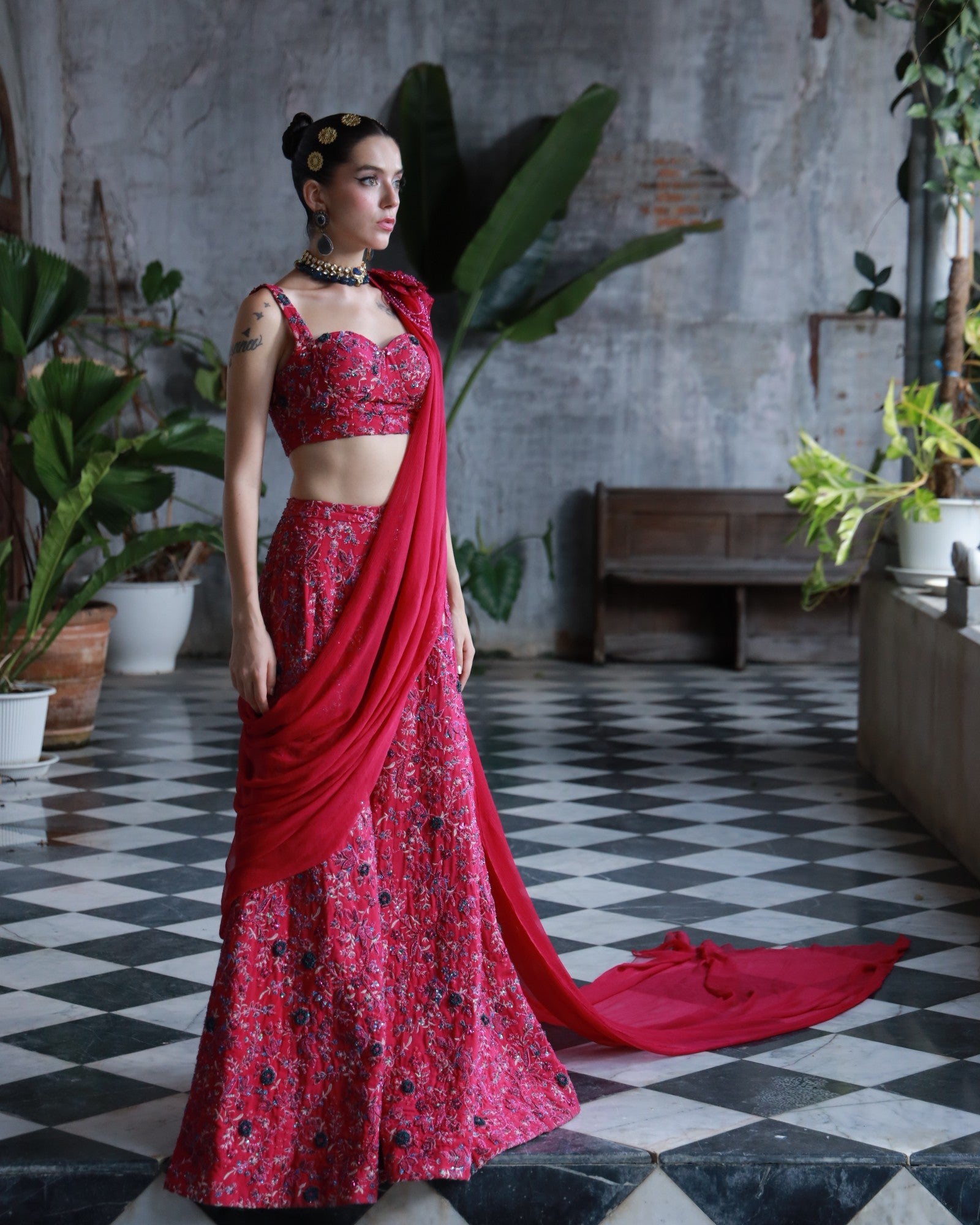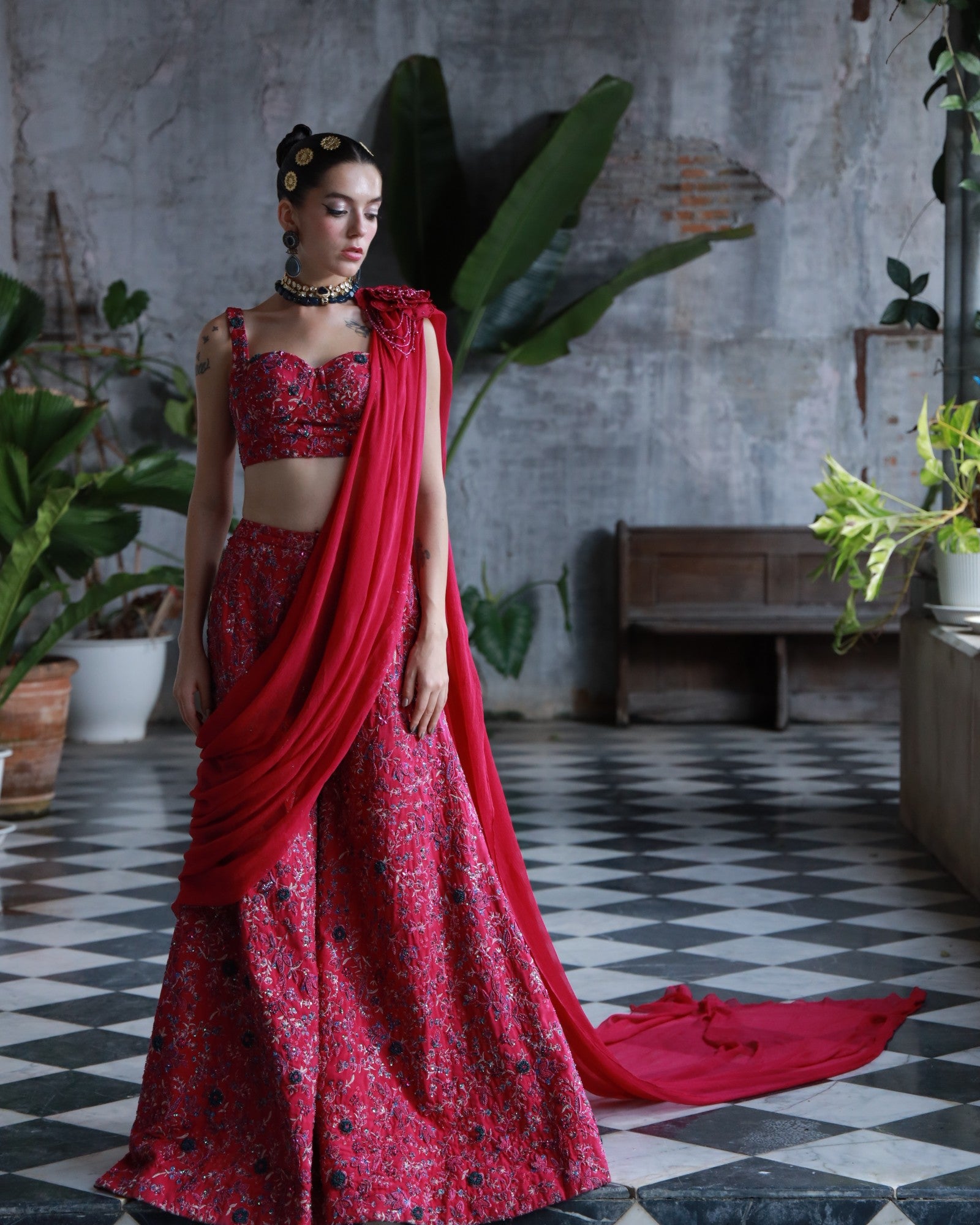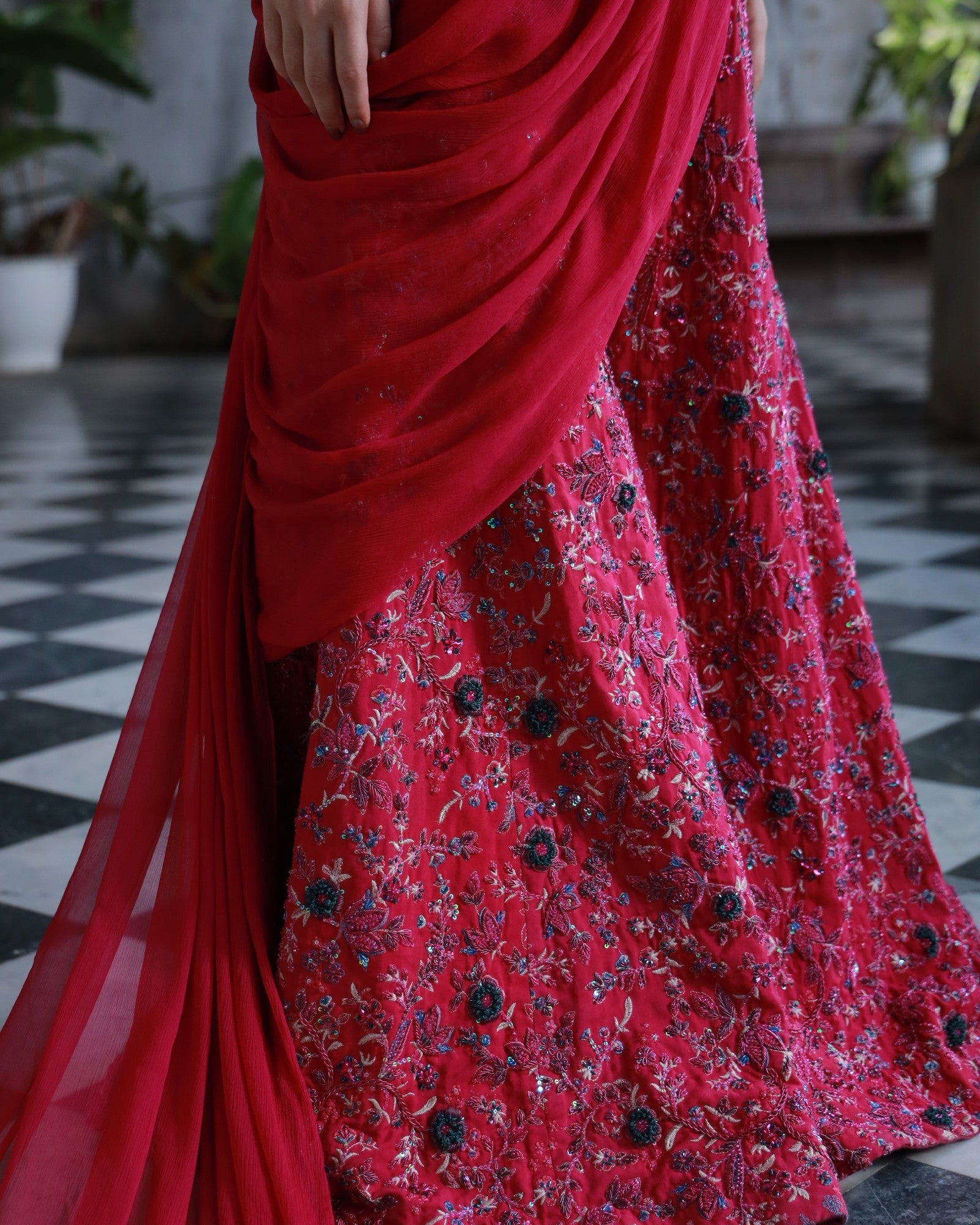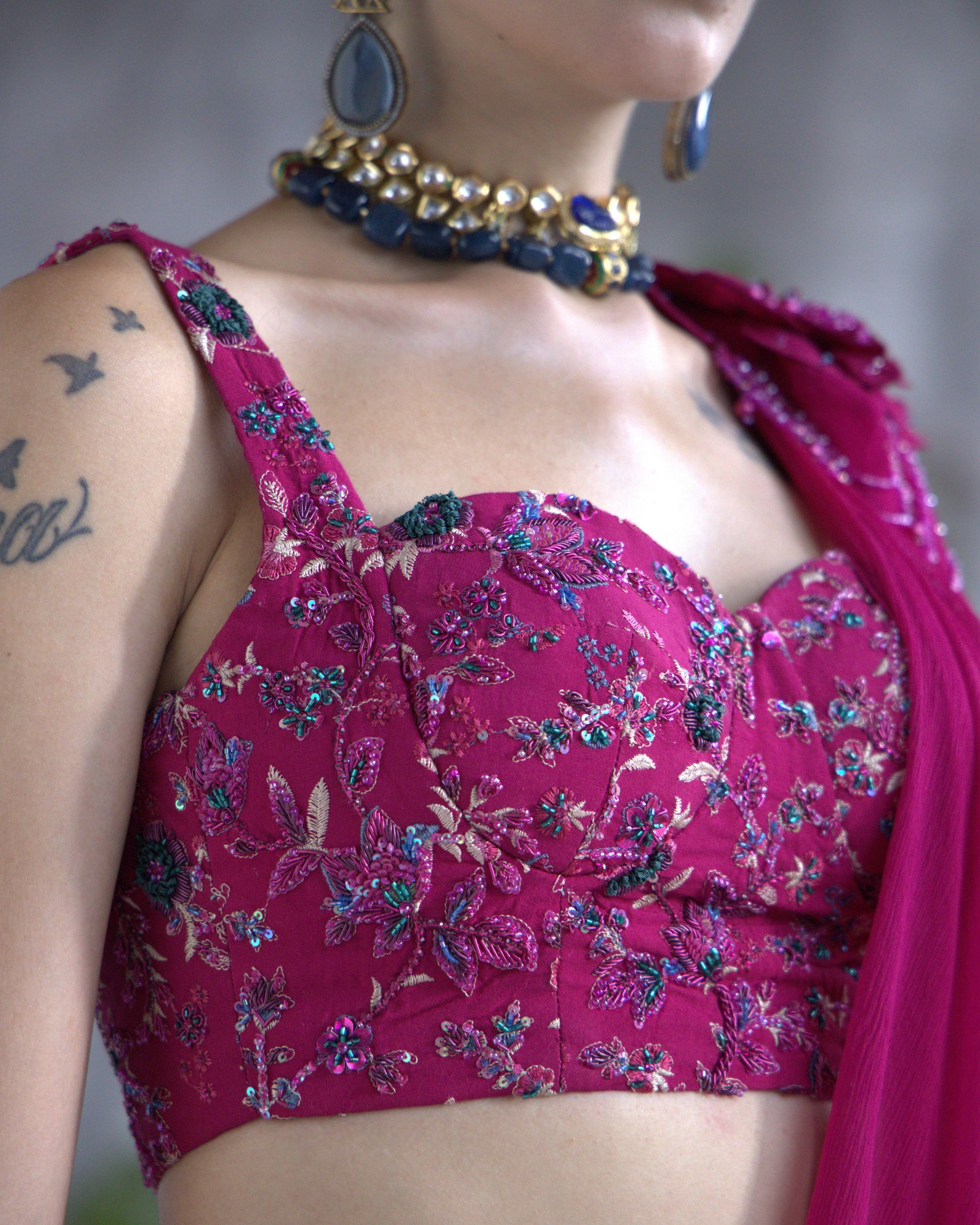 A bold embodiment of femininity in rich deep pink premium silk. This 3-piece hand-embroidered set features jewel-toned threadwork and delicate floral motifs, elevated with a statement shoulder drape and structured blouse.