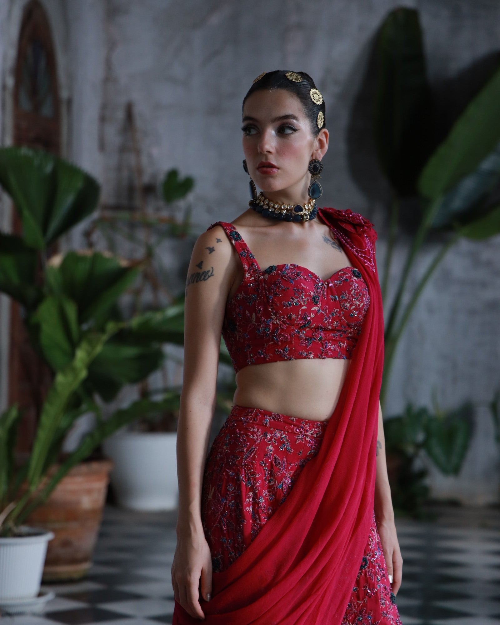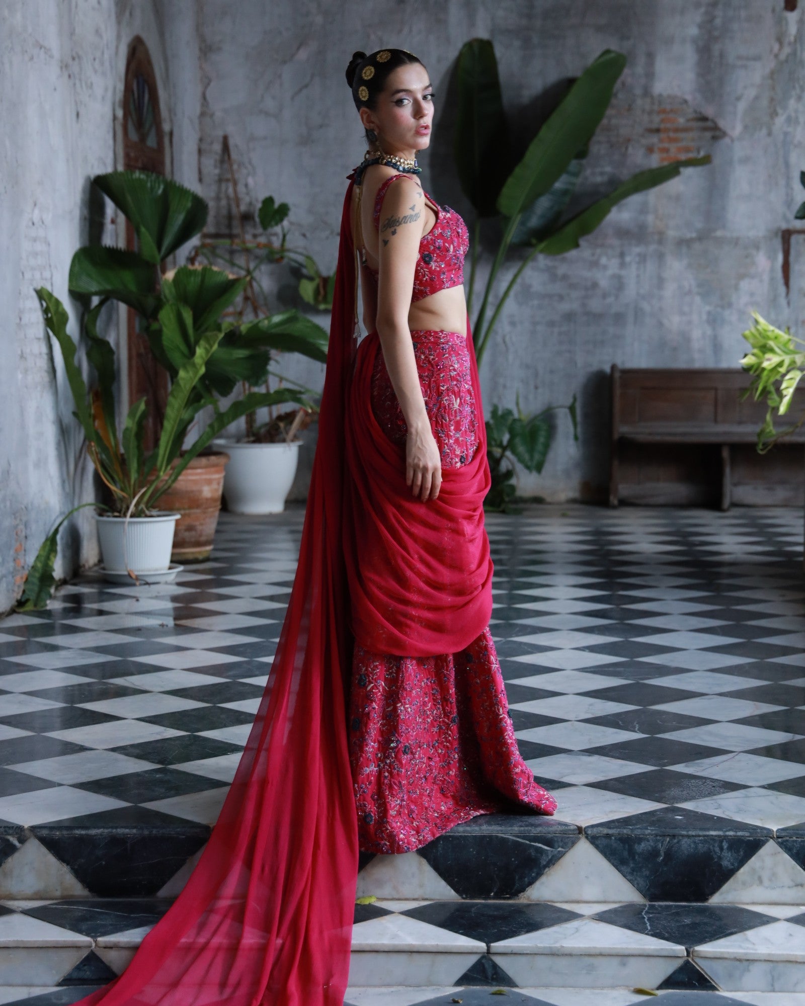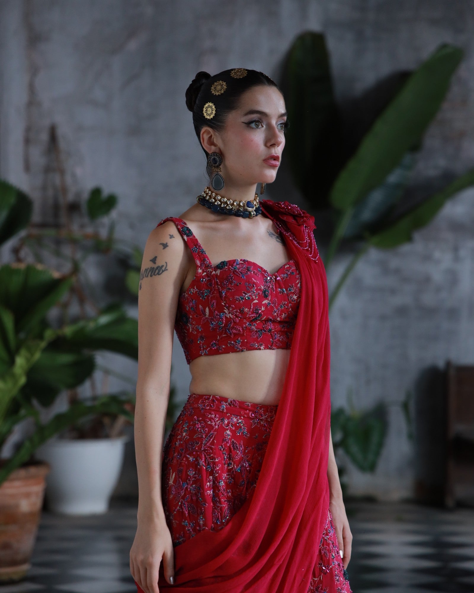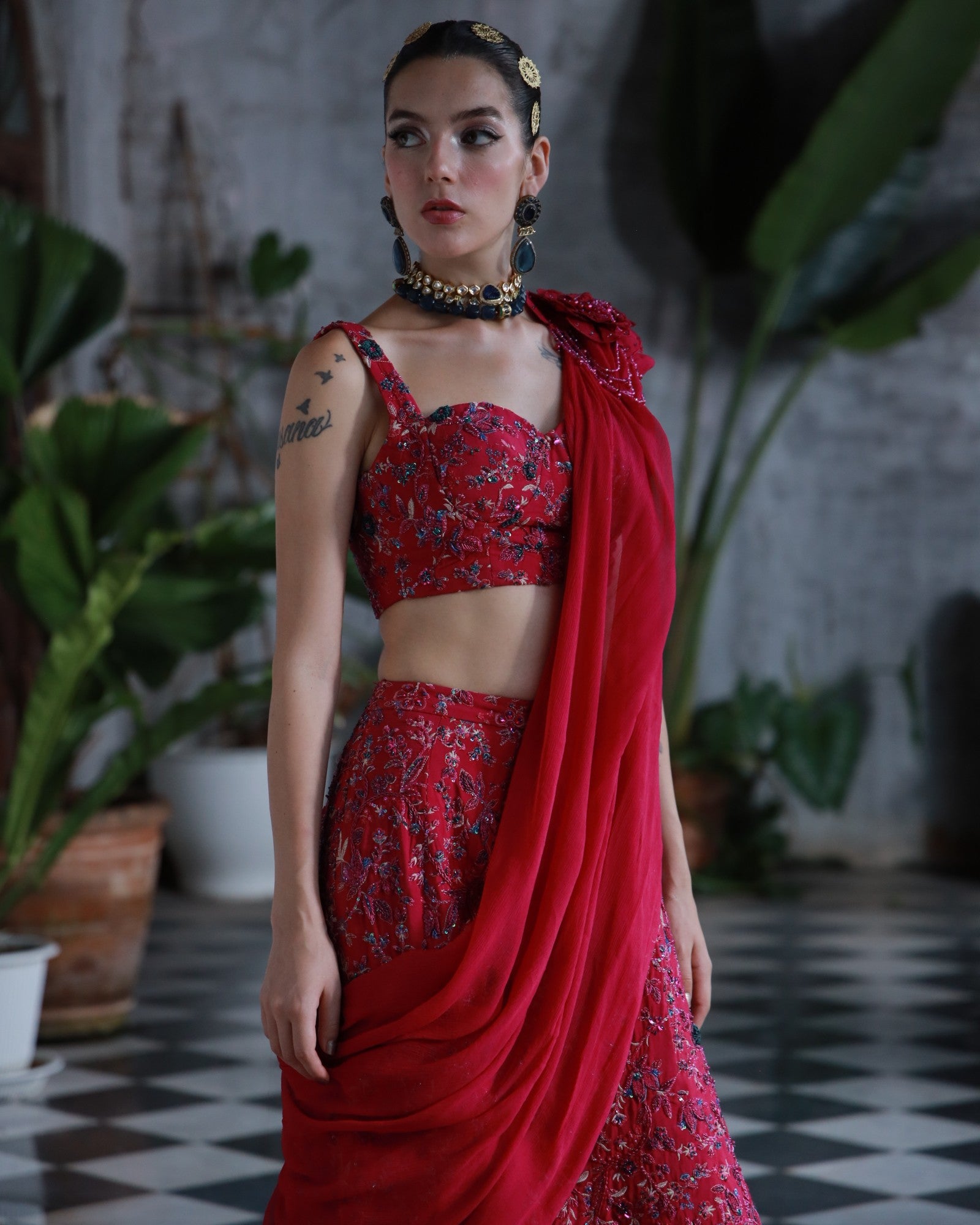 A bold embodiment of femininity in rich deep pink premium silk. This 3-piece hand-embroidered set features jewel-toned threadwork and delicate floral motifs, elevated with a statement shoulder drape and structured blouse.