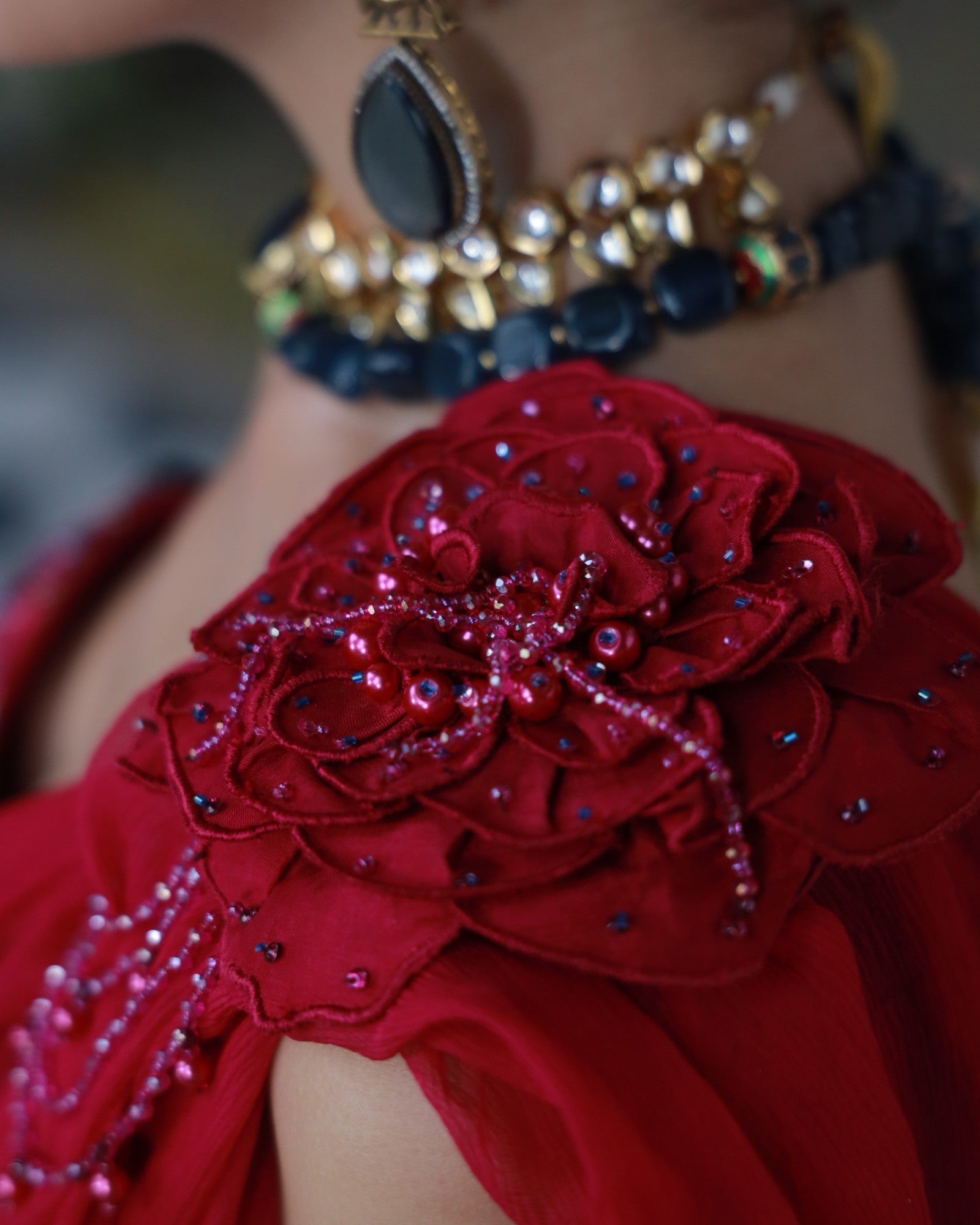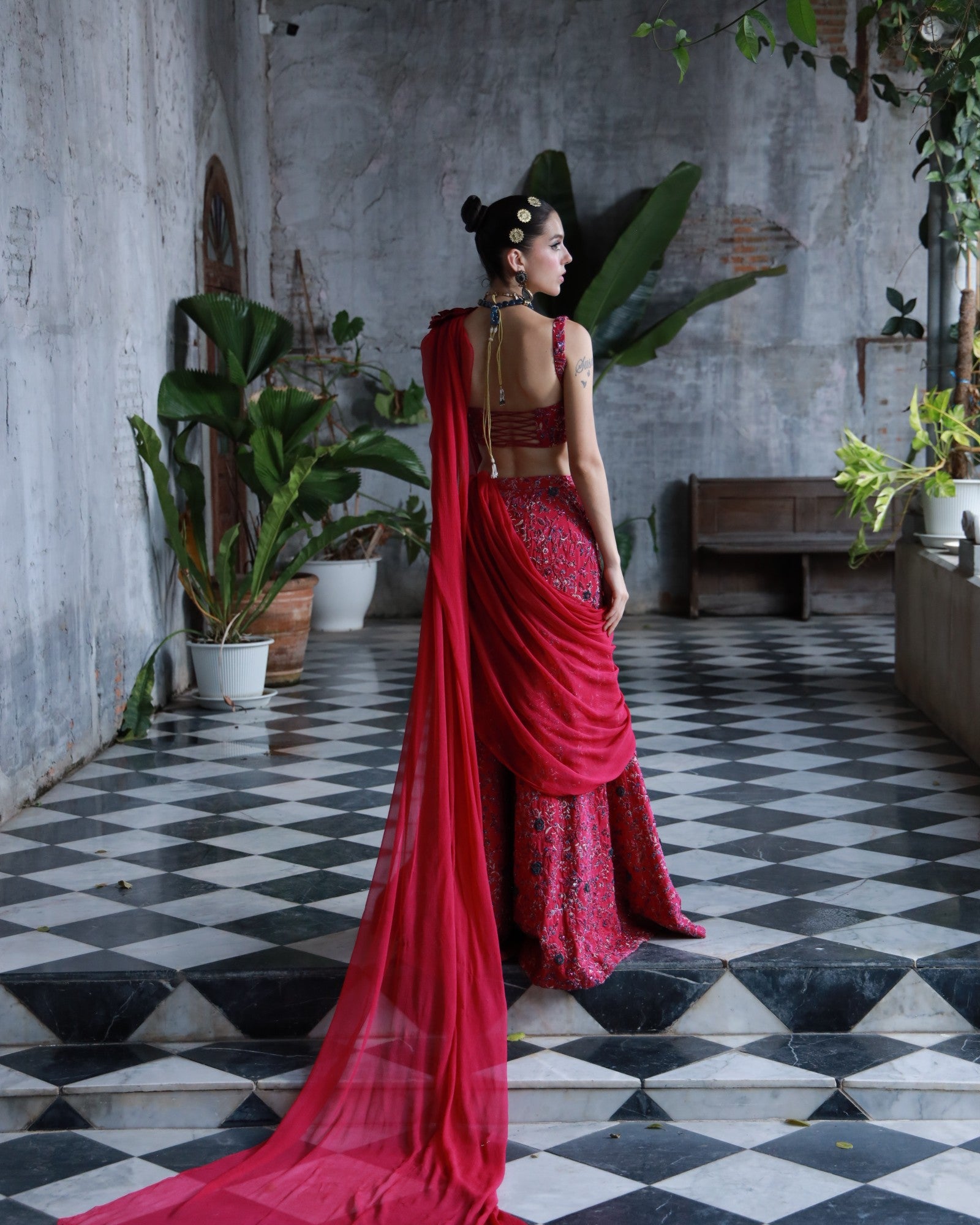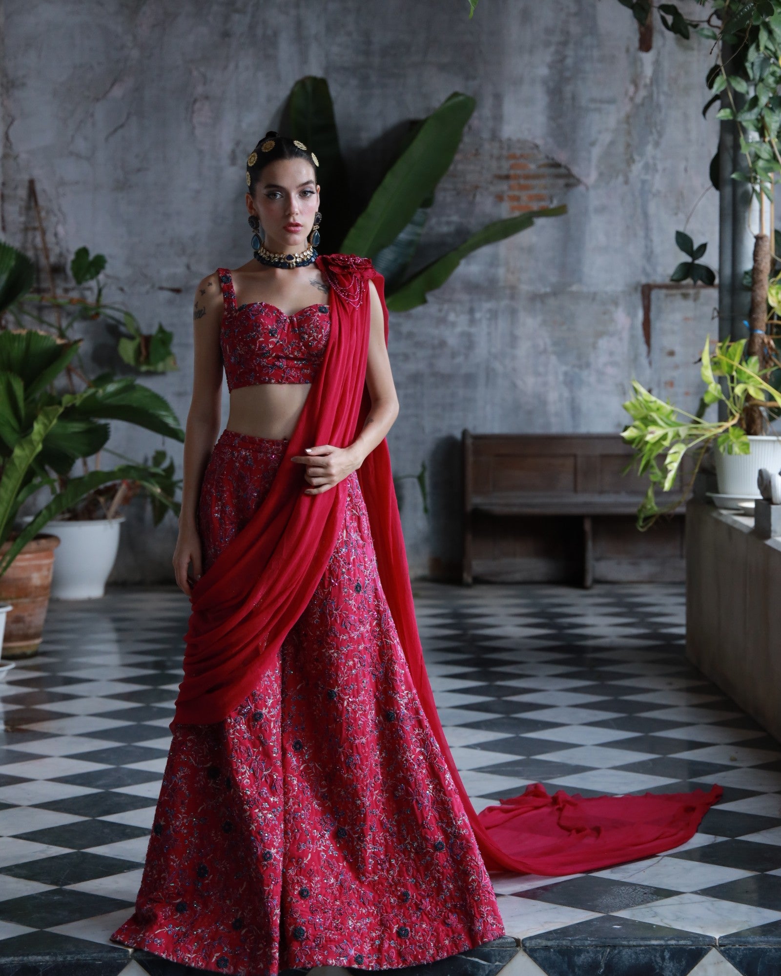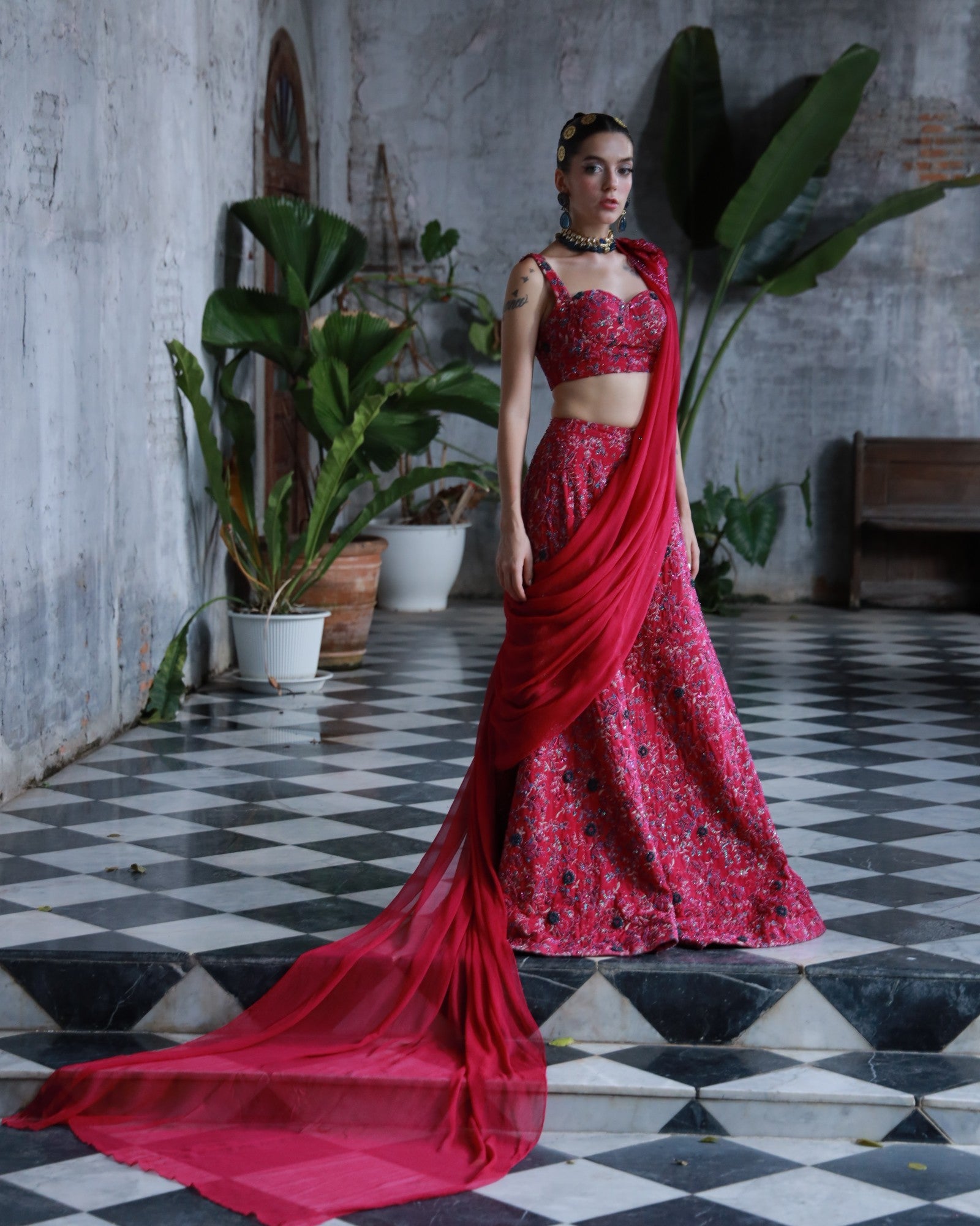 A bold embodiment of femininity in rich deep pink premium silk. This 3-piece hand-embroidered set features jewel-toned threadwork and delicate floral motifs, elevated with a statement shoulder drape and structured blouse.