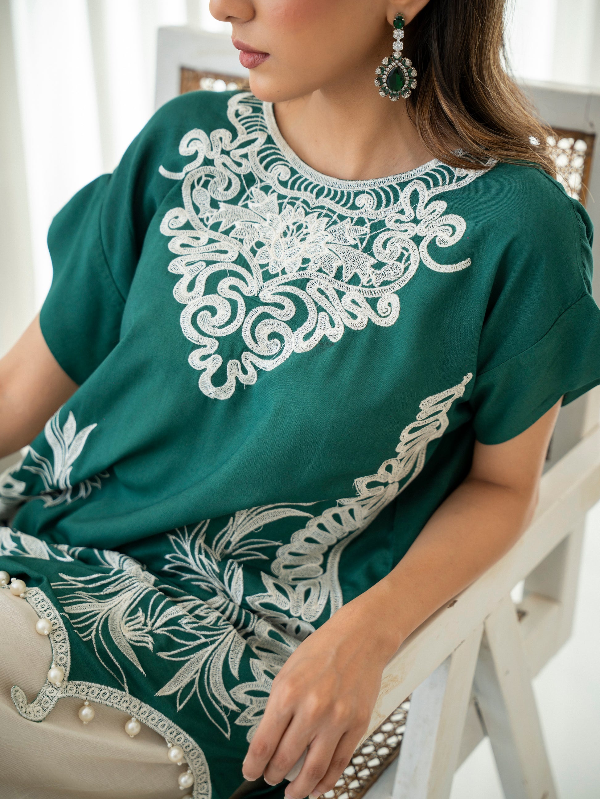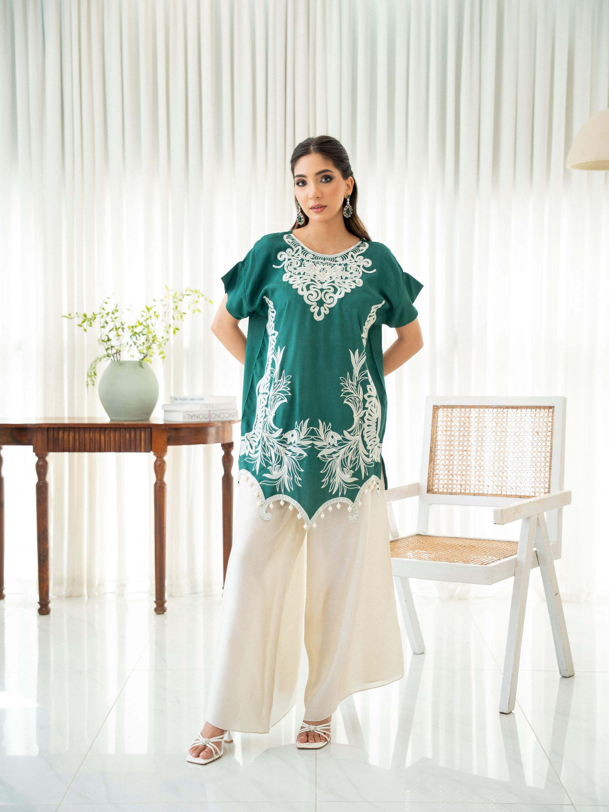 A chic 2-piece set in rich khaadi silk, Azure Crest features an elegant teal base adorned with intricate ivory embroidery. The scalloped hem with pearl accents adds a playful yet refined touch, perfectly paired with wide-leg ivory trousers for a fresh, modern silhouette.