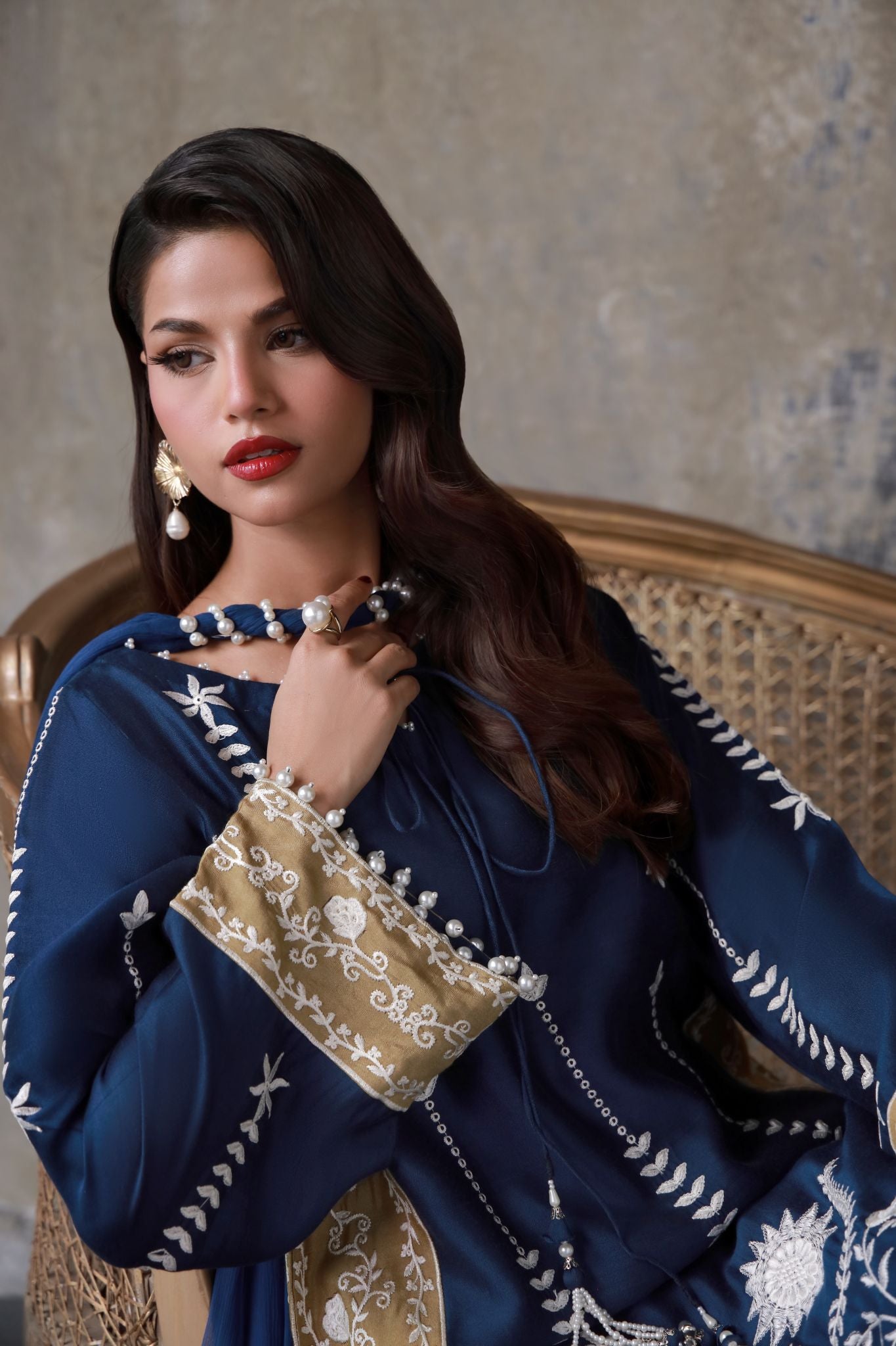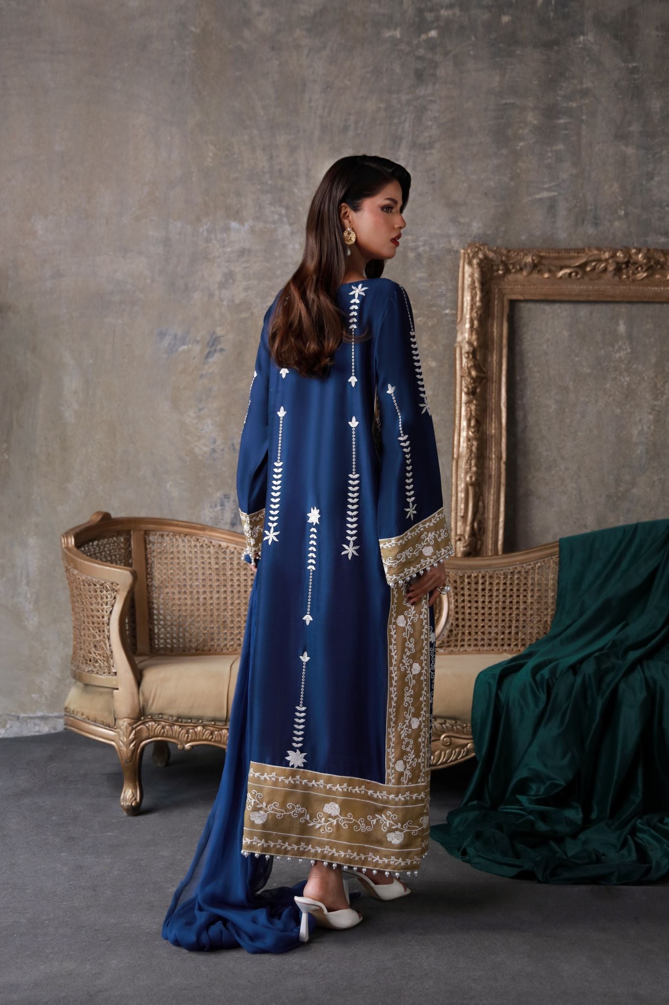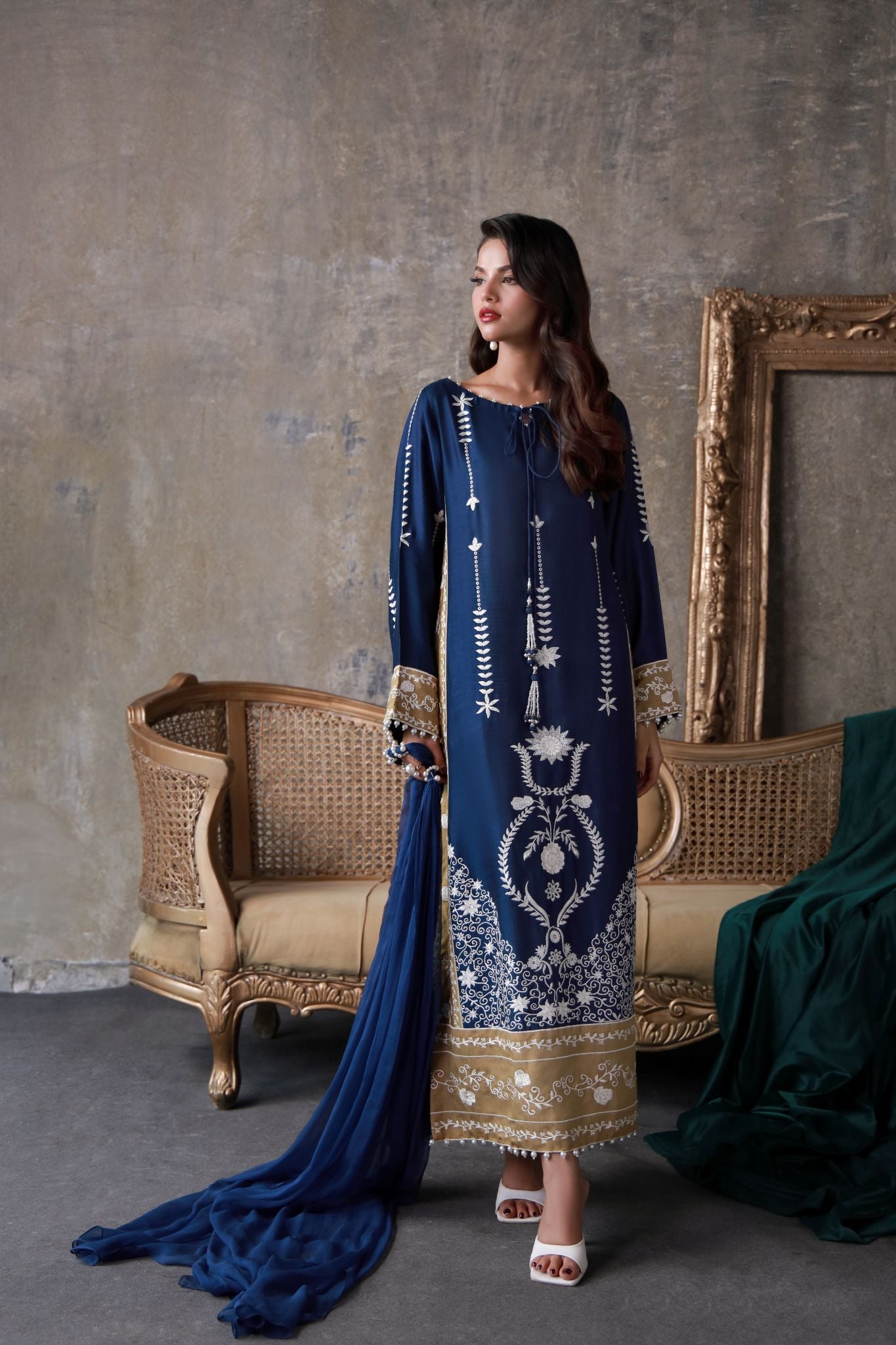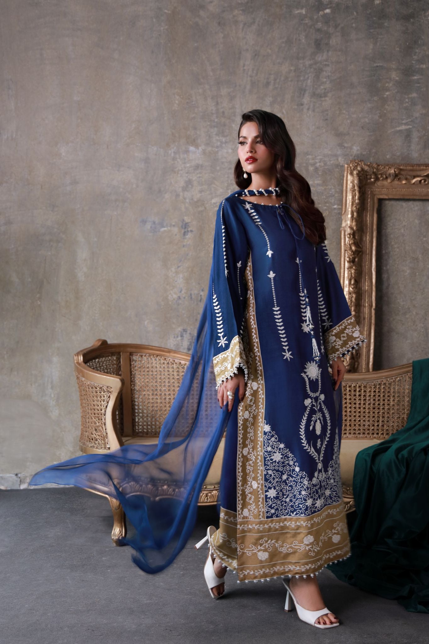 An opulent sapphire-toned creation adorned with antique gold edging and ivory threadwork. Crafted in luminous silk and paired with a delicately draped chiffon dupatta, it radiates festive grace and regality.