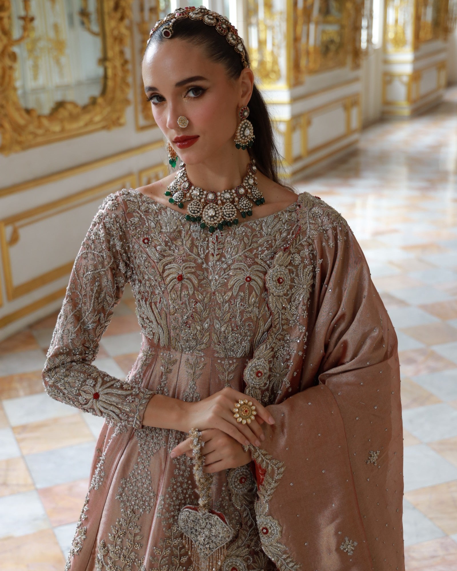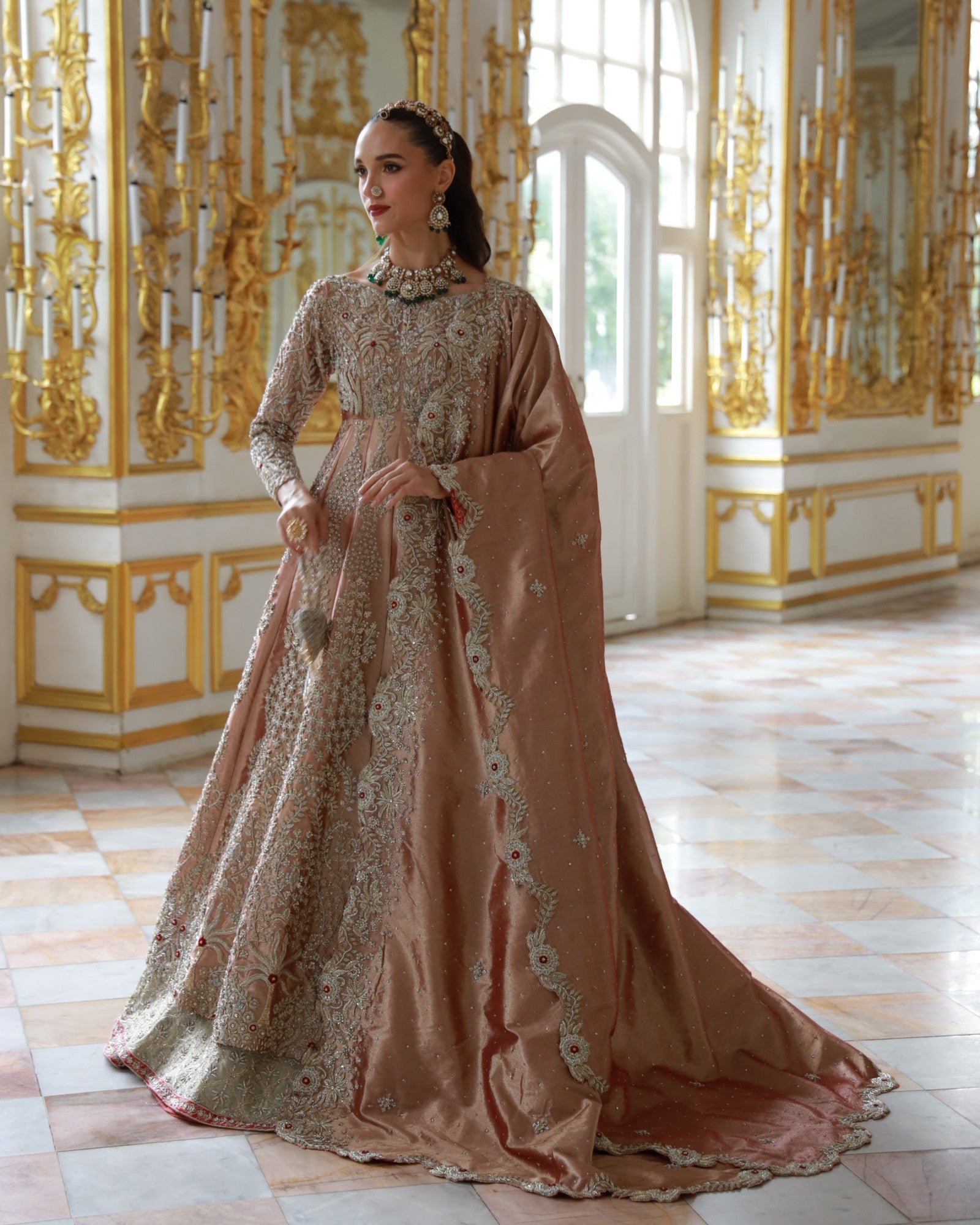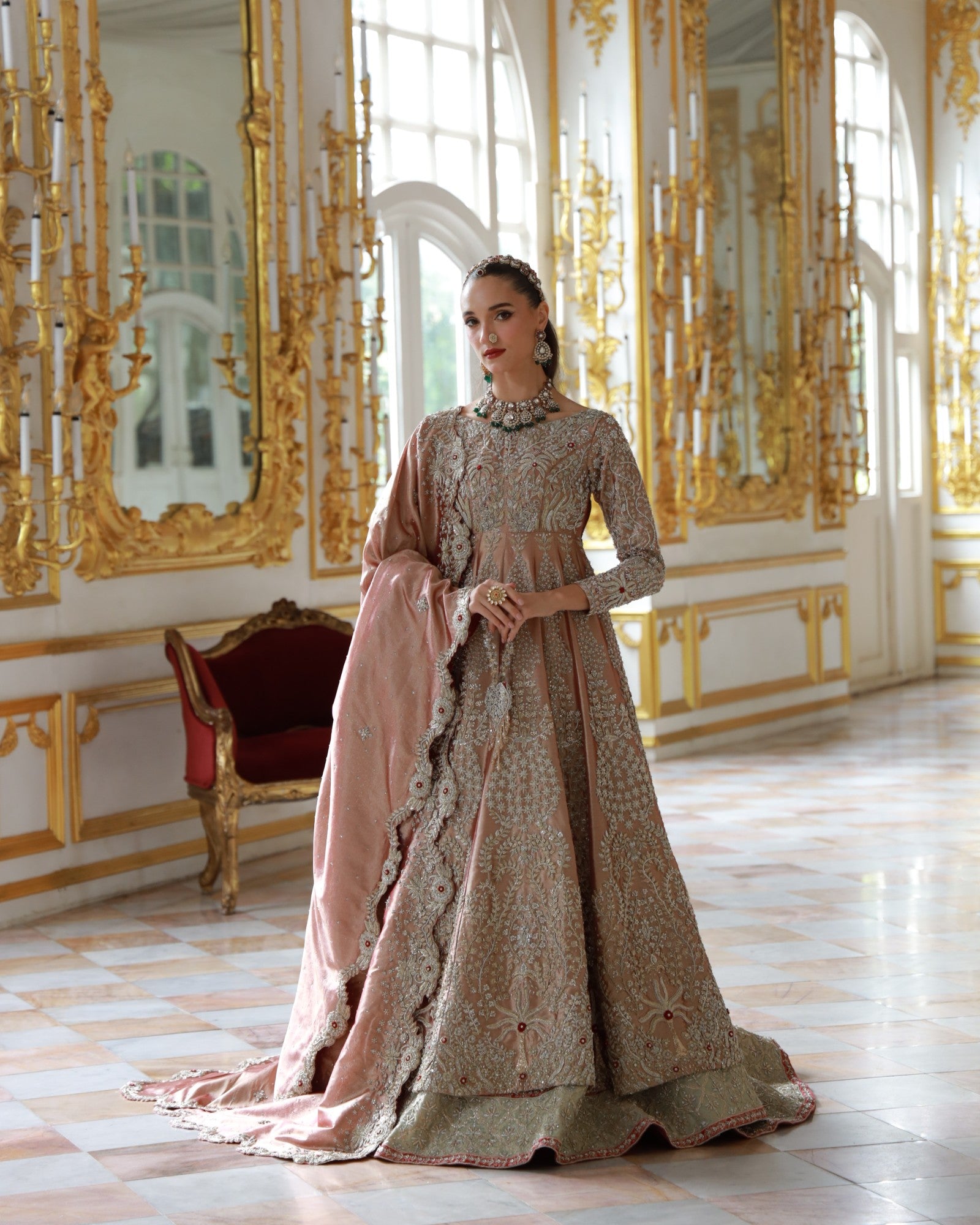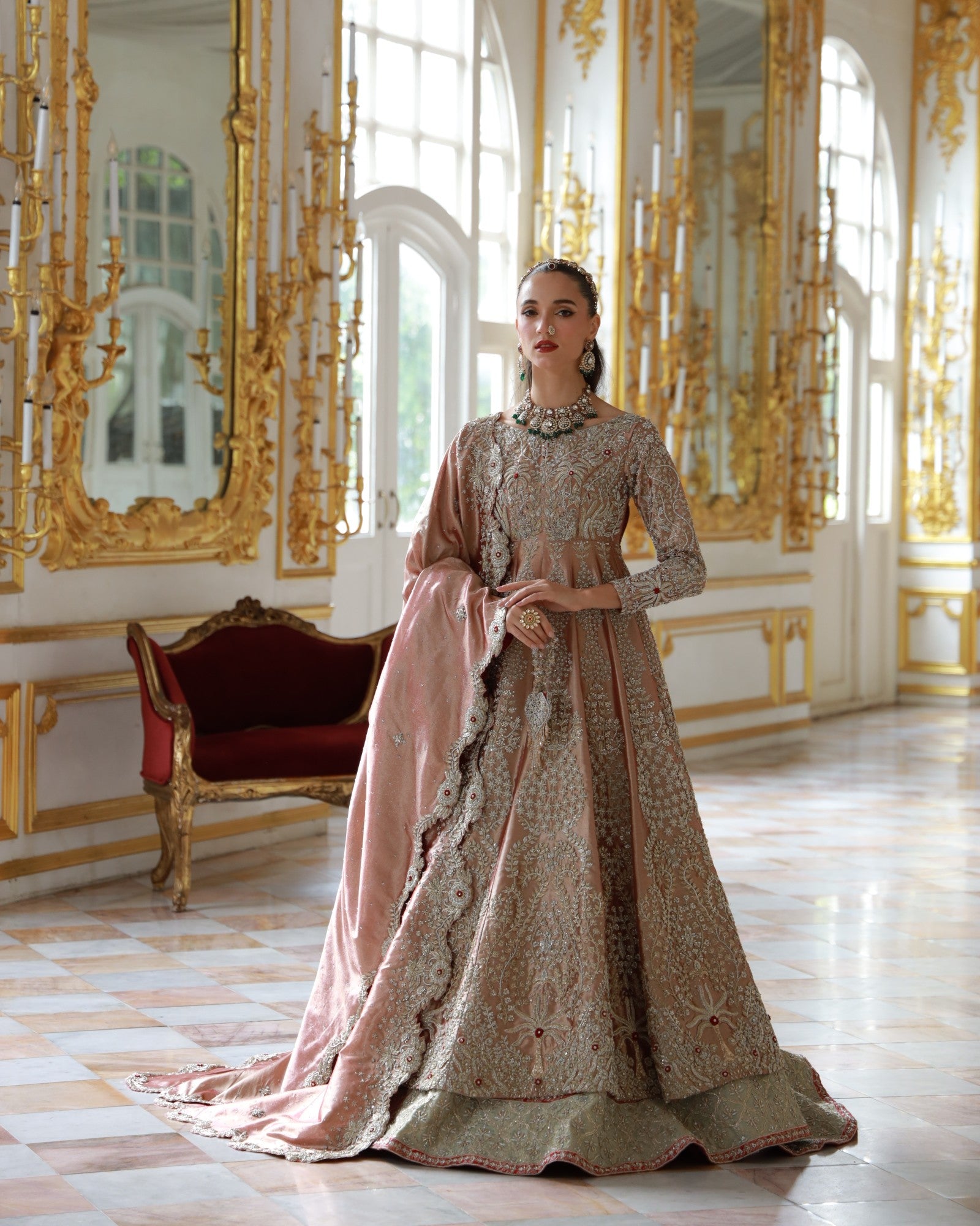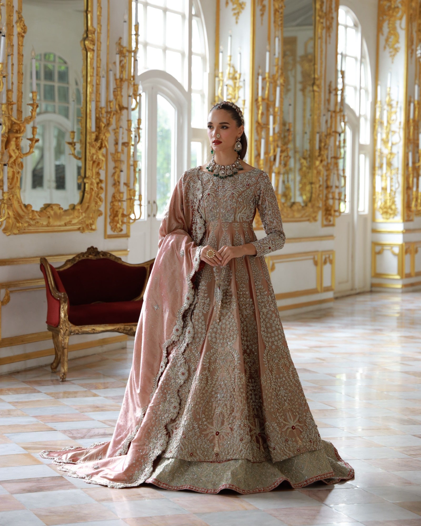 In premium lama fabric, this front-open shirt with a richly adorned lehenga and a scalloped dupatta is hand-embroidered with champagne and antique gold threadwork. Elanora is a timeless bridal masterpiece where regal charm meets grandeur, crafted for the bride who dreams in elegance.