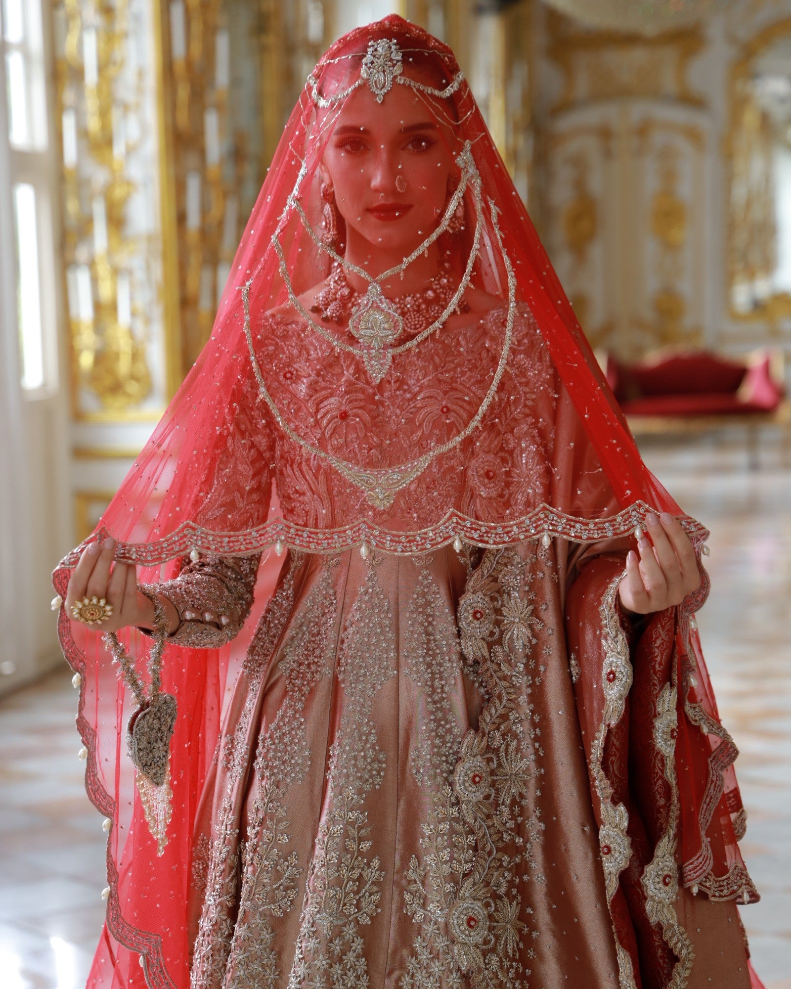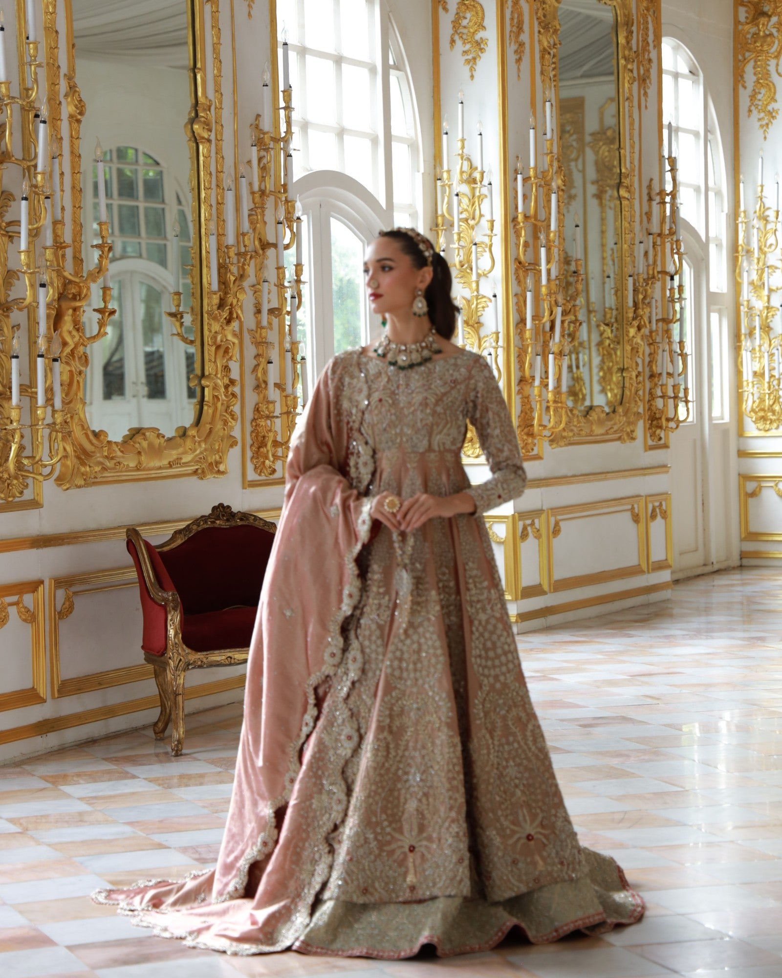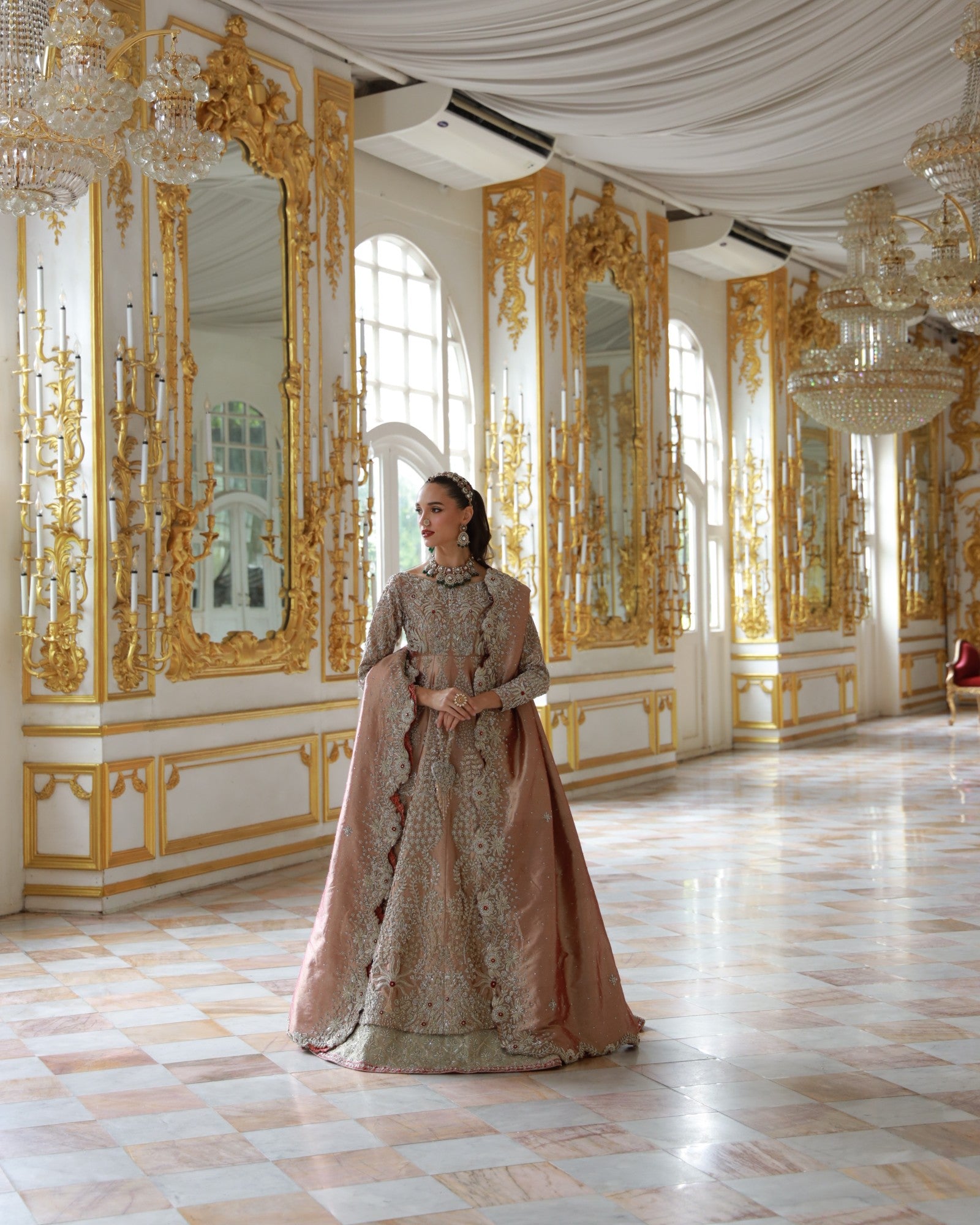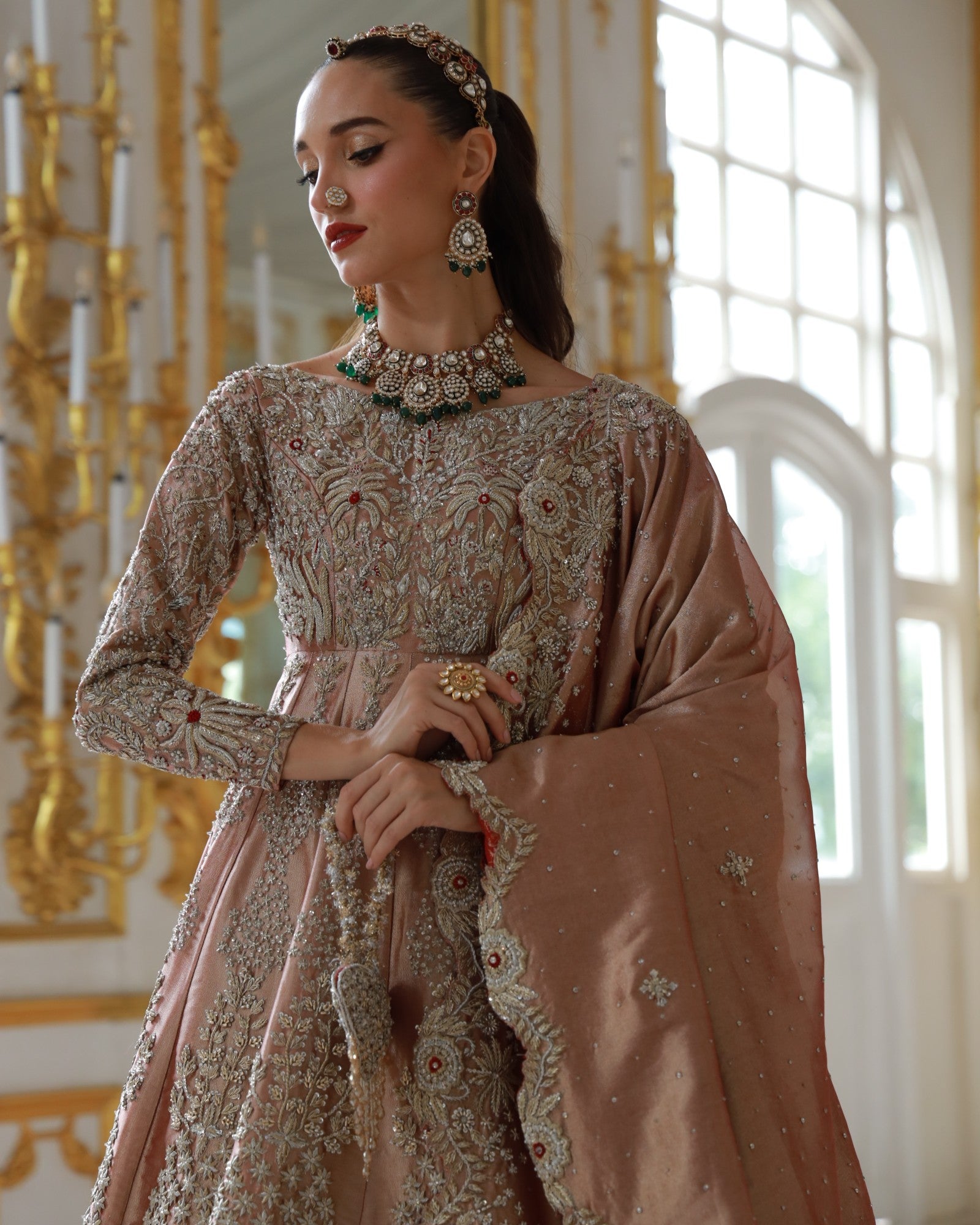 In premium lama fabric, this front-open shirt with a richly adorned lehenga and a scalloped dupatta is hand-embroidered with champagne and antique gold threadwork. Elanora is a timeless bridal masterpiece where regal charm meets grandeur, crafted for the bride who dreams in elegance.