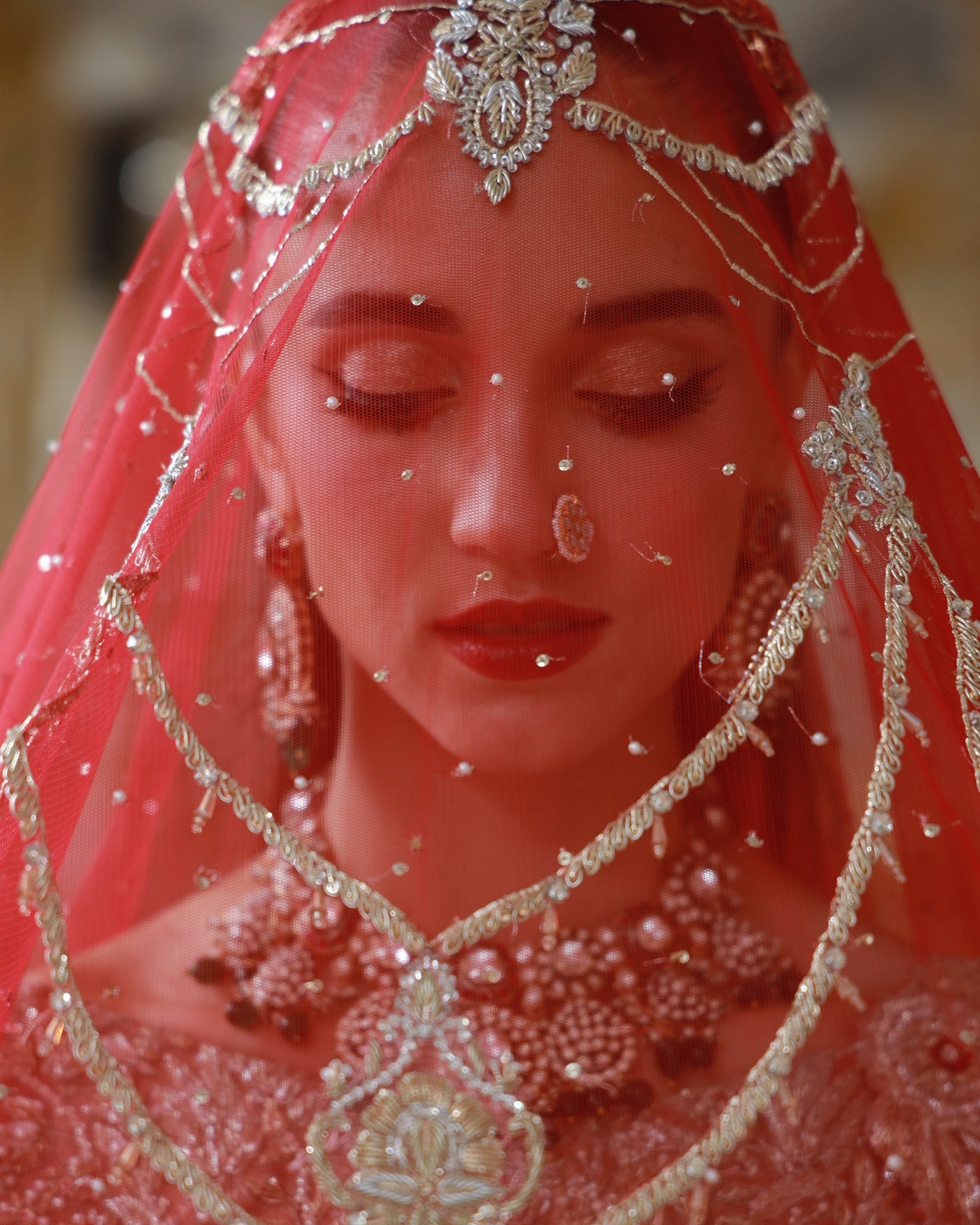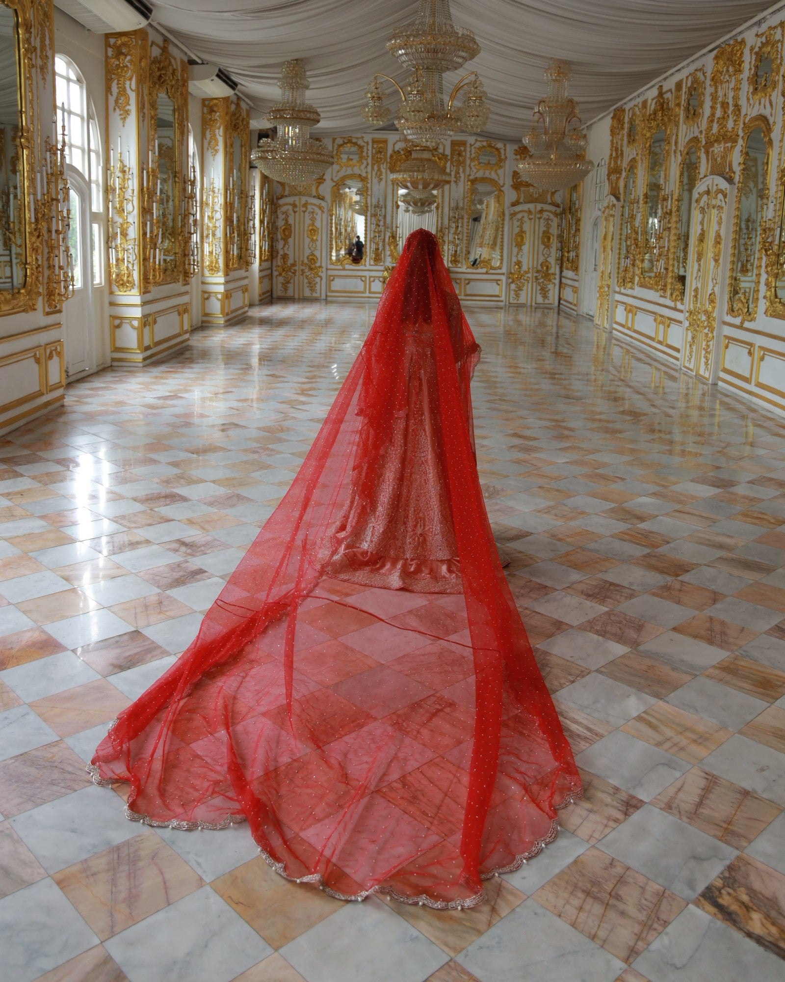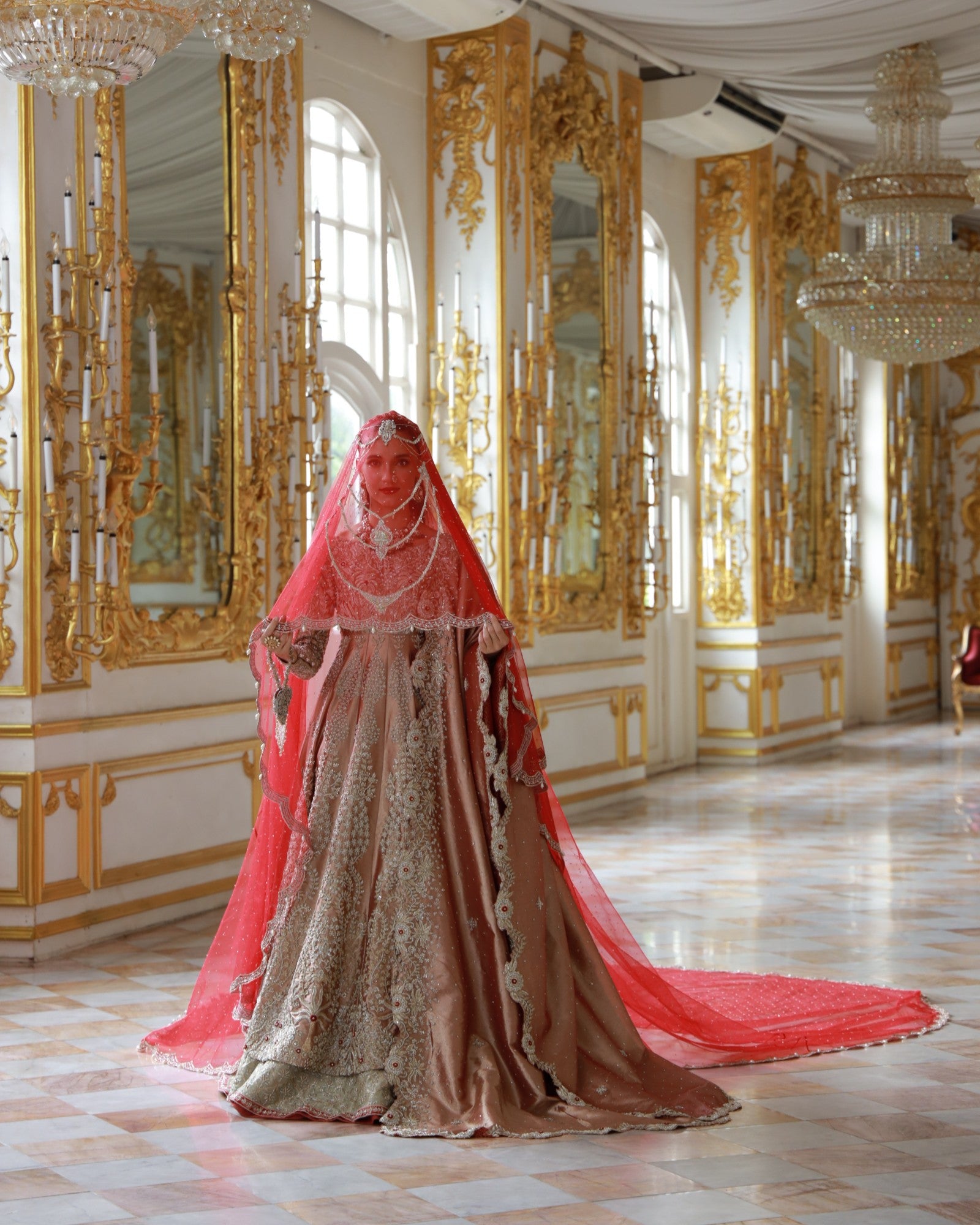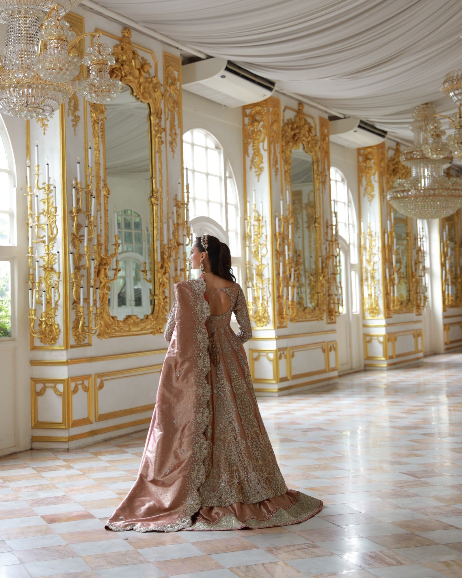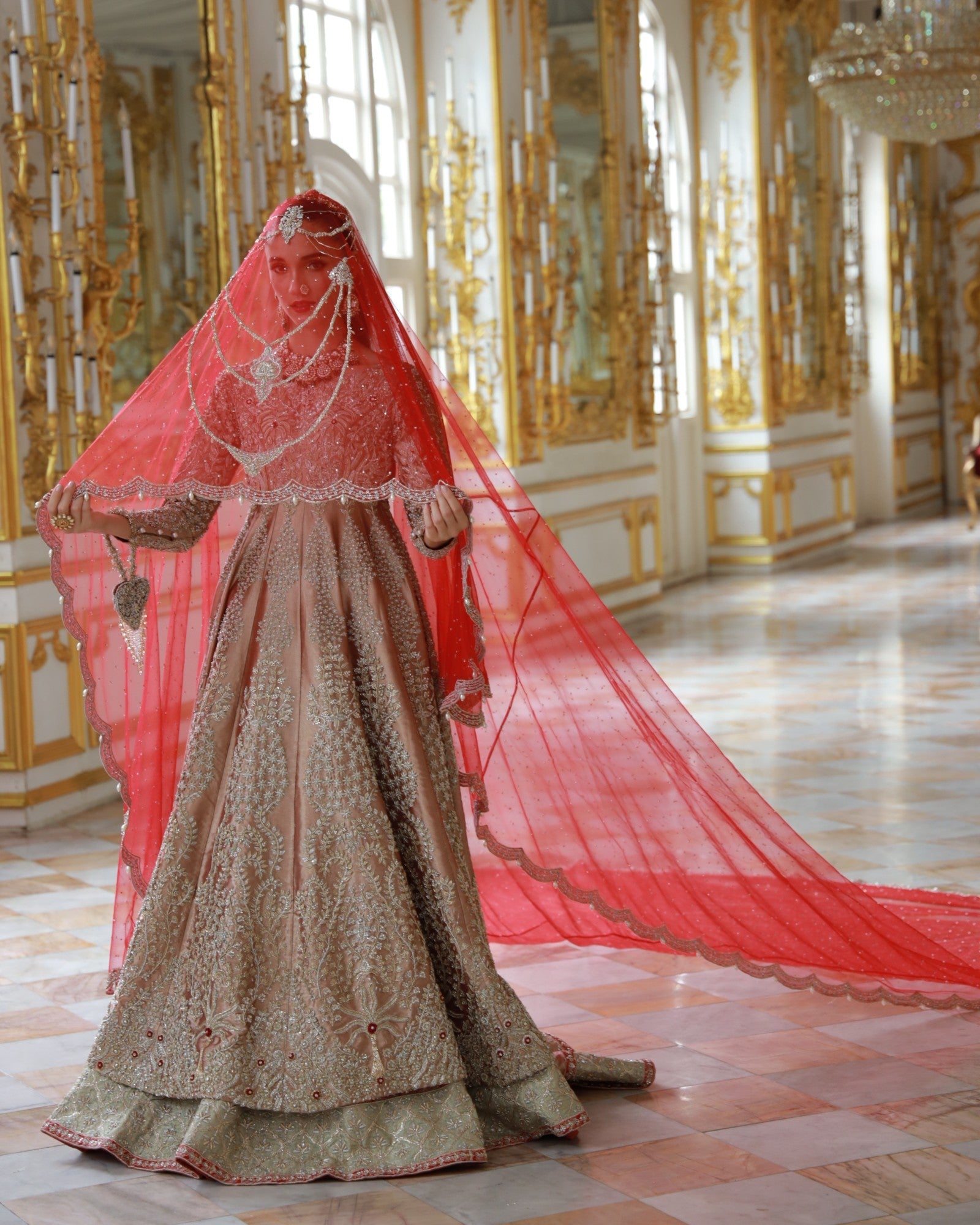 In premium lama fabric, this front-open shirt with a richly adorned lehenga and a scalloped dupatta is hand-embroidered with champagne and antique gold threadwork. Elanora is a timeless bridal masterpiece where regal charm meets grandeur, crafted for the bride who dreams in elegance.
