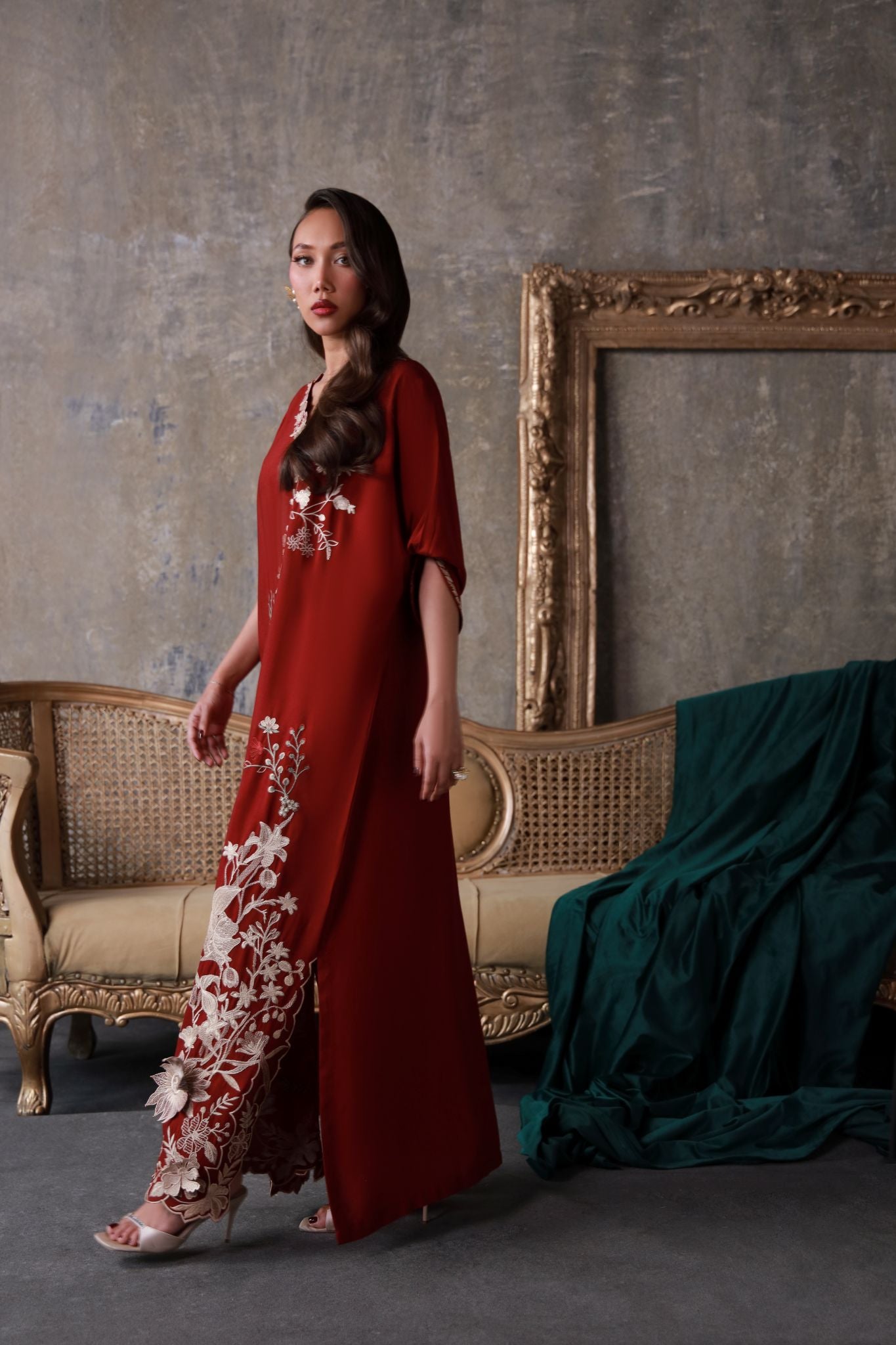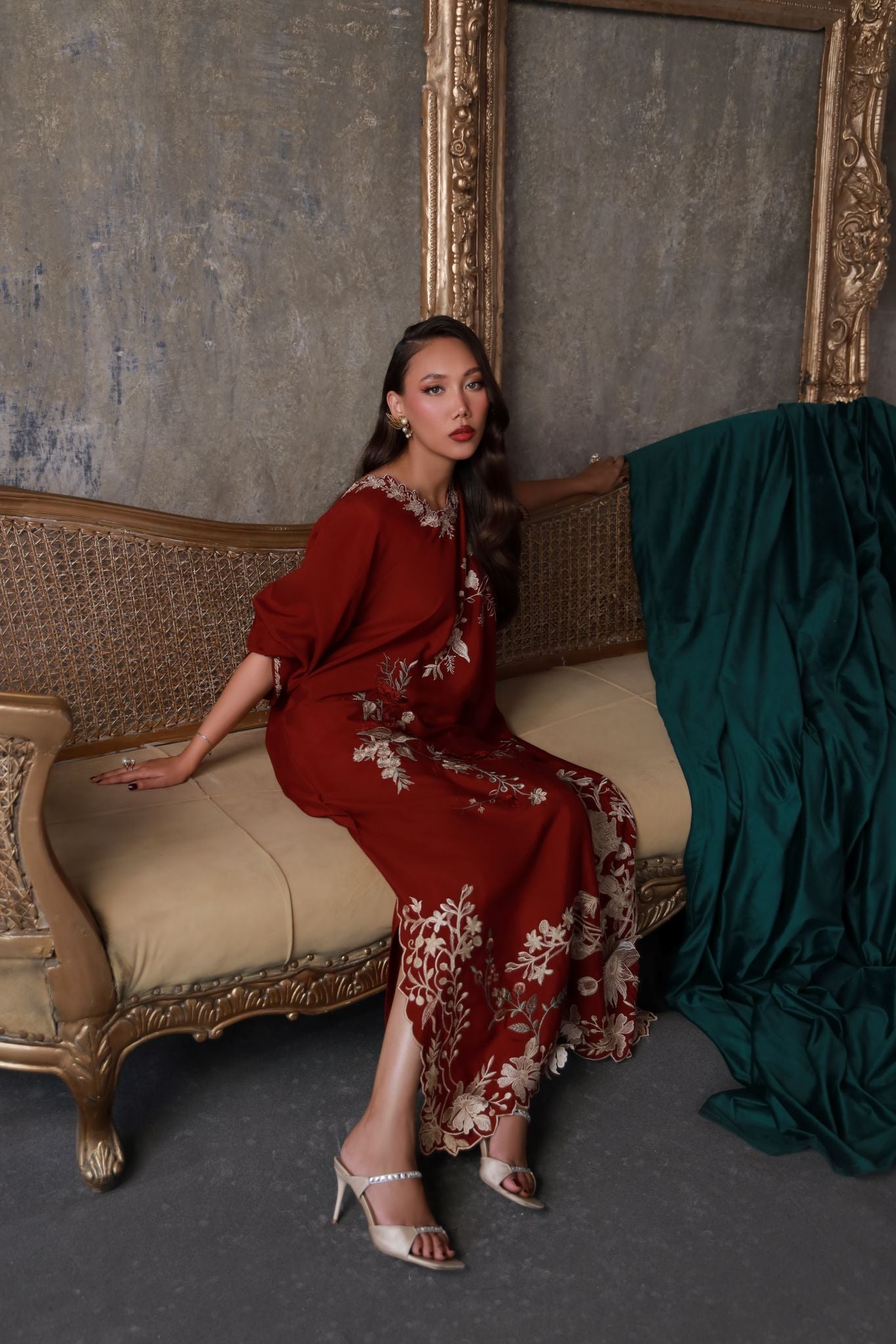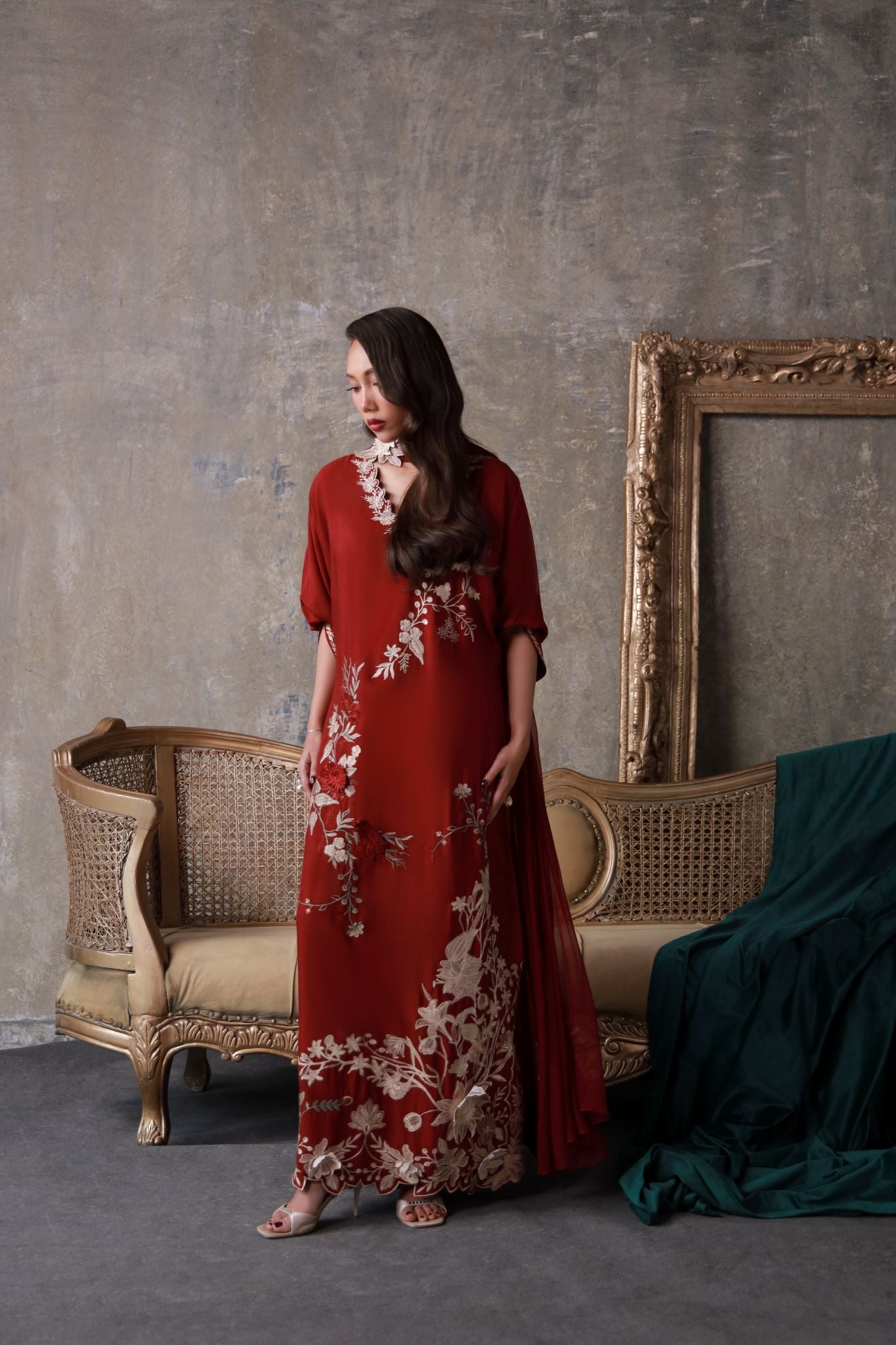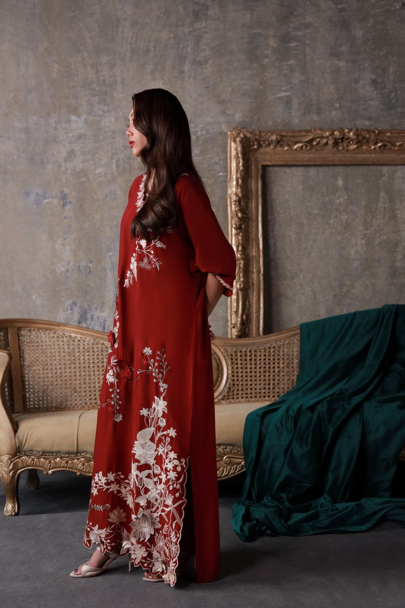 A deep garnet red base enriched with champagne-toned embroidery, exuding regal elegance. Paired with a soft chiffon dupatta to add fluidity and grace.