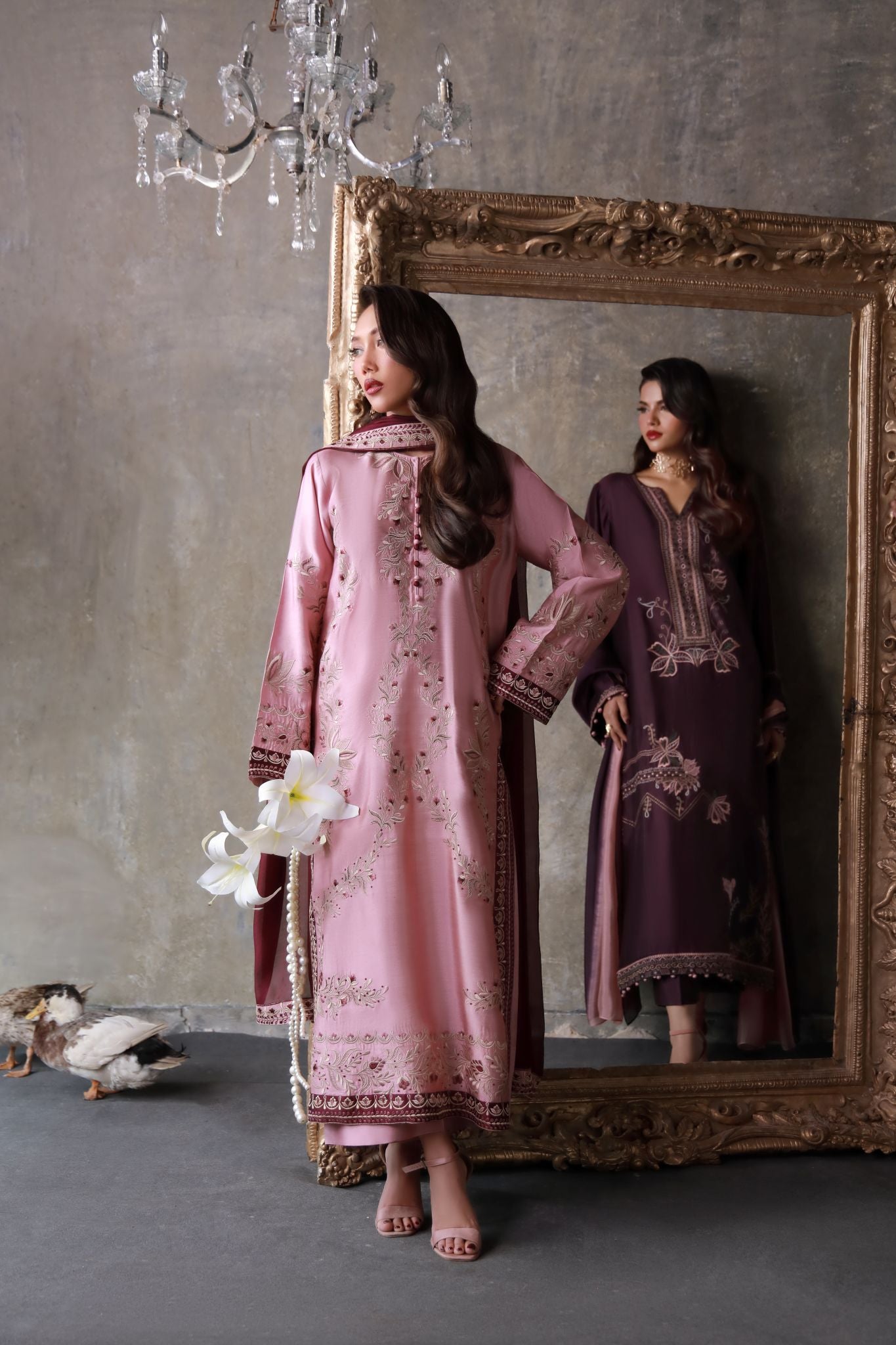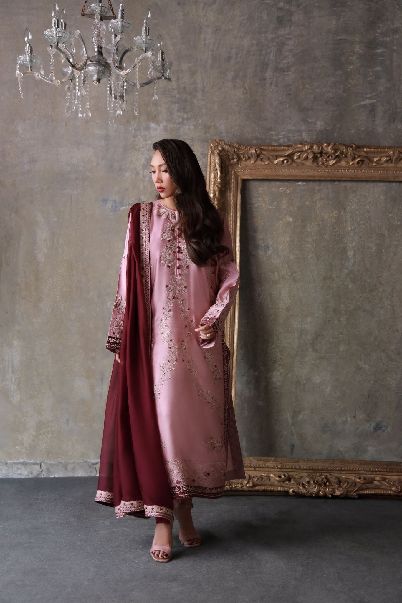 A soft antique rose canvas adorned with delicate floral embroidery in deep maroon and gold, paired with an ethereal organza dupatta for an opulent finish.