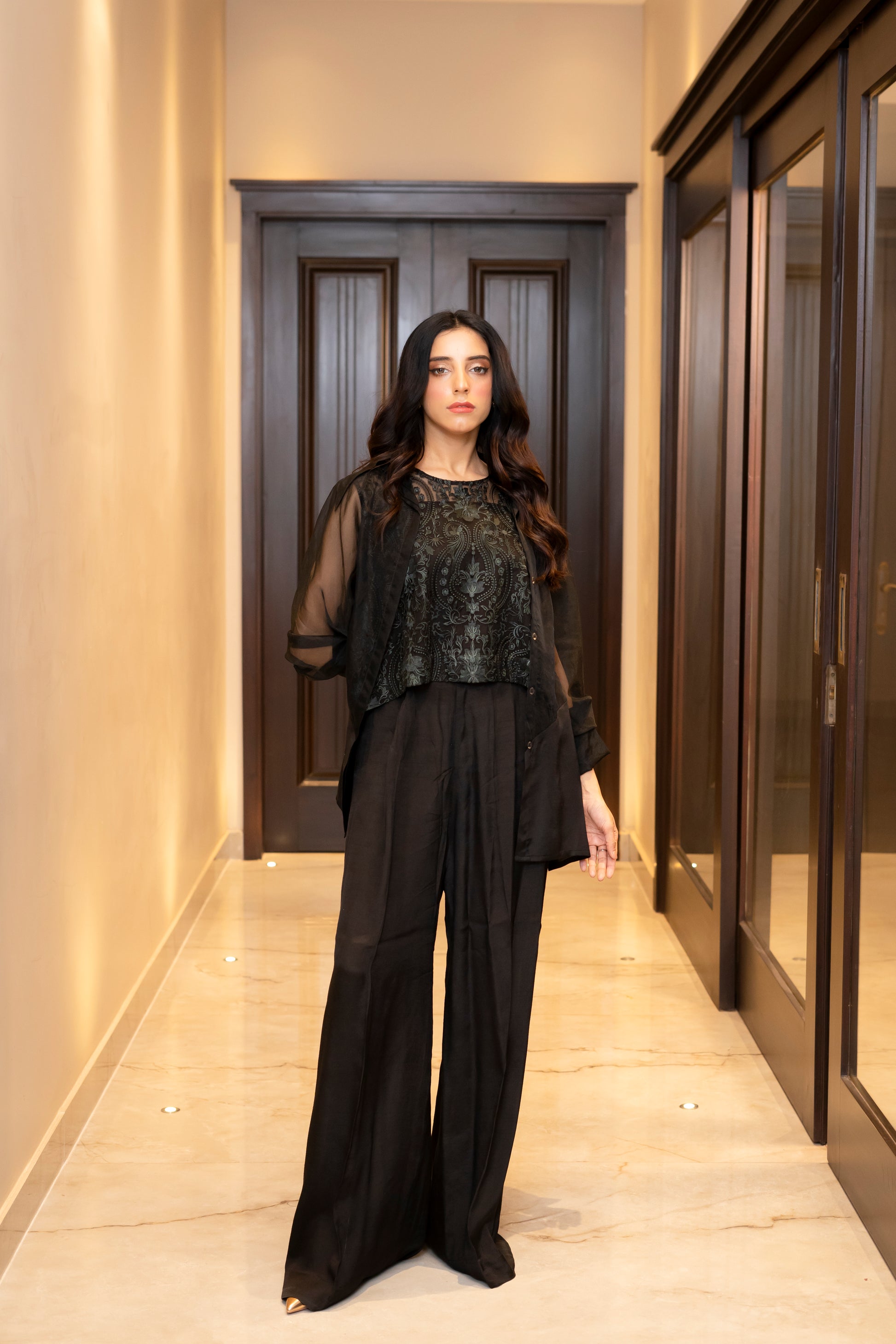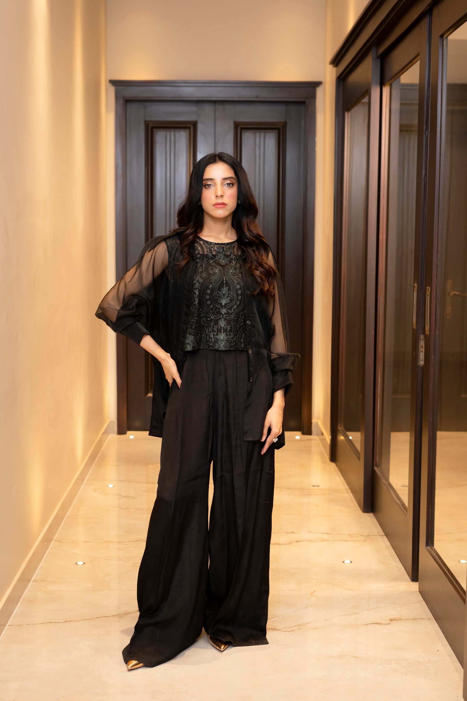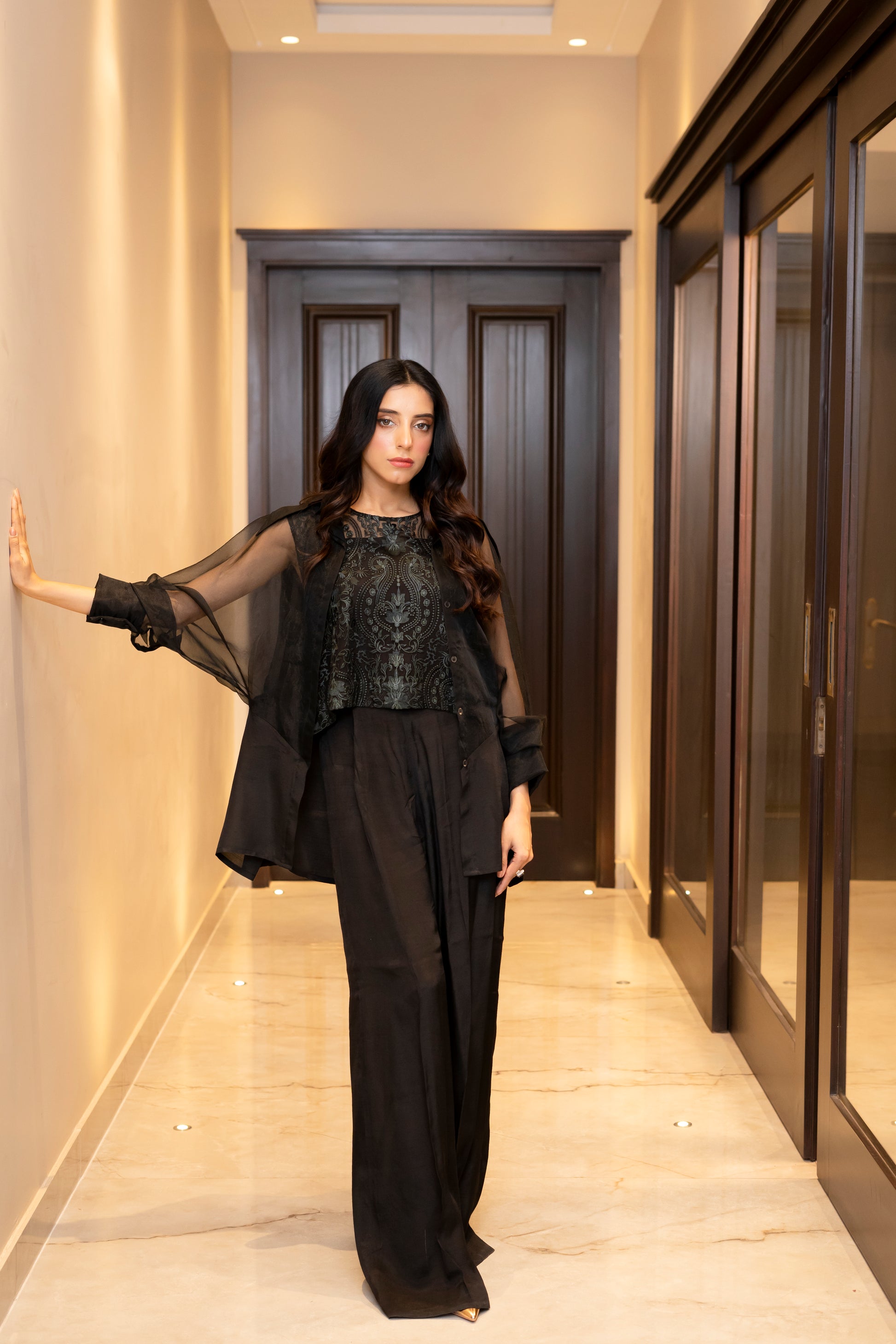 Discover the captivating charm of the "Midnight Allure" outfit, featuring a luxurious silk base paired with a stunning organza jacket. This ensemble showcases an intricately embroidered silk top that exudes elegance, complemented by a flowing wide-leg silhouette that enhances sophistication. The sheer organza jacket adds a layer of ethereal beauty, with its delicate draping and lightness creating a striking contrast against the rich silk underneath. Perfect for formal occasions or evening events, this outfit combines timeless elegance with contemporary flair, ensuring you make a memorable entrance wherever you go. Style it with statement jewelry and chic heels for an elevated look that radiates confidence and grace.