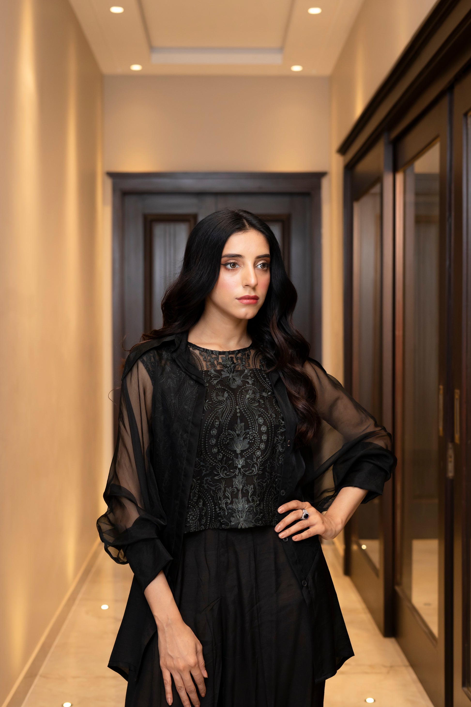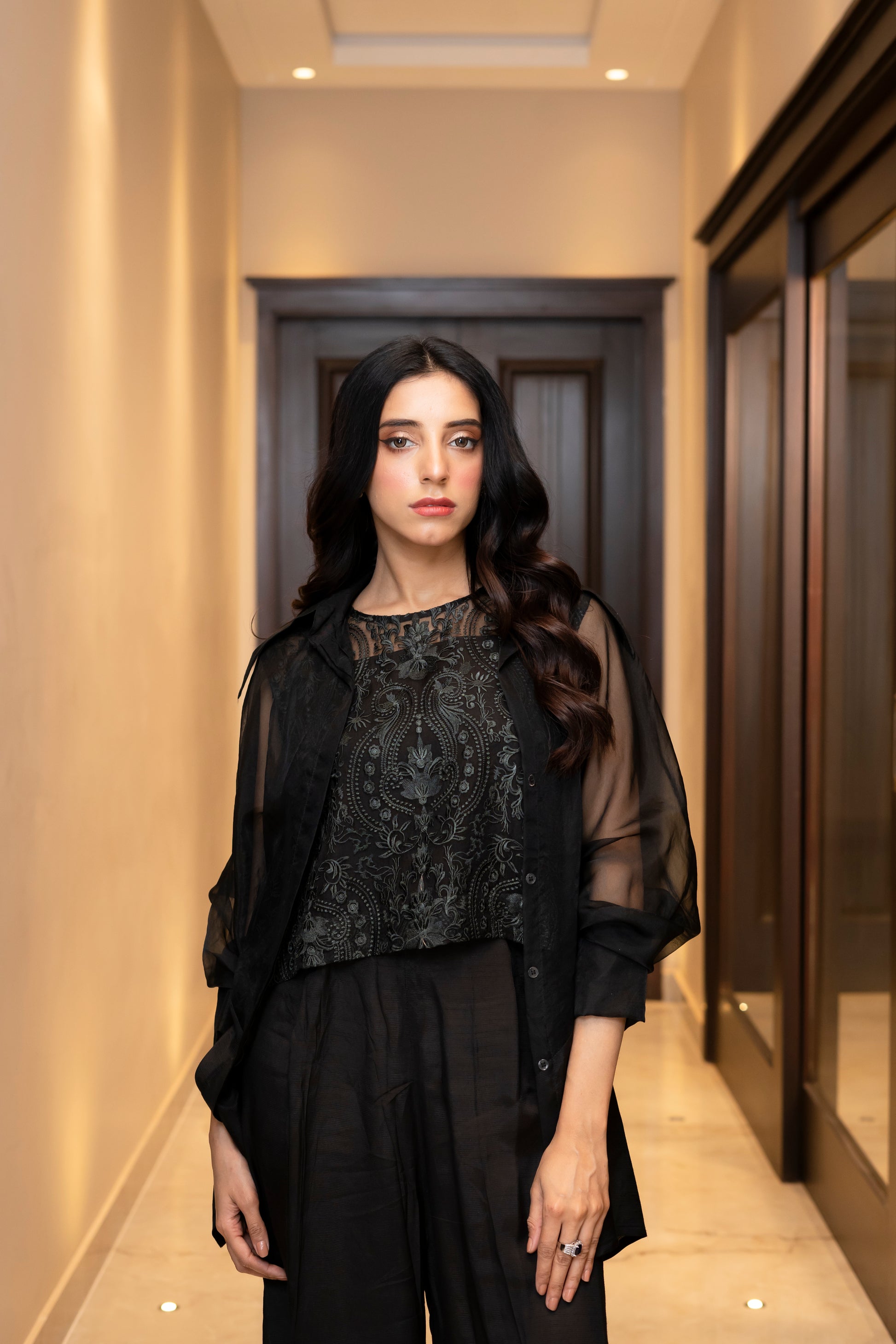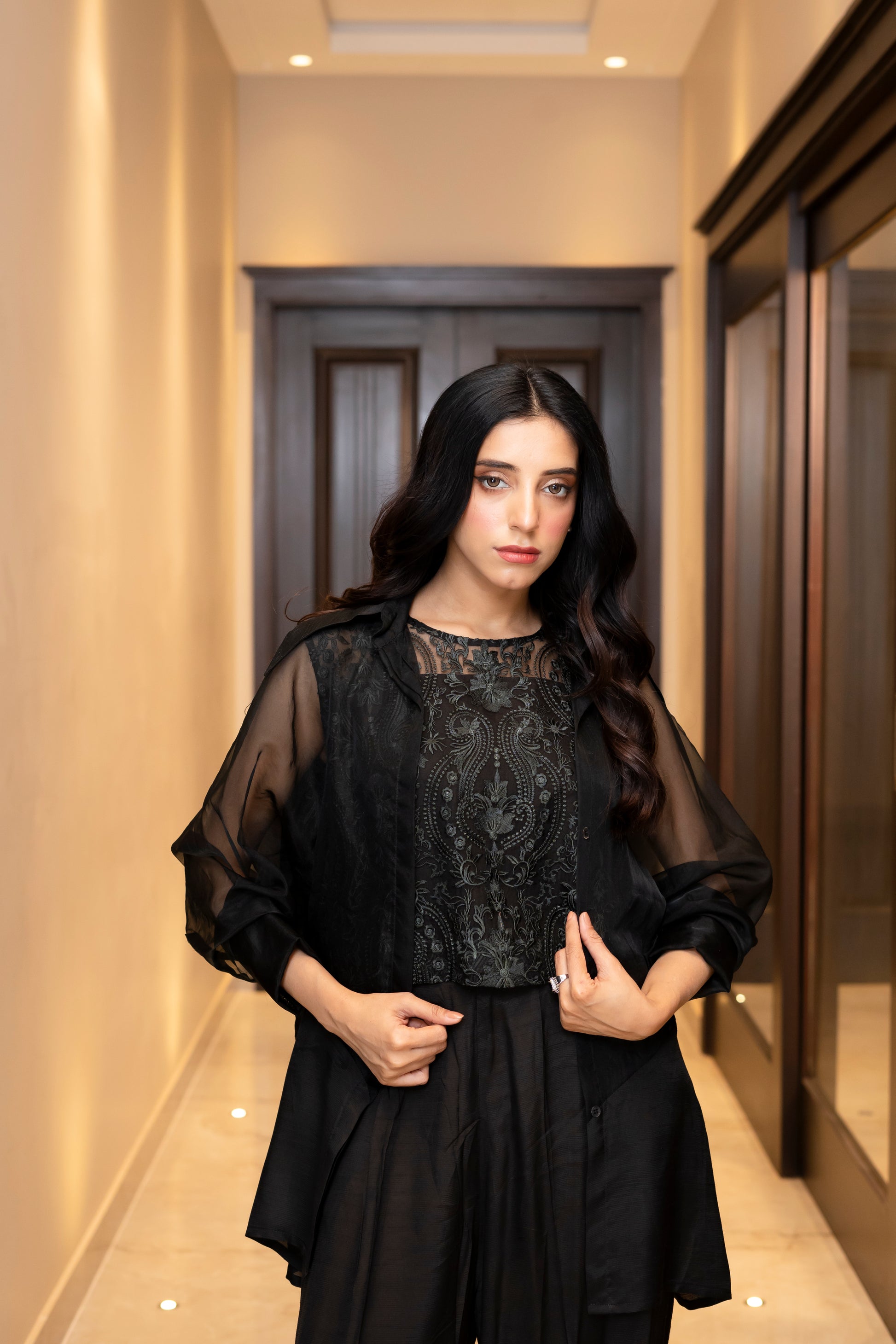 Discover the captivating charm of the "Midnight Allure" outfit, featuring a luxurious silk base paired with a stunning organza jacket. This ensemble showcases an intricately embroidered silk top that exudes elegance, complemented by a flowing wide-leg silhouette that enhances sophistication. The sheer organza jacket adds a layer of ethereal beauty, with its delicate draping and lightness creating a striking contrast against the rich silk underneath. Perfect for formal occasions or evening events, this outfit combines timeless elegance with contemporary flair, ensuring you make a memorable entrance wherever you go. Style it with statement jewelry and chic heels for an elevated look that radiates confidence and grace.