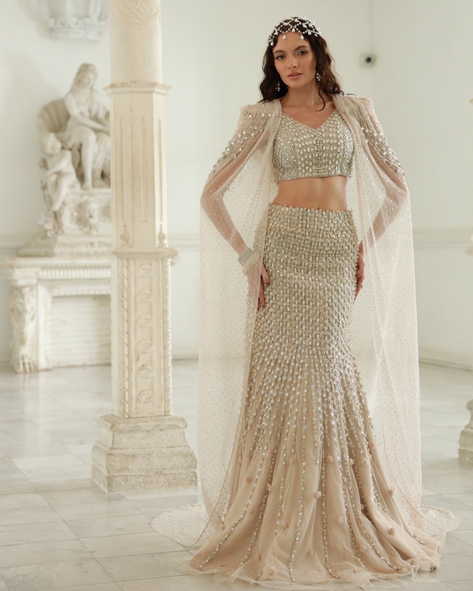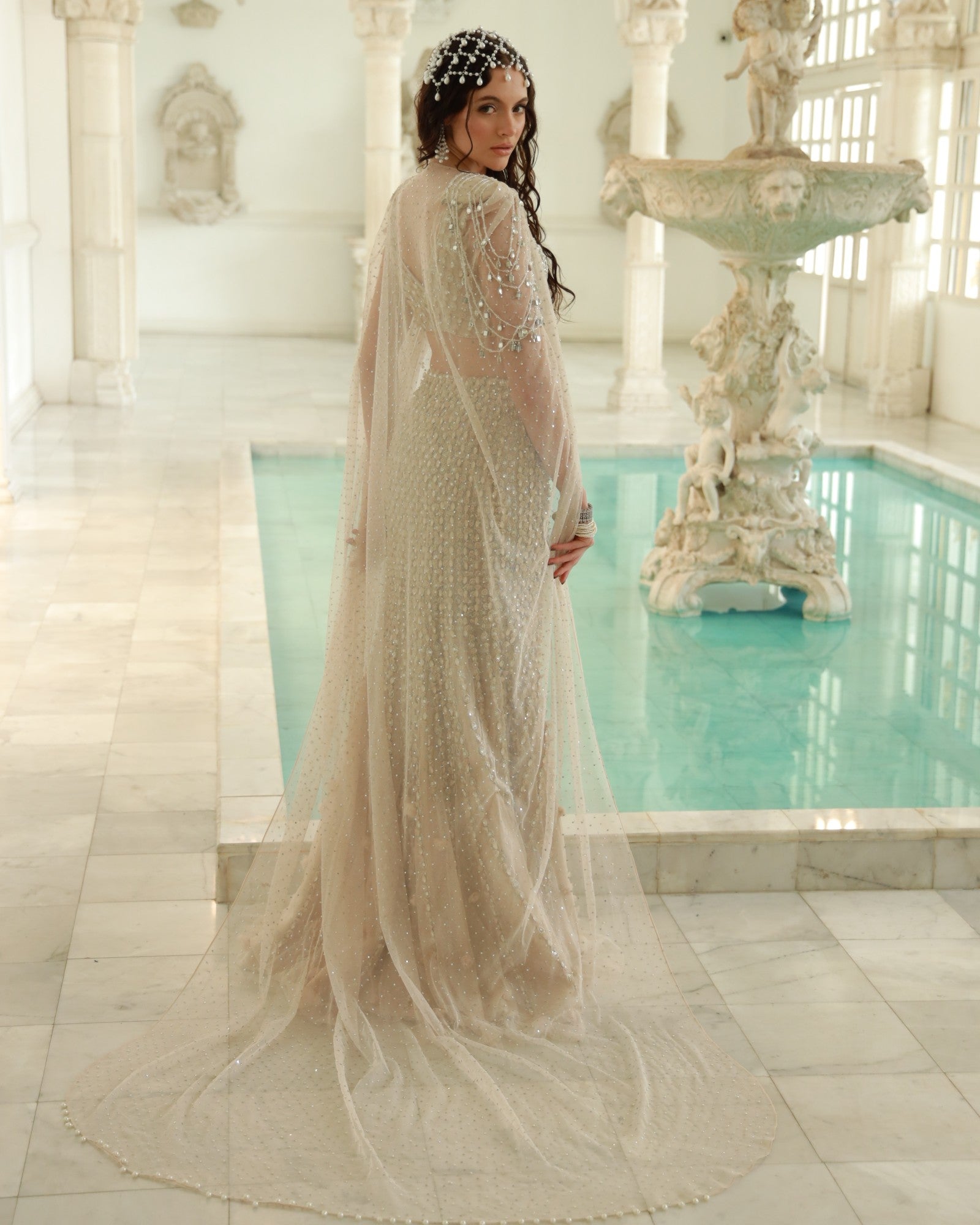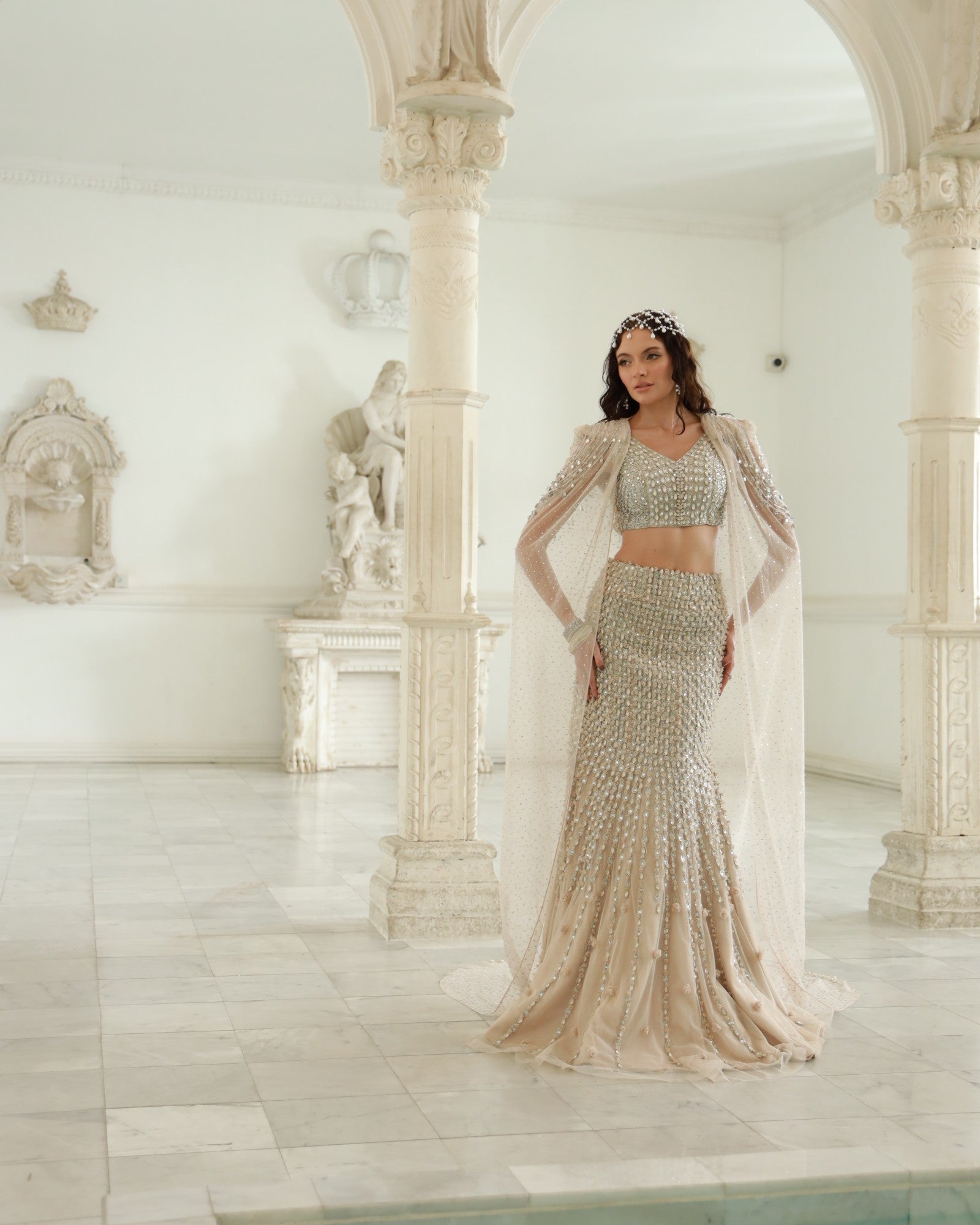 A sculpted mermaid silhouette adorned with pearls and crystals, Naurel embodies modern opulence with a regal edge.