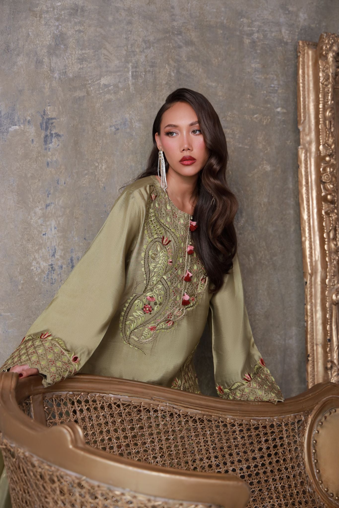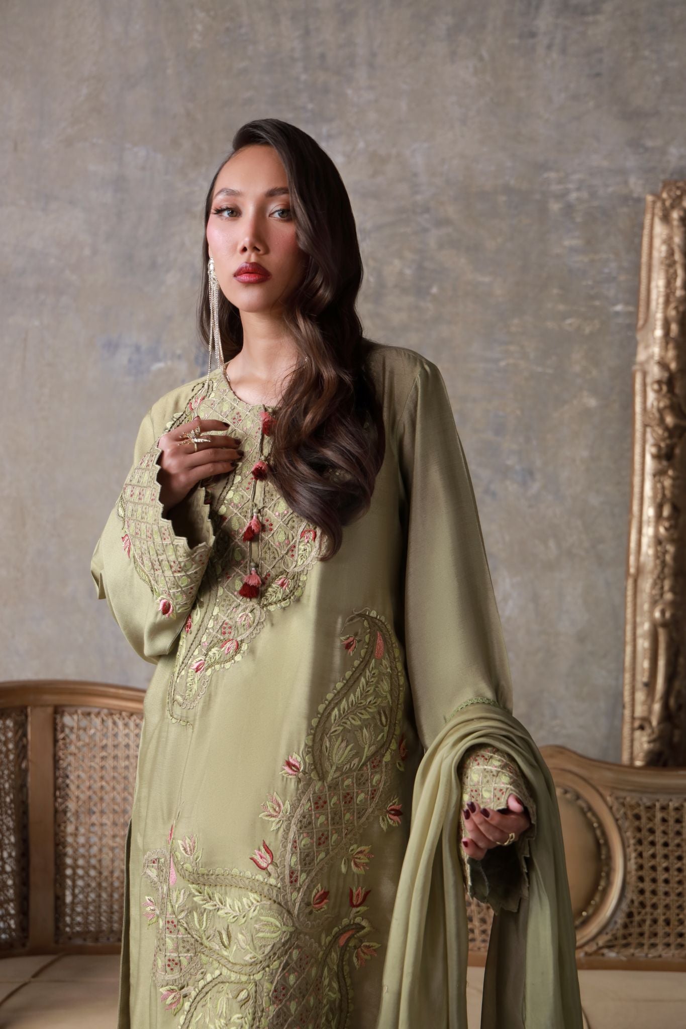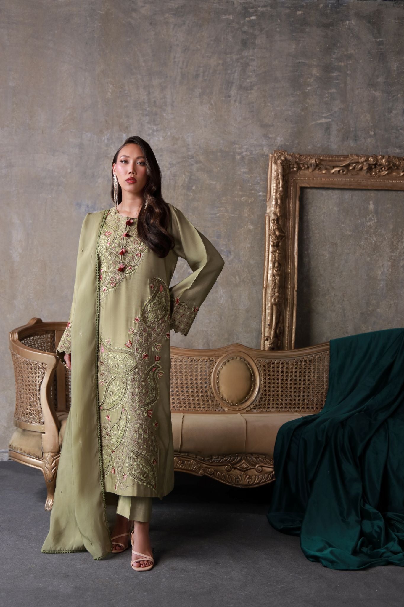 A majestic olive-toned outfit, luxuriously tailored in premium silk with intricate paisley and floral embroidery in muted gold and blush. Complemented by a sheer organza dupatta, this look captures vintage finesse with contemporary elegance.