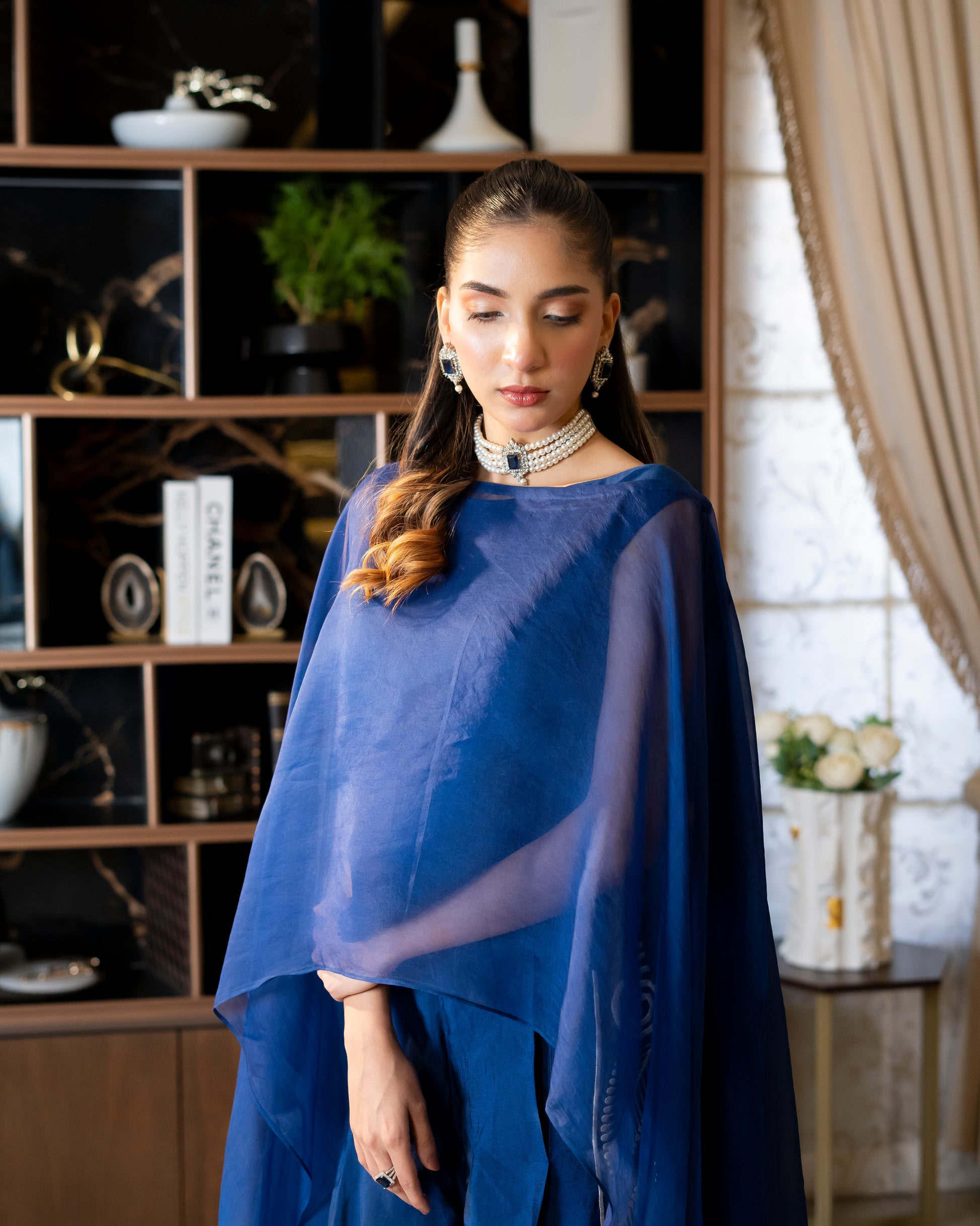“Sapphire Flow – Organza & Silk Cape Ensemble”