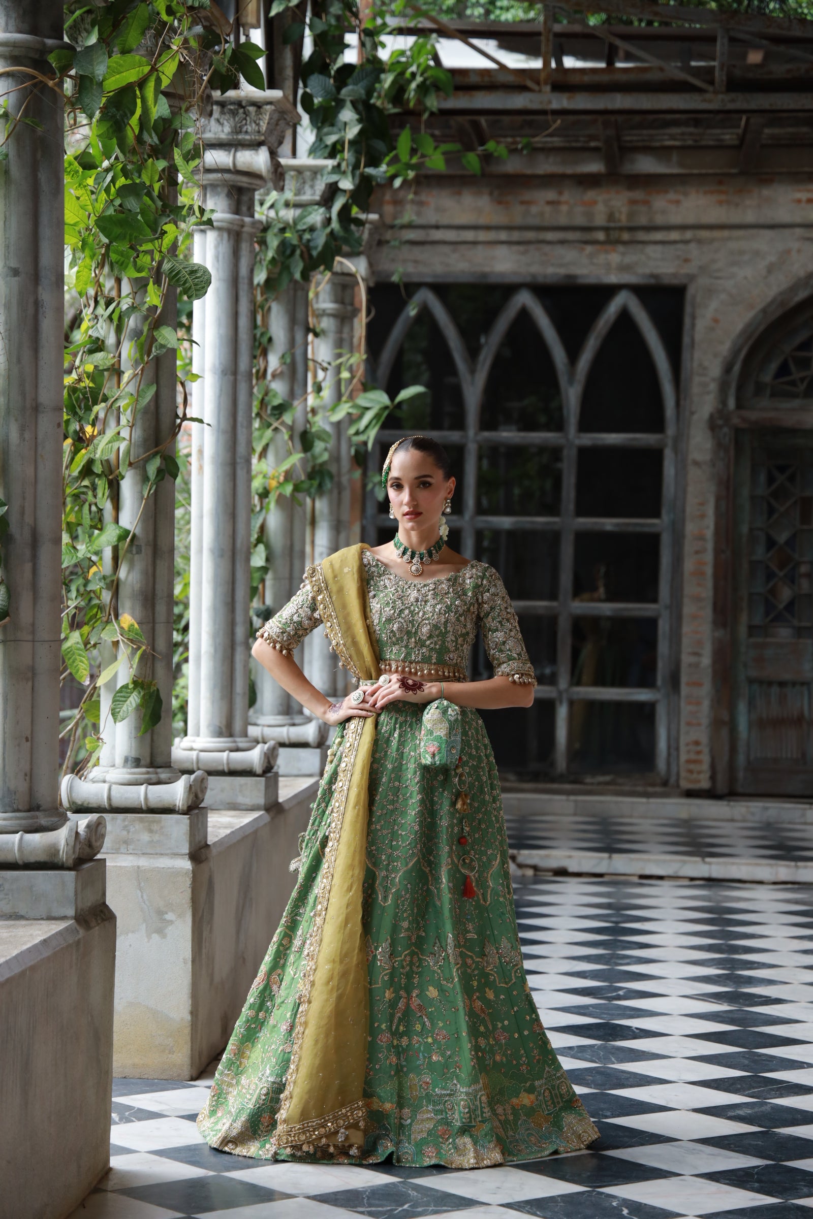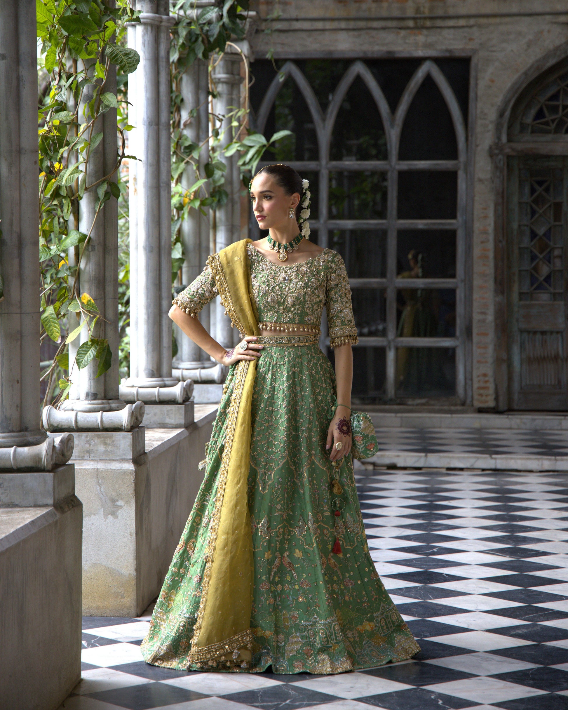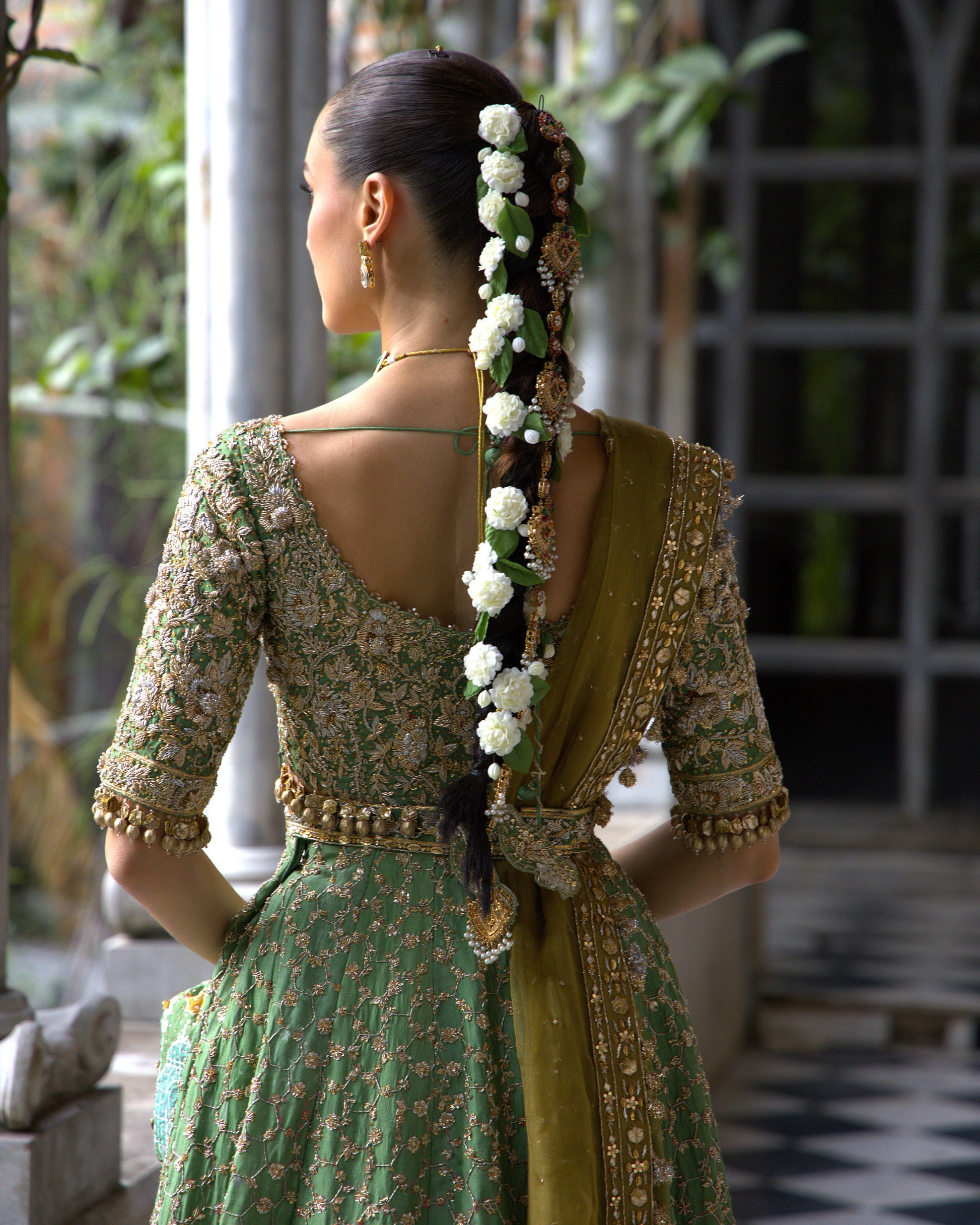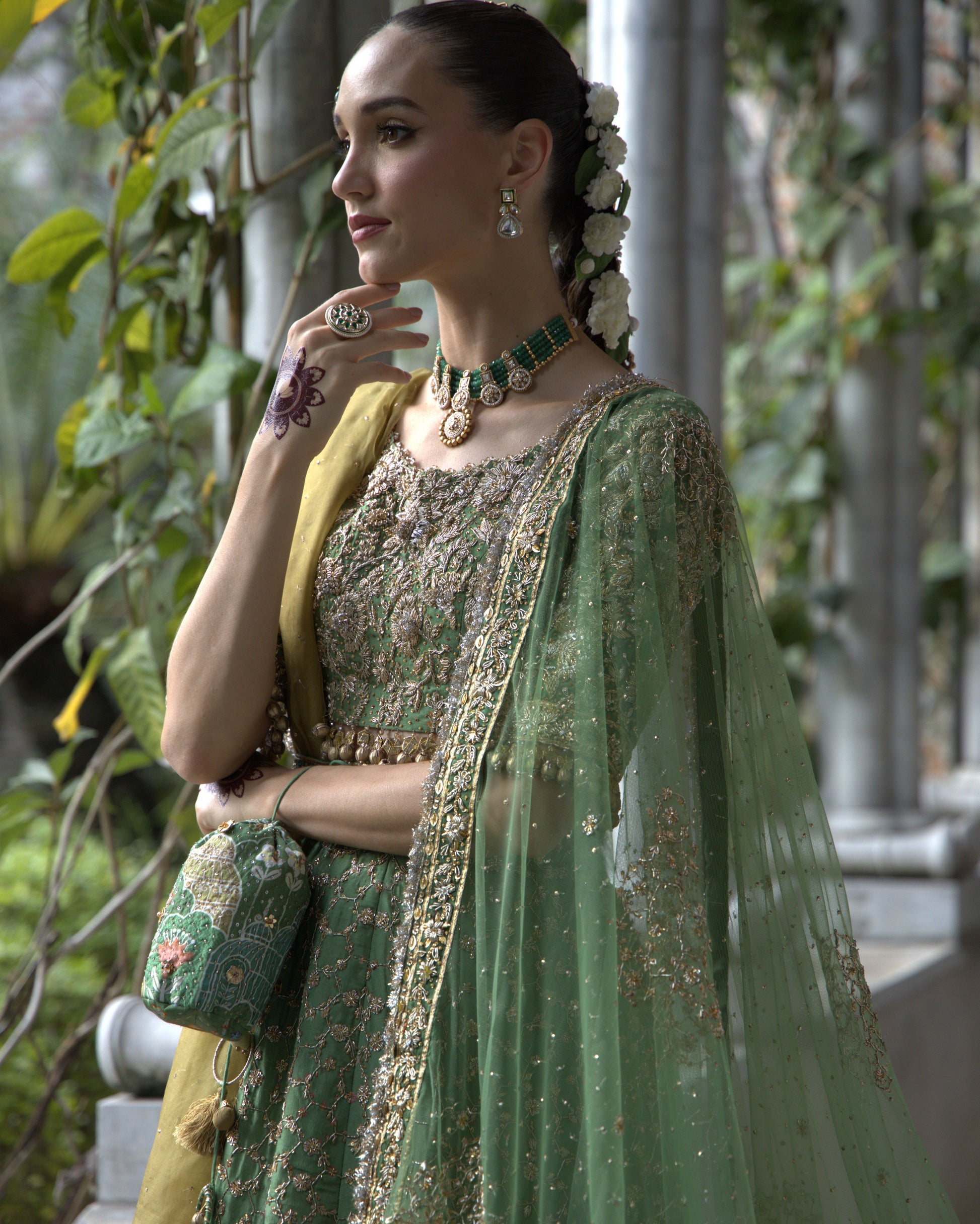 A regal ode to tradition, this fern green bridal set in raw silk is adorned with intricate gota, resham, and zari embroidery.