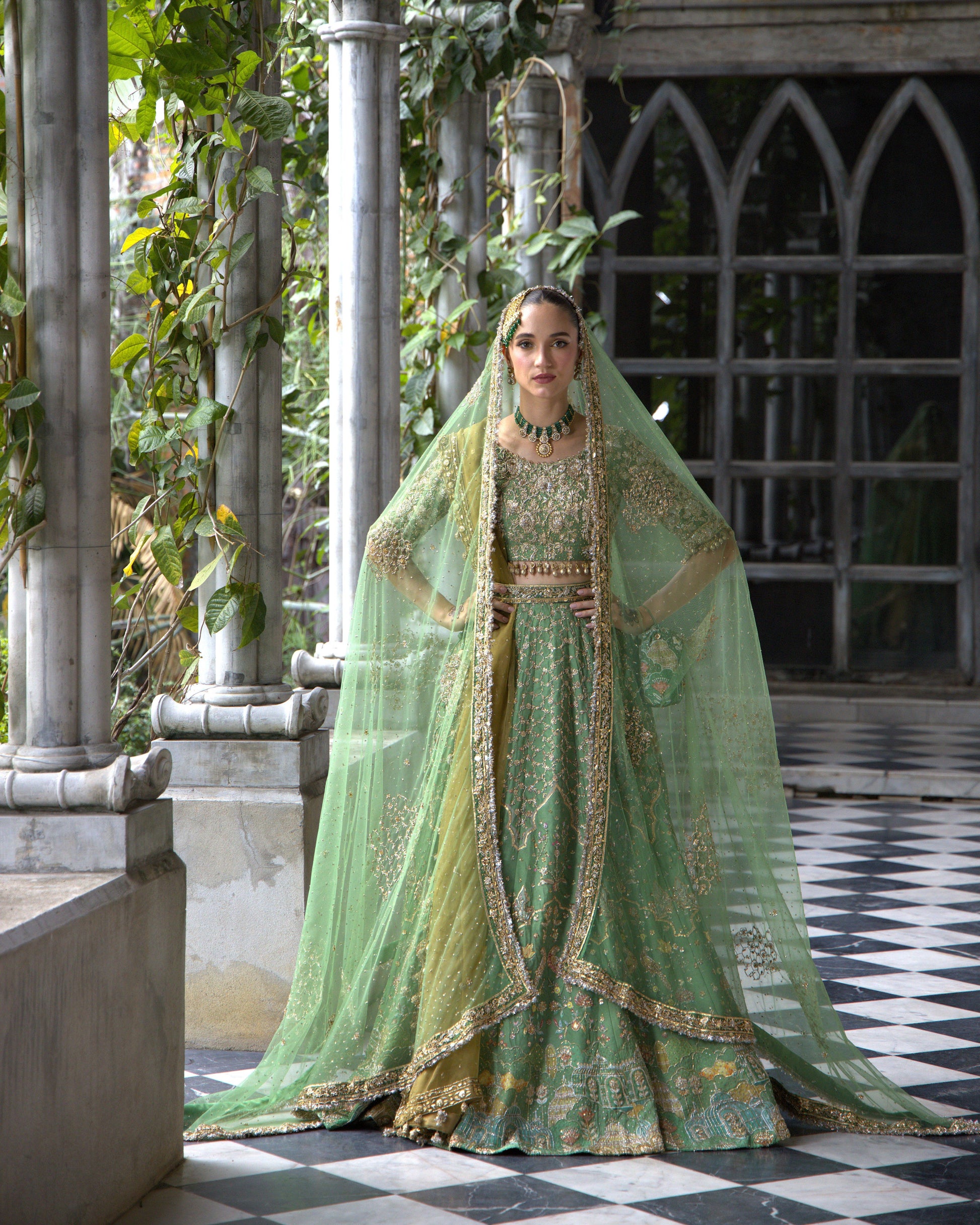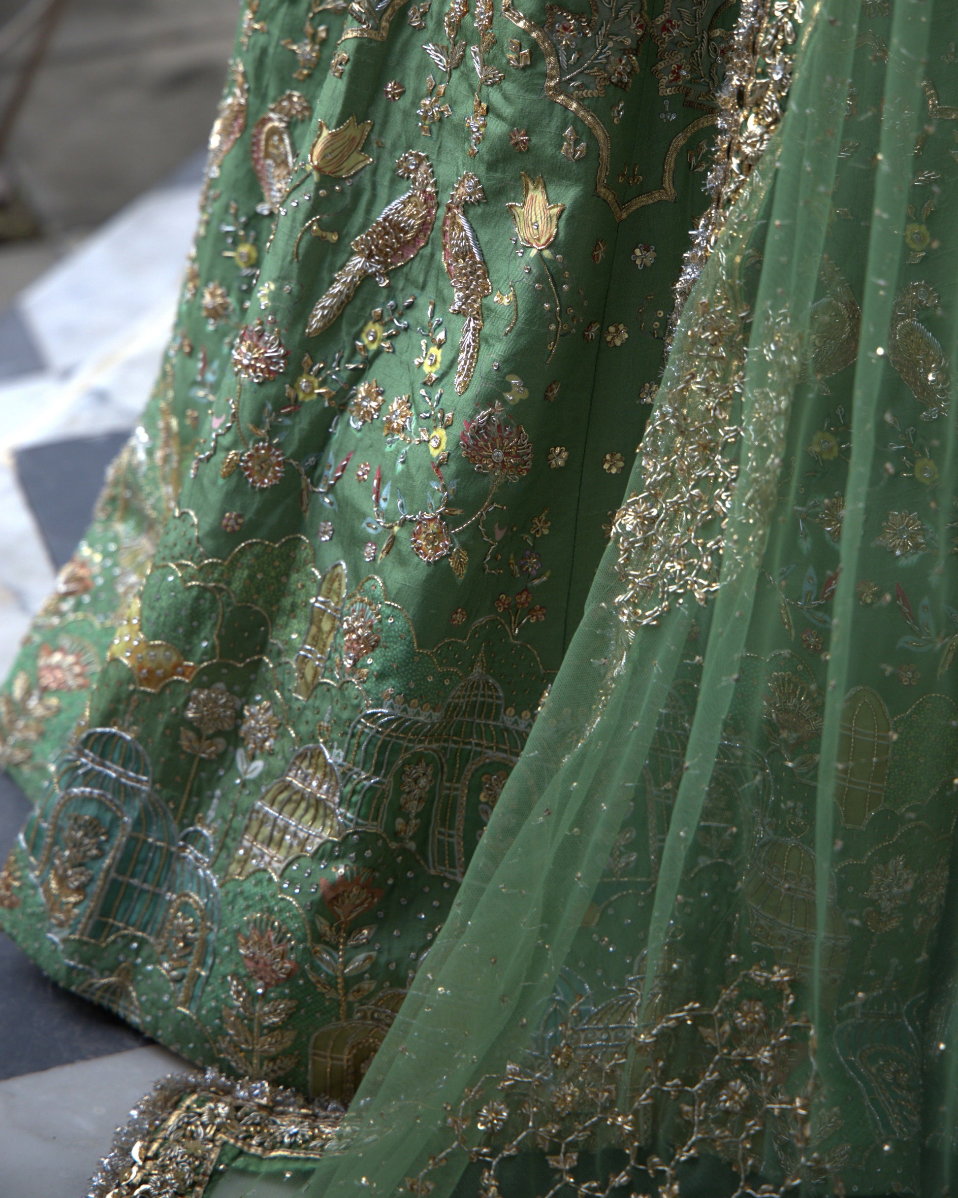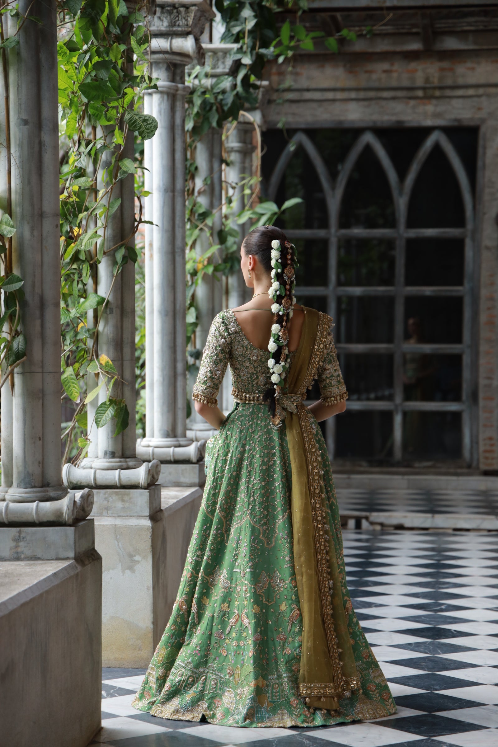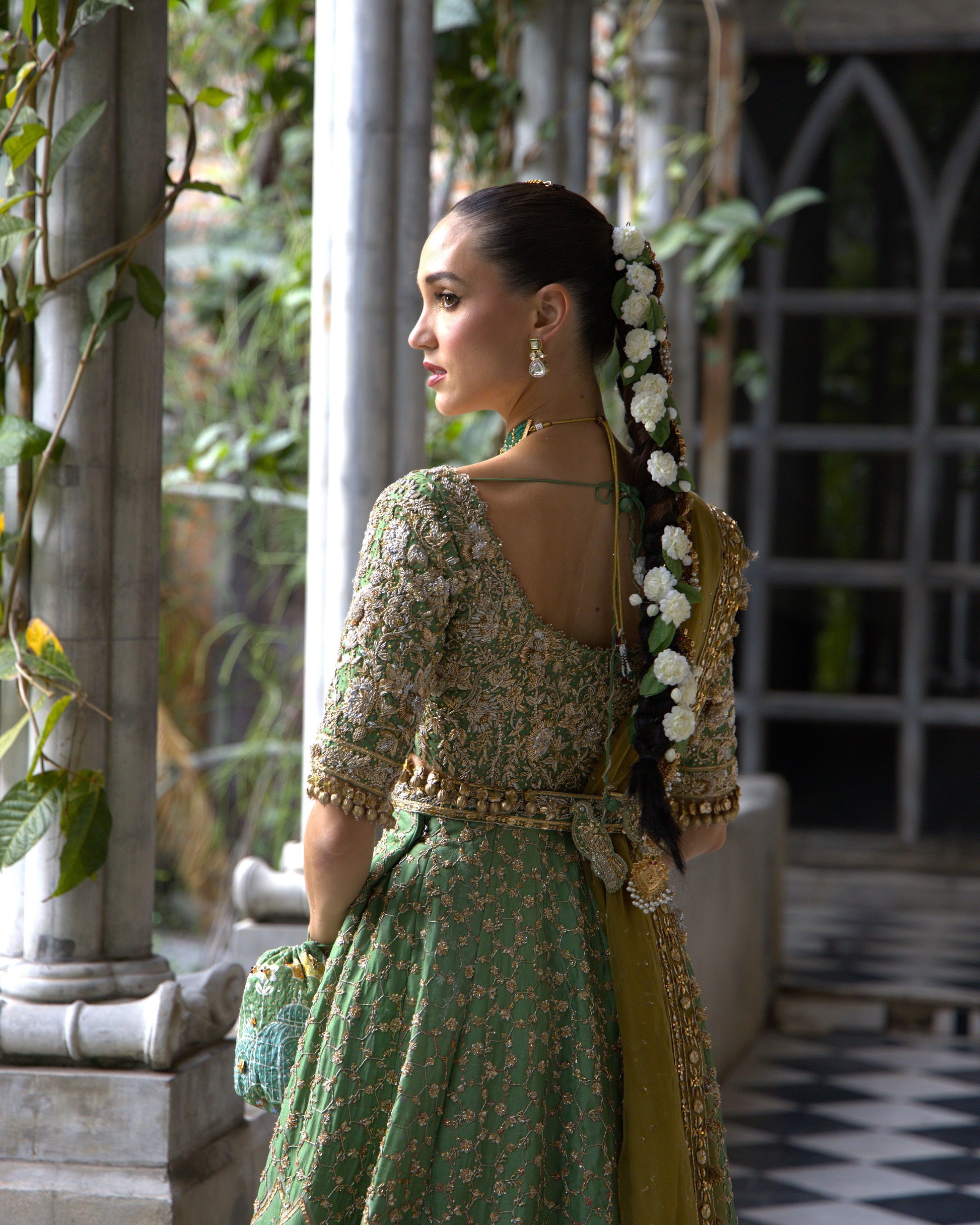 A regal ode to tradition, this fern green bridal set in raw silk is adorned with intricate gota, resham, and zari embroidery.