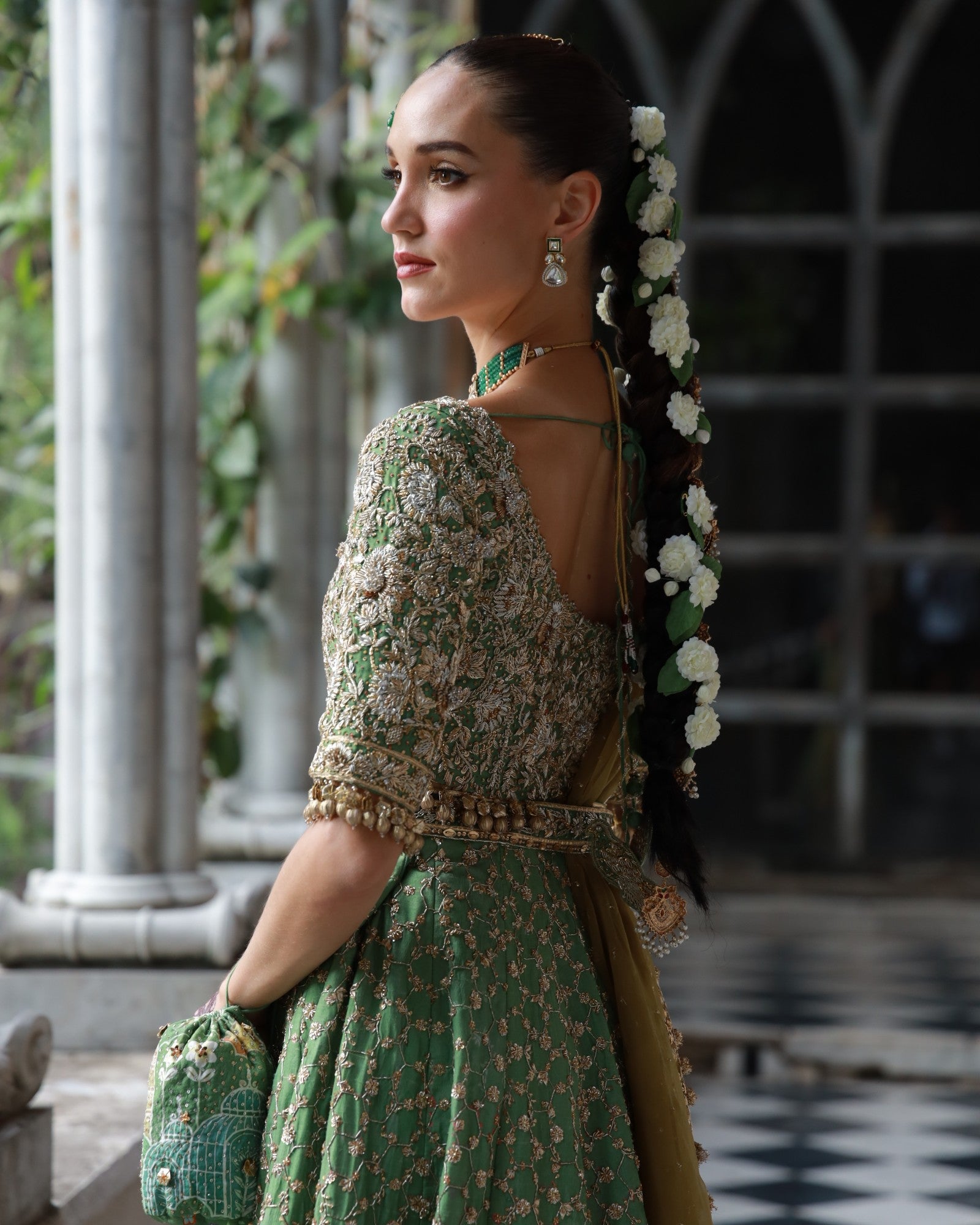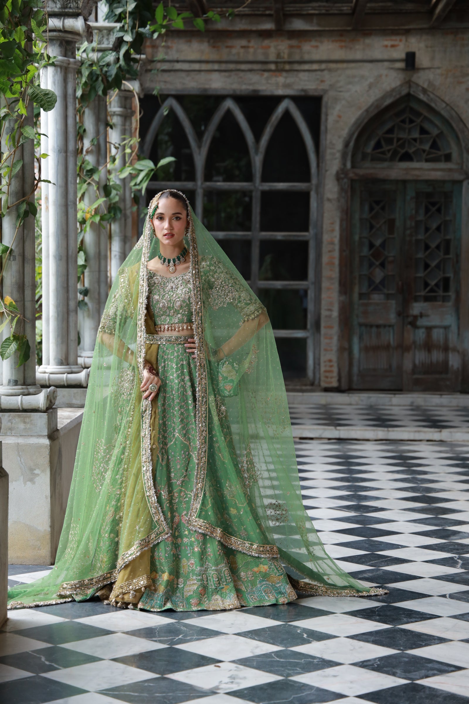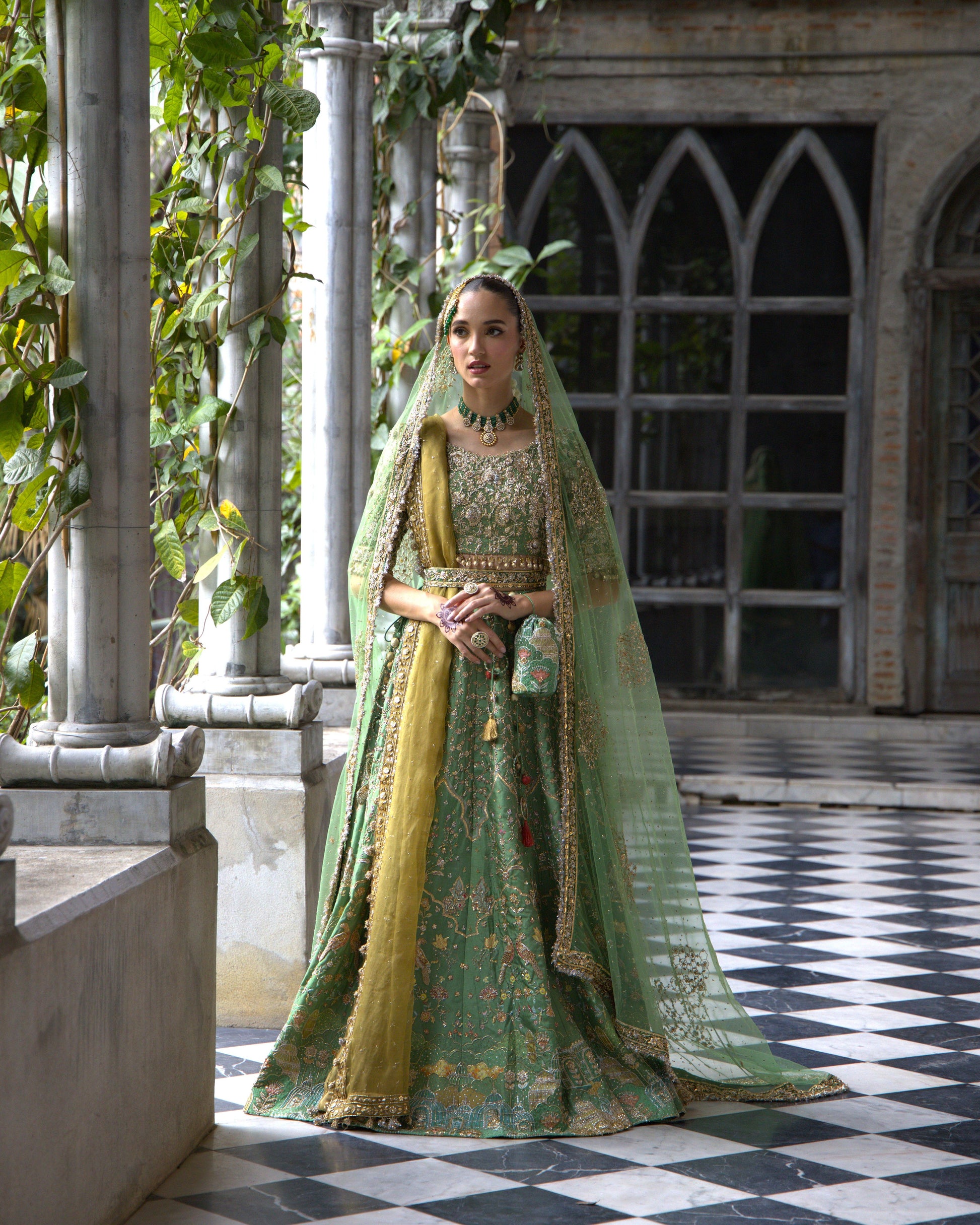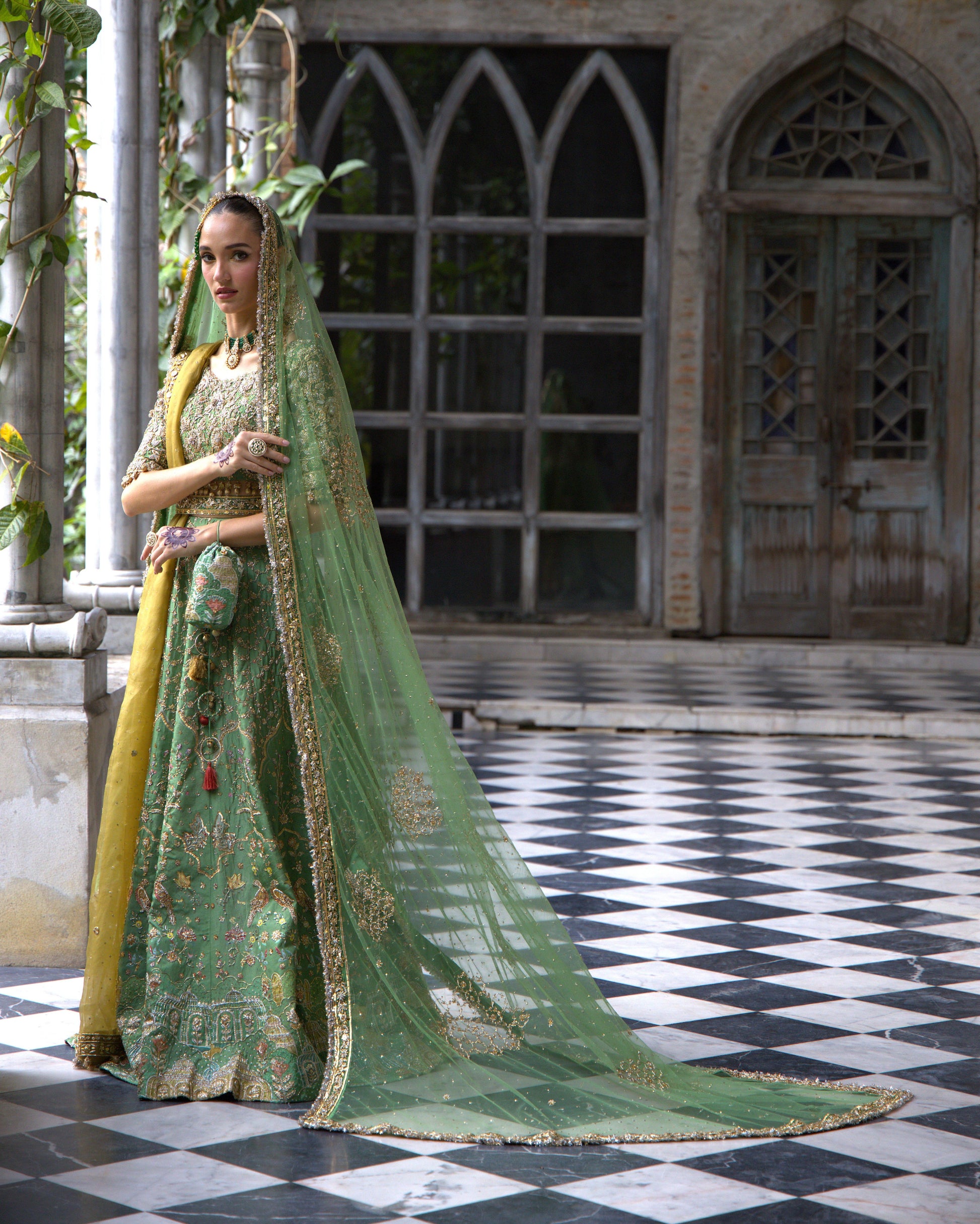 A regal ode to tradition, this fern green bridal set in raw silk is adorned with intricate gota, resham, and zari embroidery.