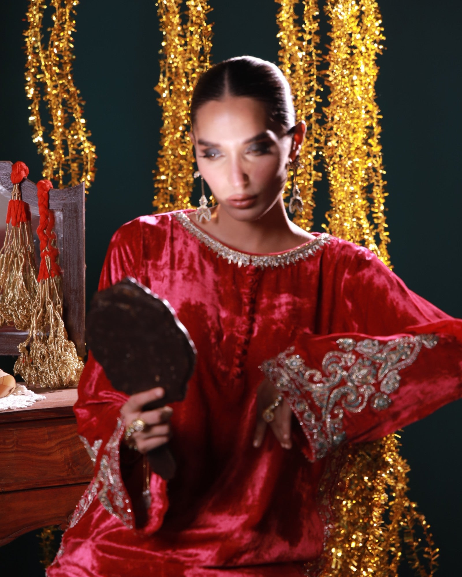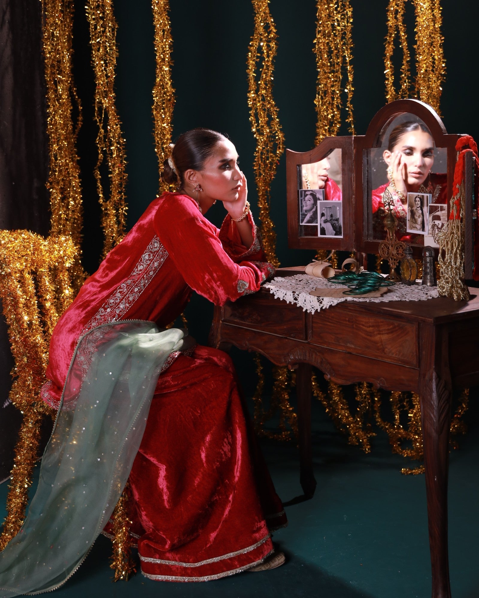 Jahanara is a striking red velvet ensemble designed with timeless elegance in mind. The rich tone is elevated by intricate gold embroidery and paired with a soft mint dupatta for a royal contrast. From winter weddings to intimate mehfils, this look channels grandeur with grace.