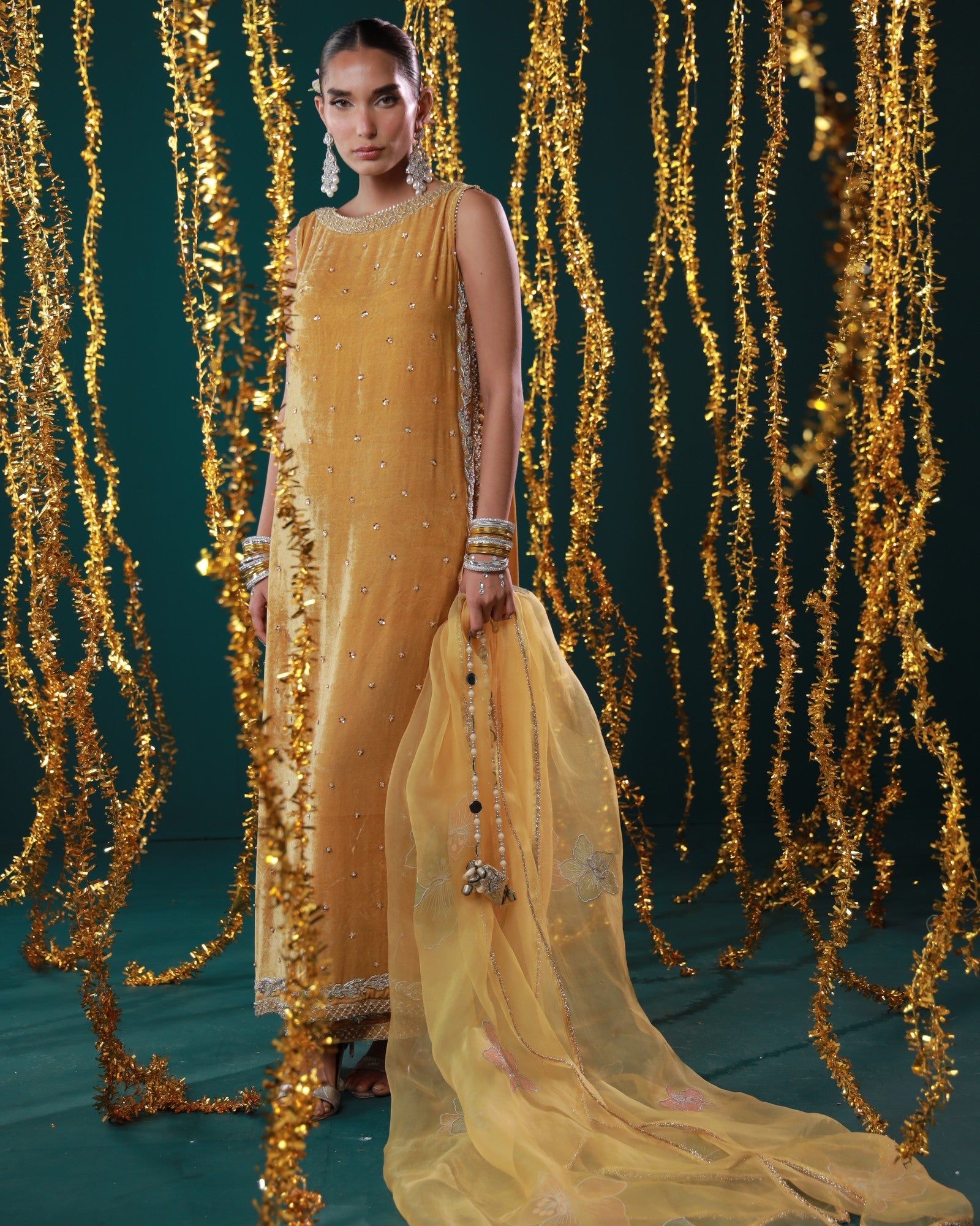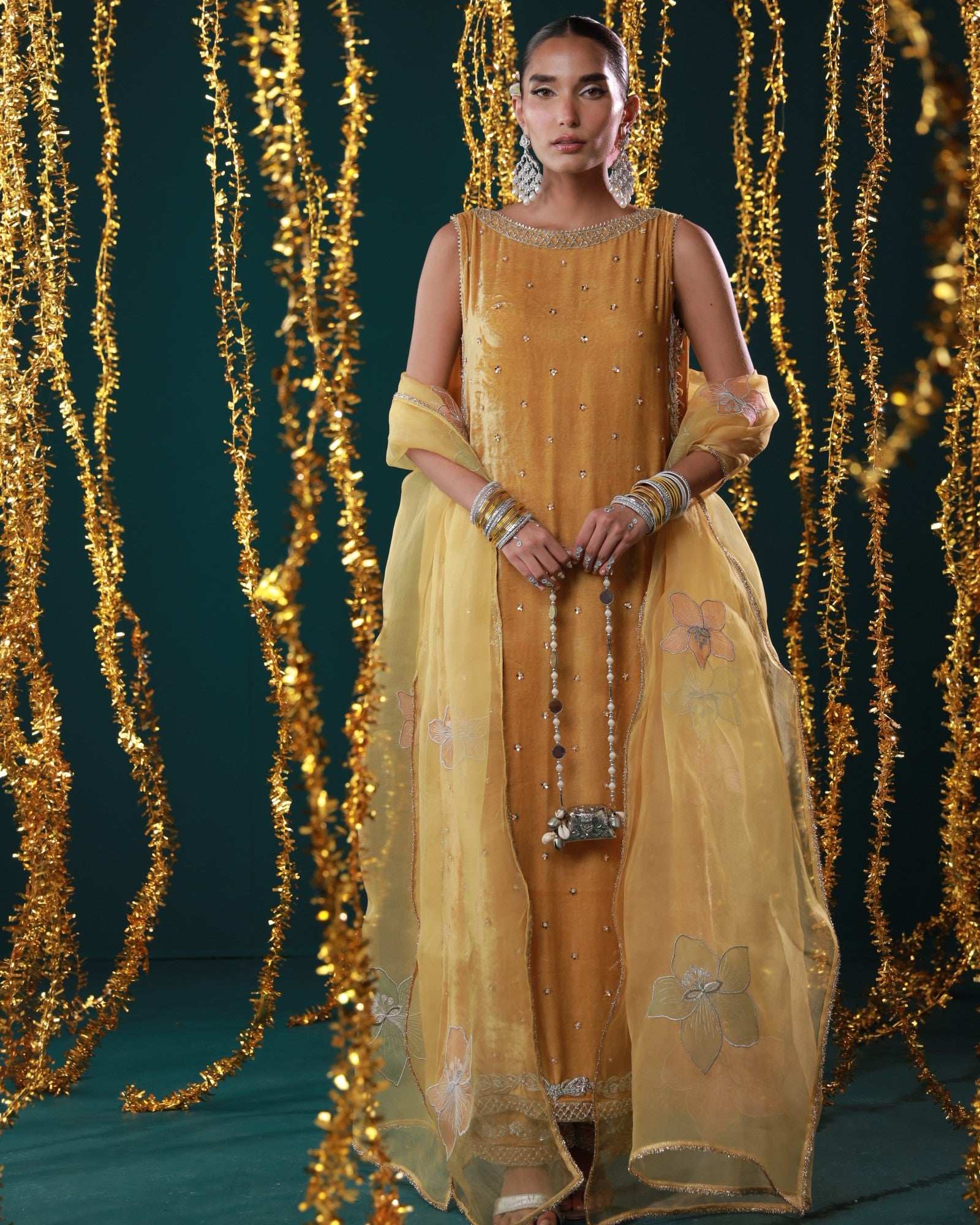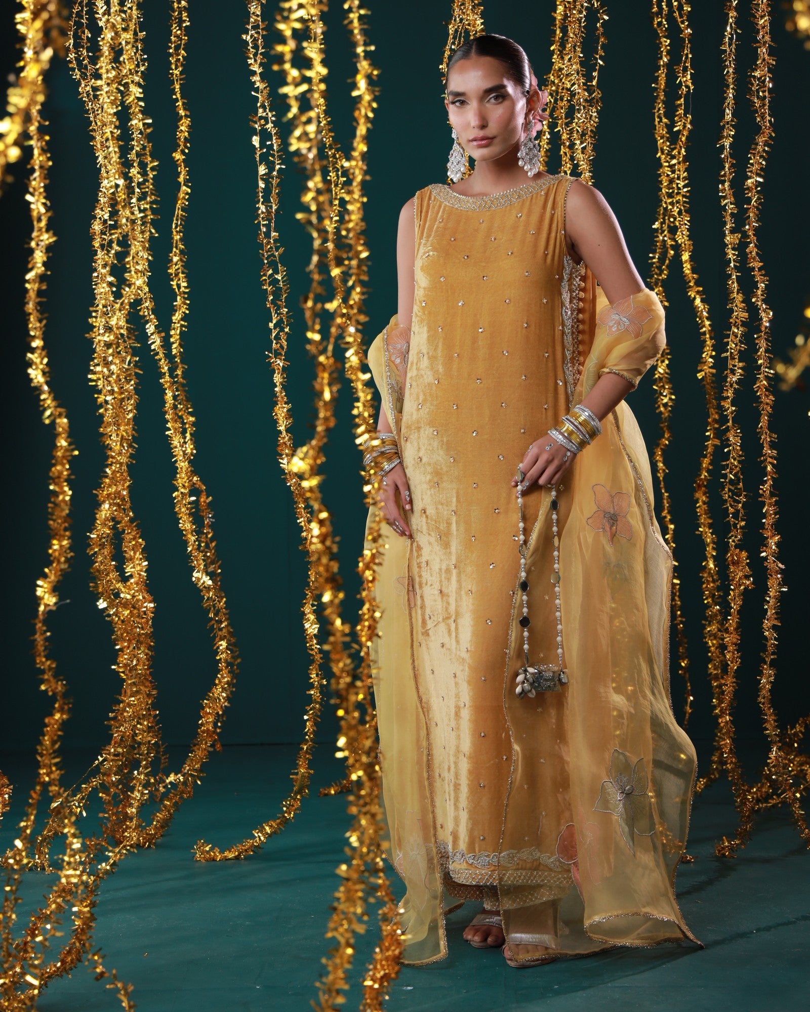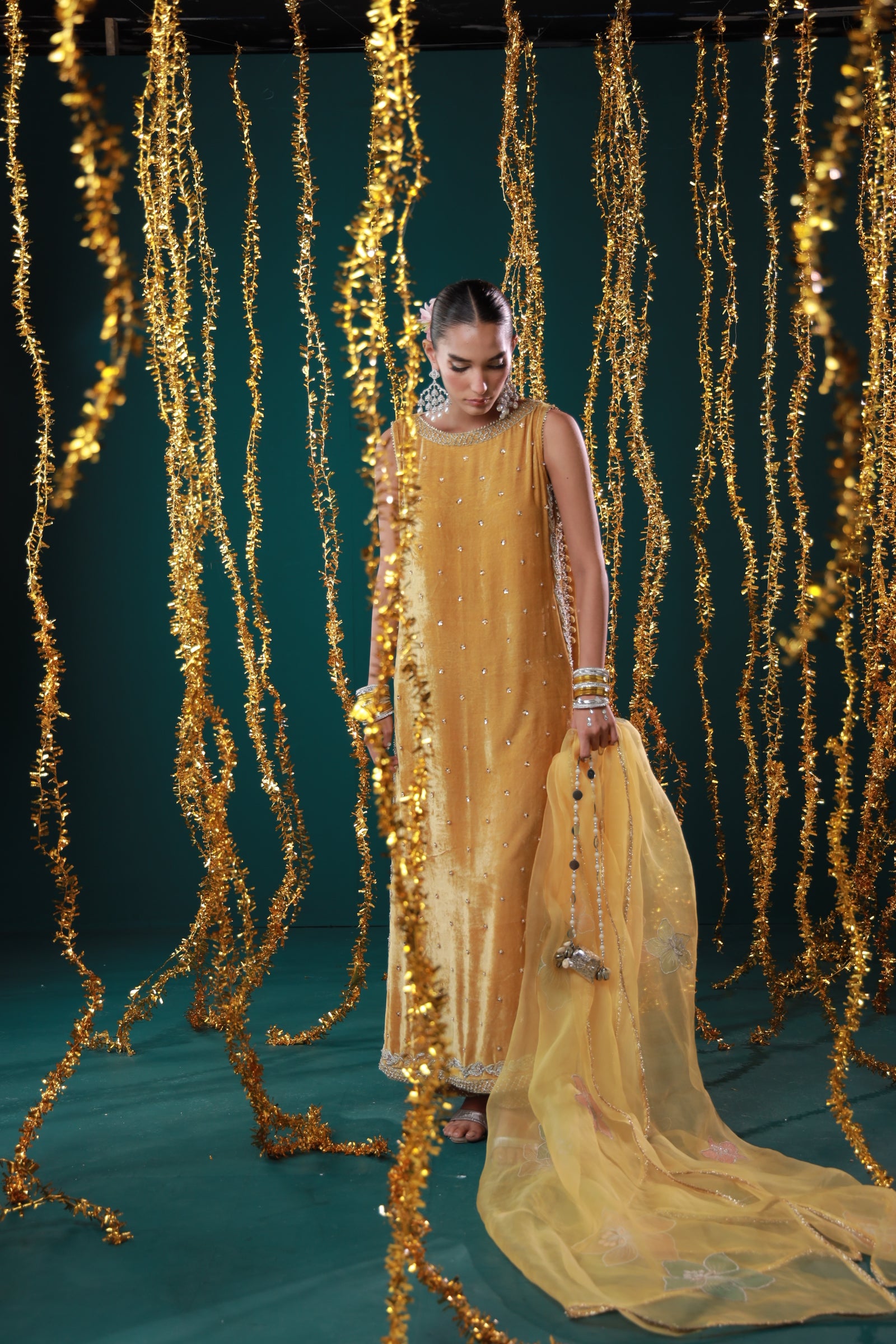 Mehtab is a luminous yellow velvet creation that captures the warmth of celebration and the softness of moonlight. Embellished with delicate work and paired with a breezy embroidered dupatta, this design brings an effortless glow to mehndis, daytime dholkis, and festive winter gatherings.