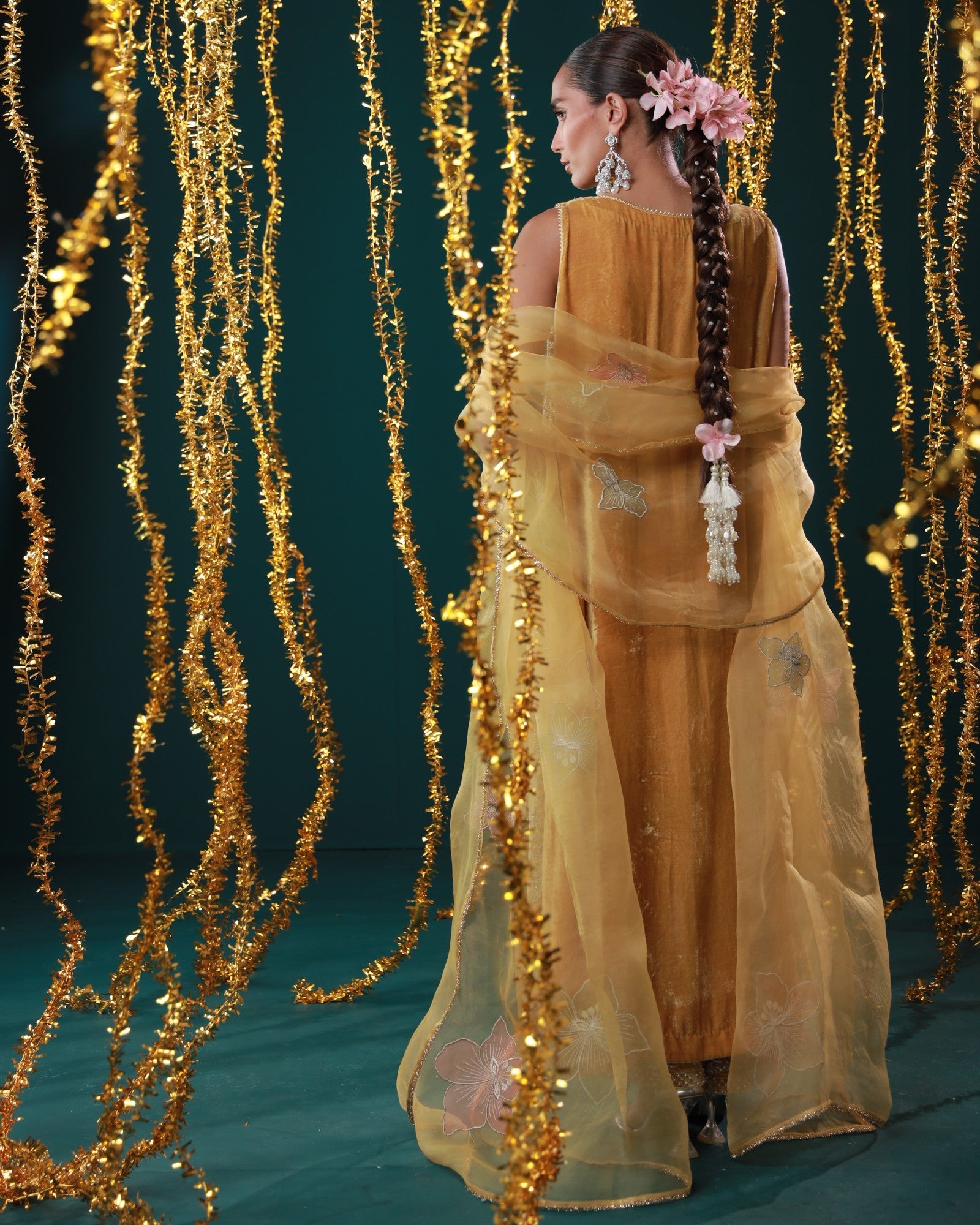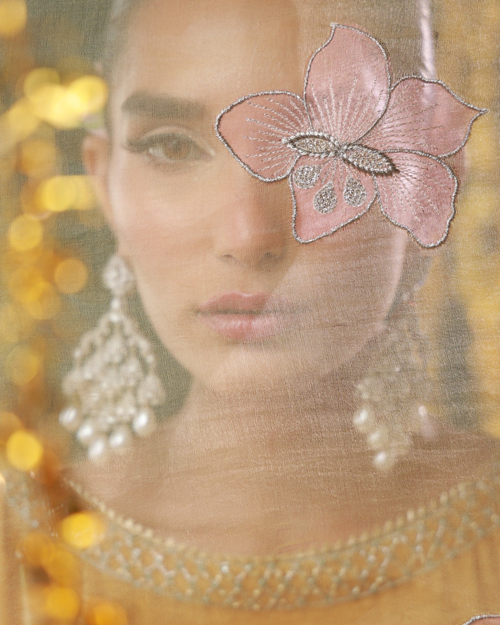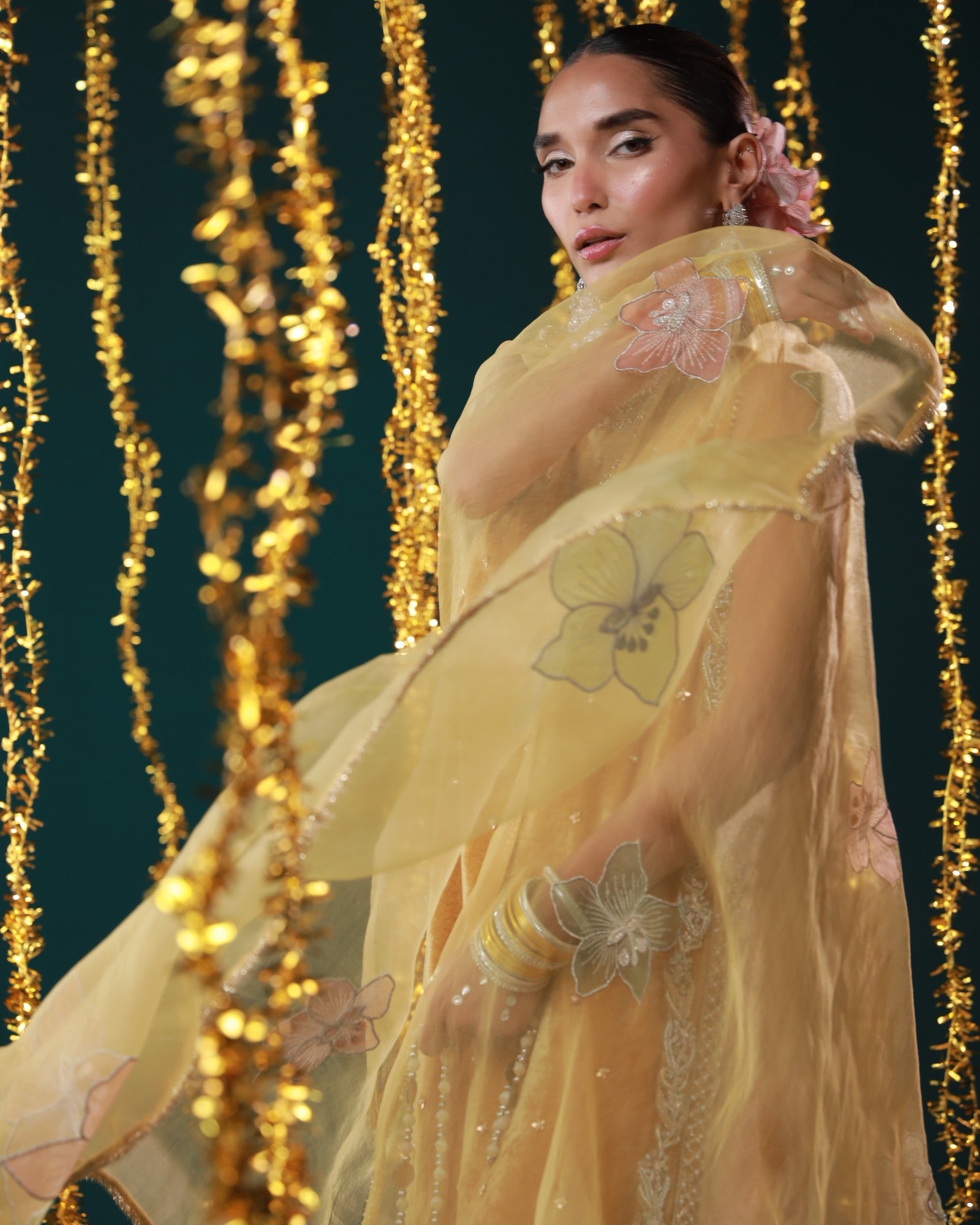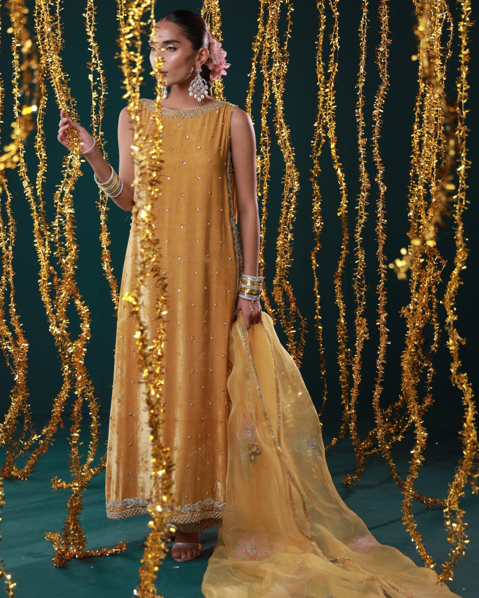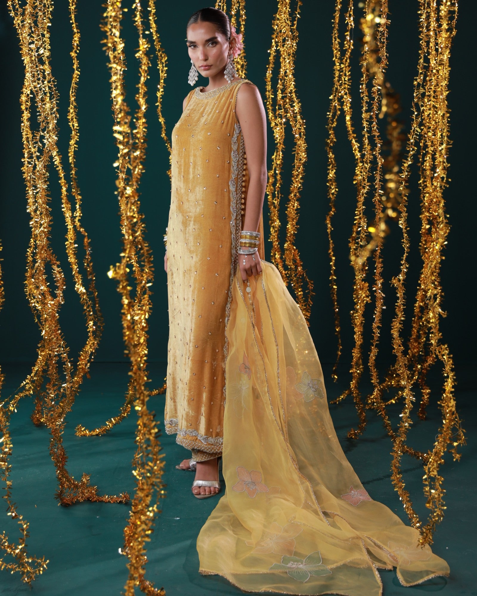 Mehtab is a luminous yellow velvet creation that captures the warmth of celebration and the softness of moonlight. Embellished with delicate work and paired with a breezy embroidered dupatta, this design brings an effortless glow to mehndis, daytime dholkis, and festive winter gatherings.