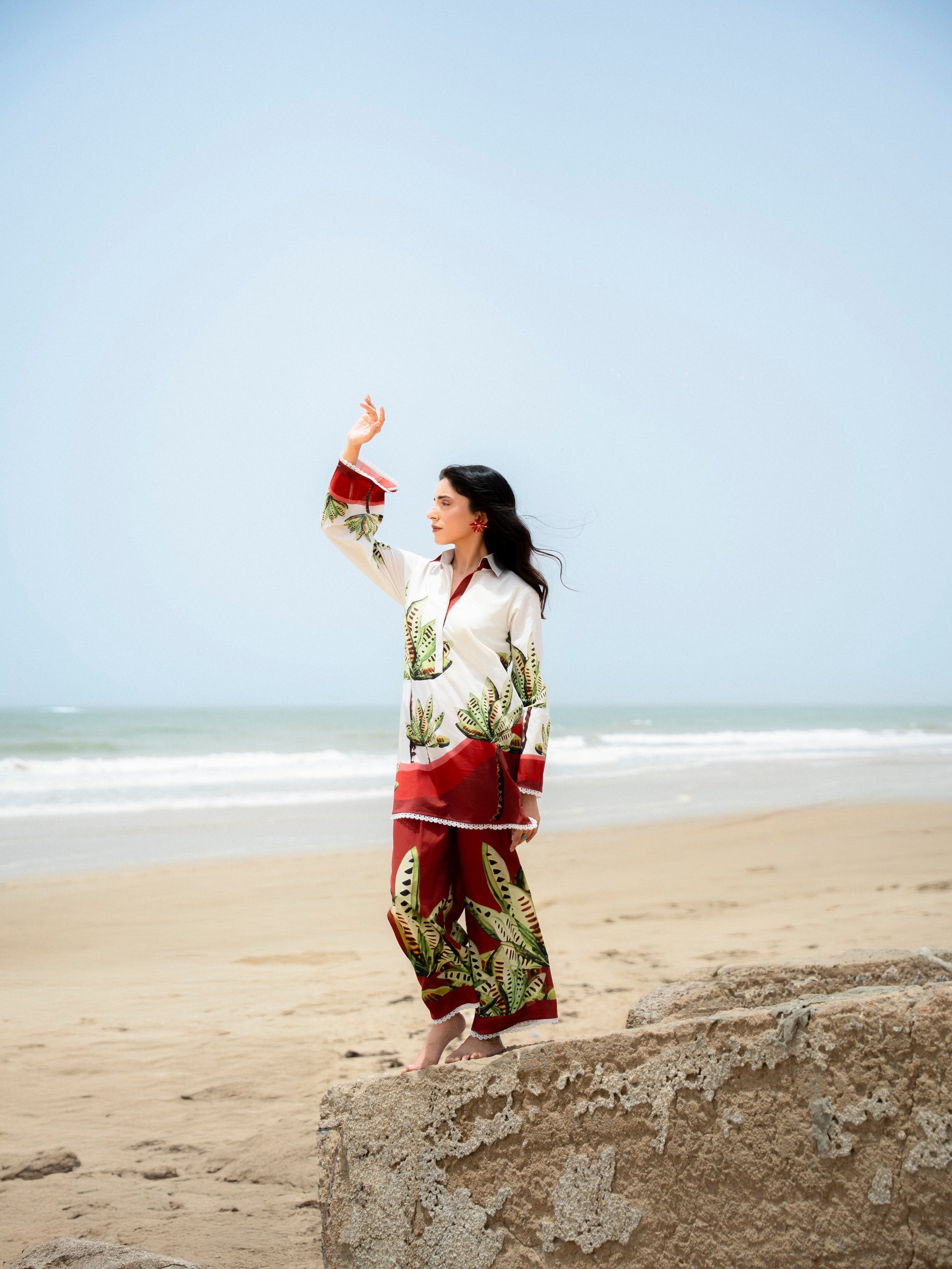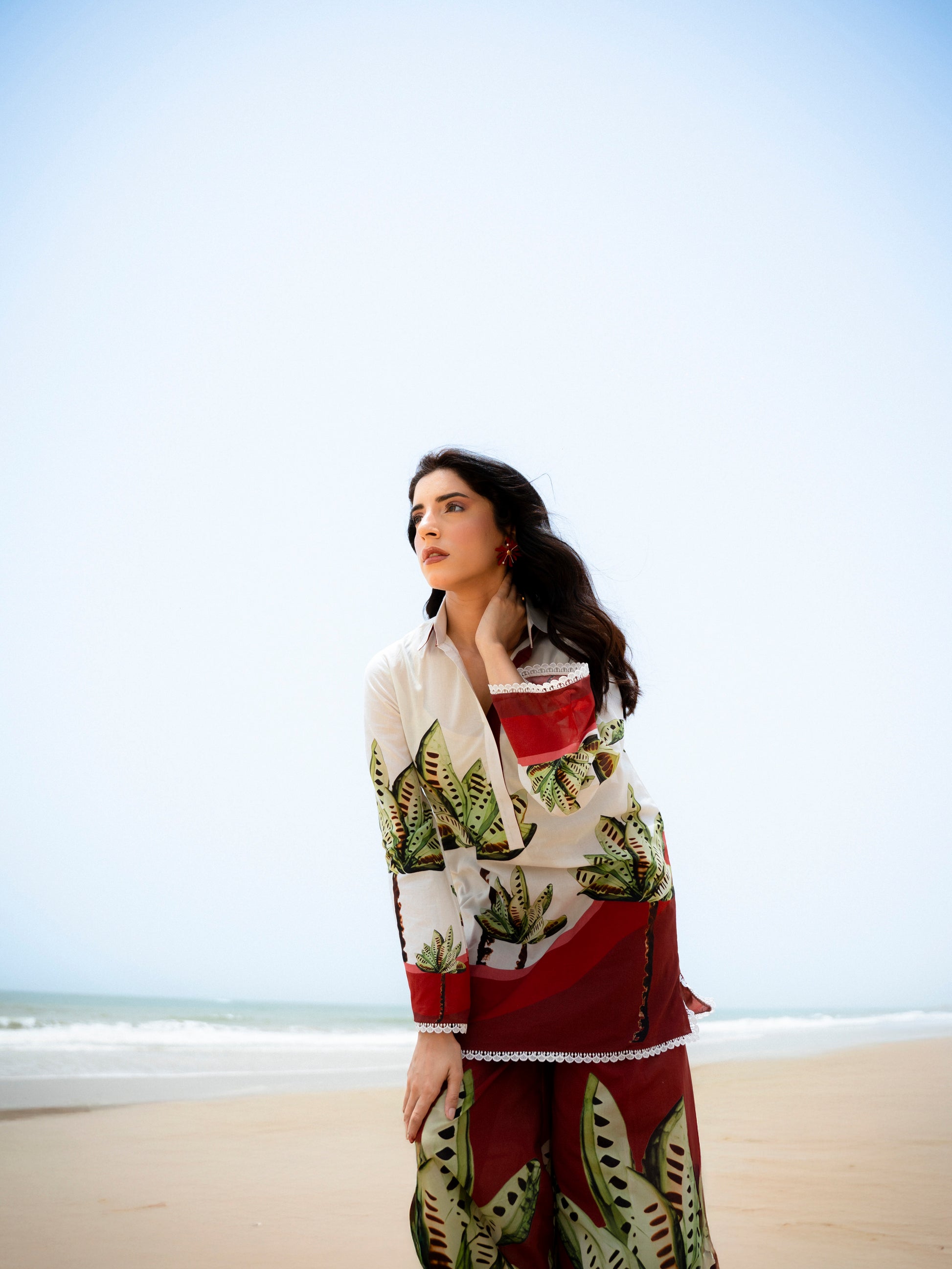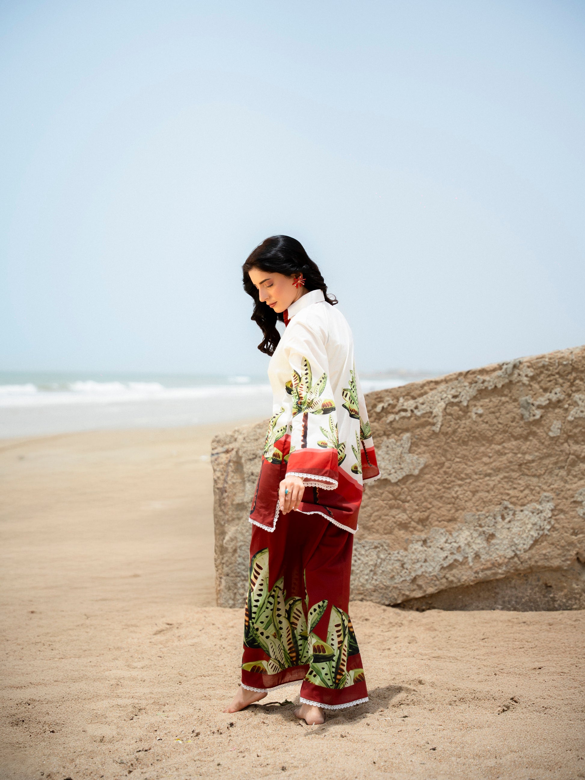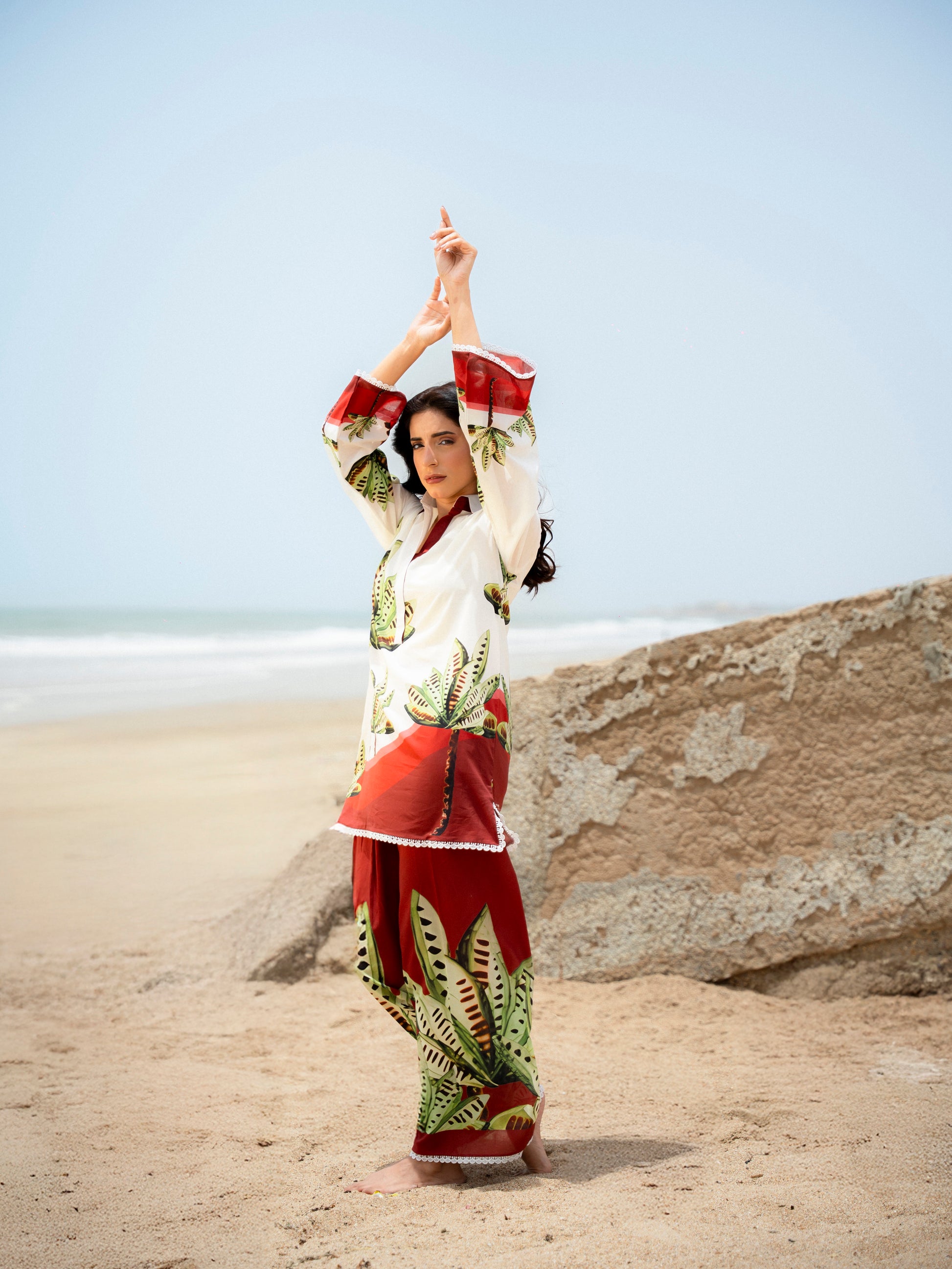 “zafra” is a breezy botanical dream, featuring lush leaf prints on a cream canvas with rich maroon accents. crafted for comfort with a straight silhouette and flared sleeves, this look brings tropical elegance to life. perfect for beach escapes or sunset soirées.