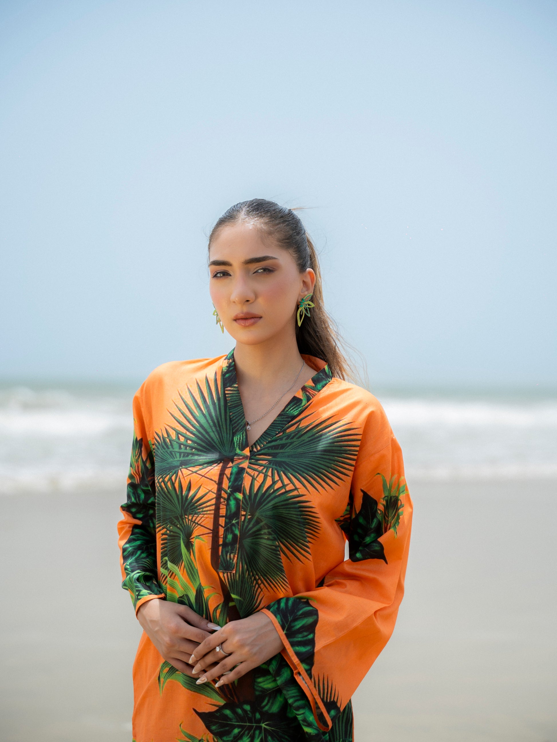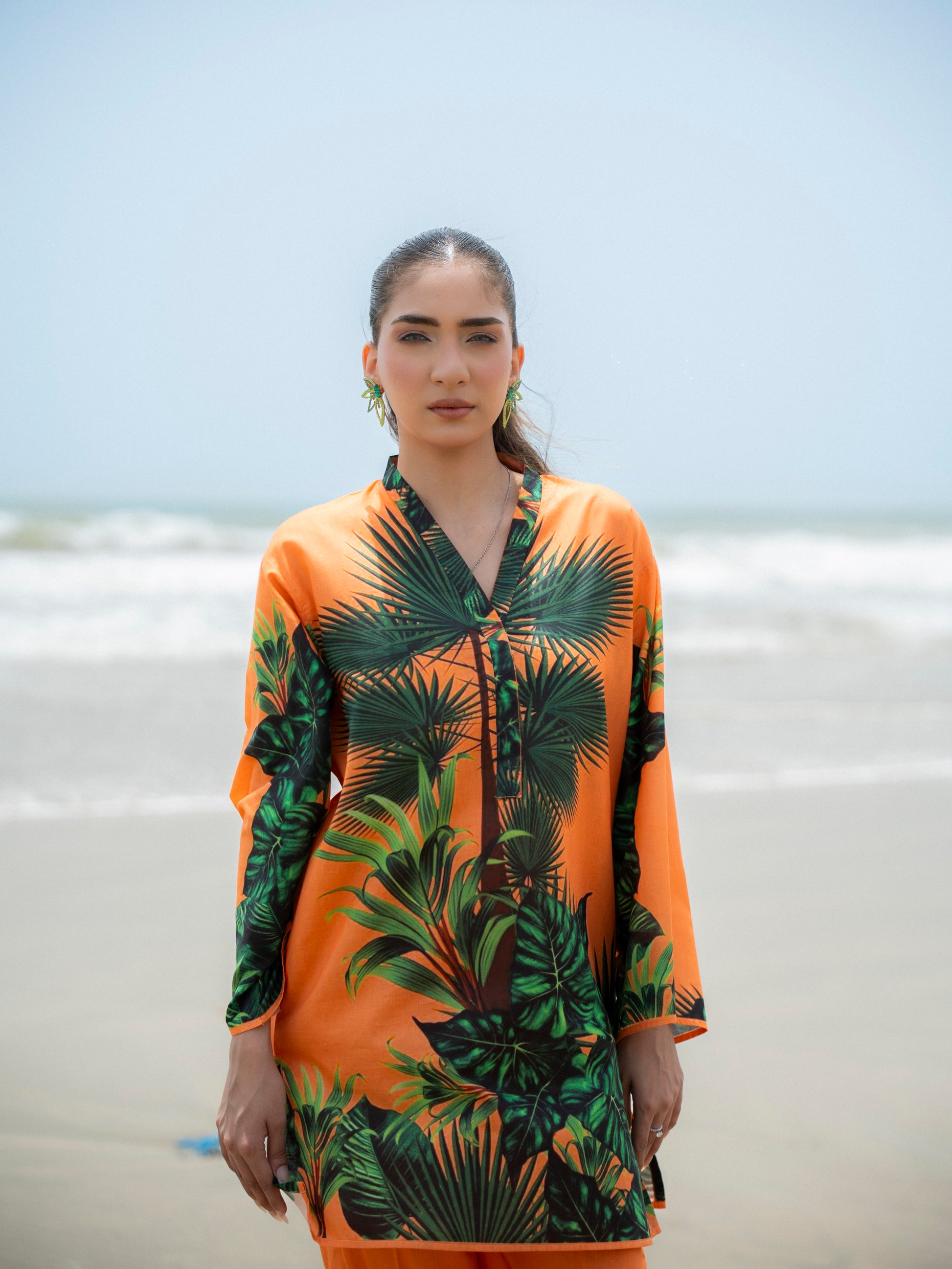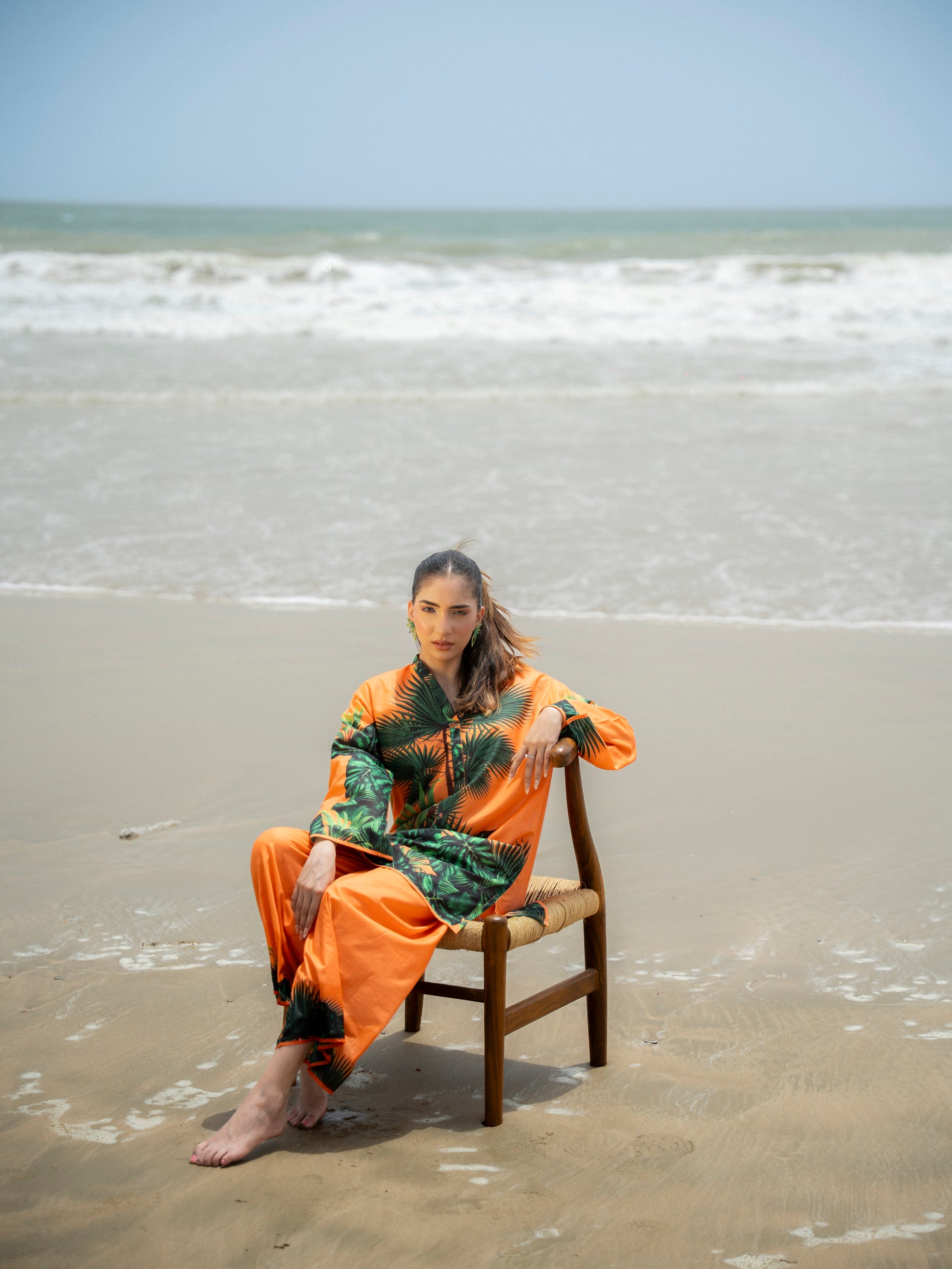 bursting with color and confidence, zesta is a vibrant celebration of summer. the energizing orange base paired with fresh green palm motifs creates a striking look that’s perfect for warm days by the water or sunset evenings out