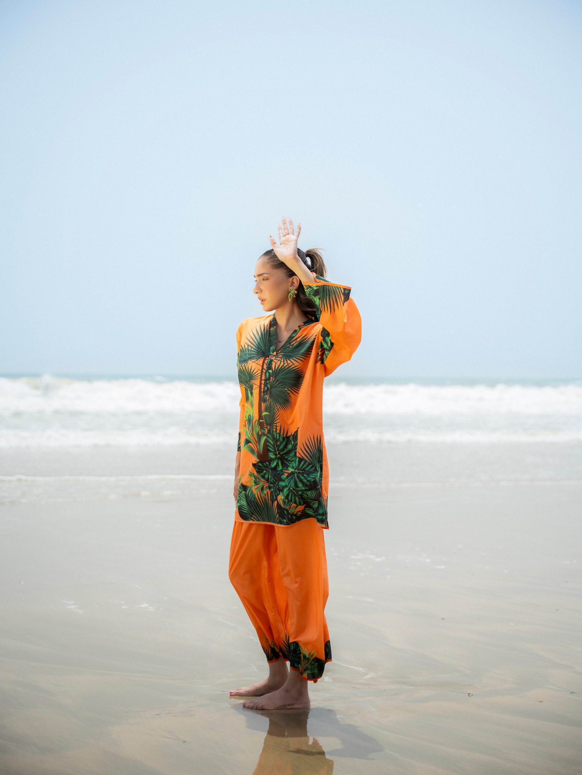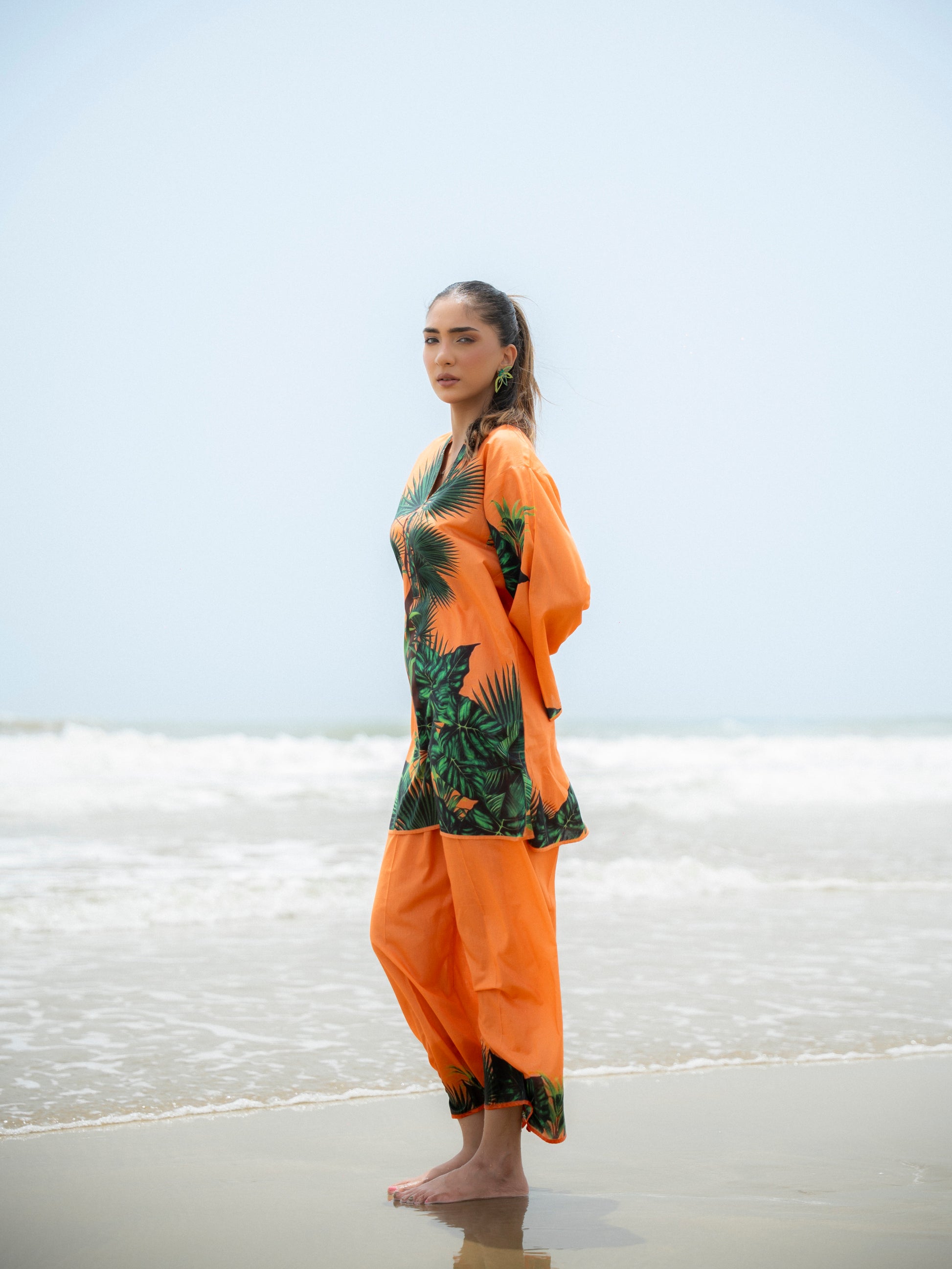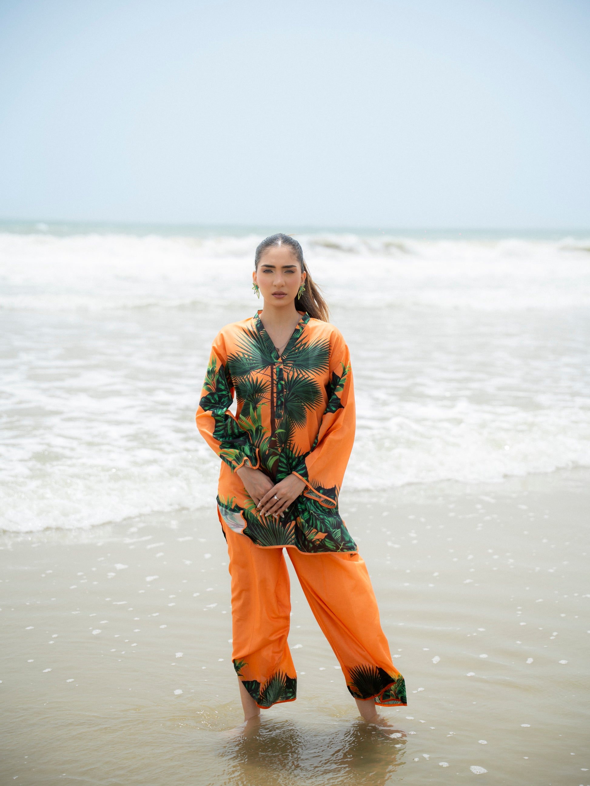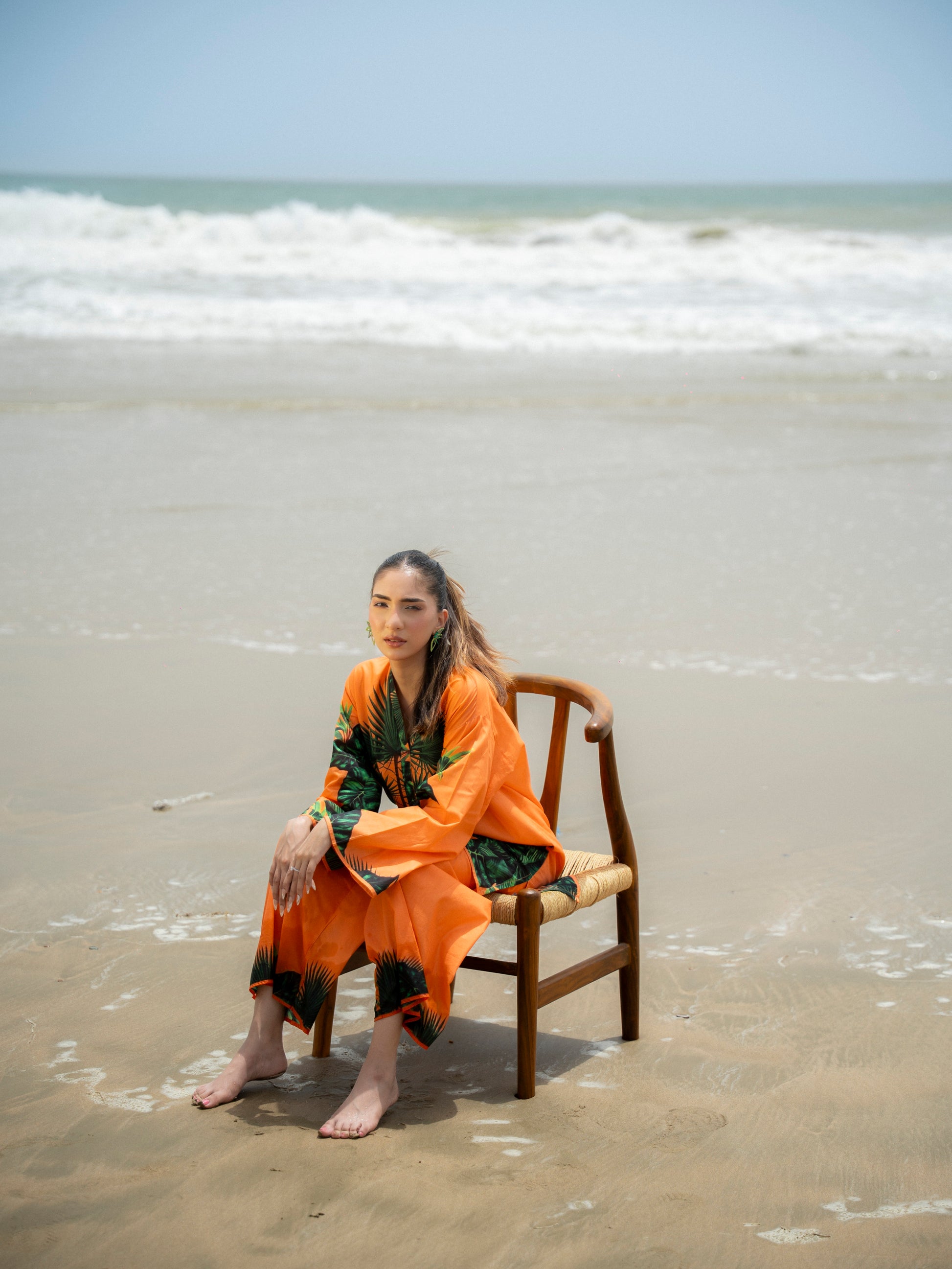 bursting with color and confidence, zesta is a vibrant celebration of summer. the energizing orange base paired with fresh green palm motifs creates a striking look that’s perfect for warm days by the water or sunset evenings out